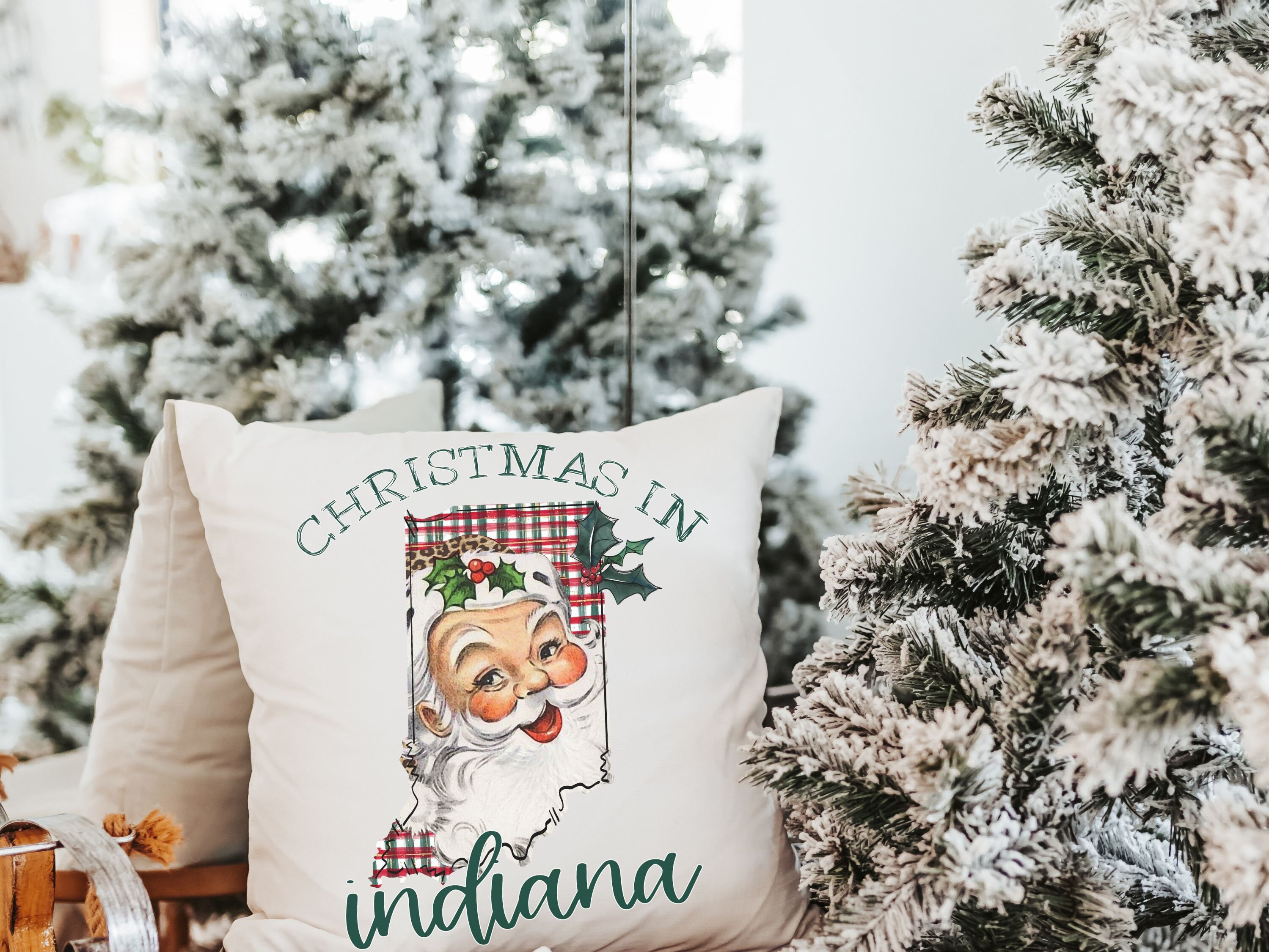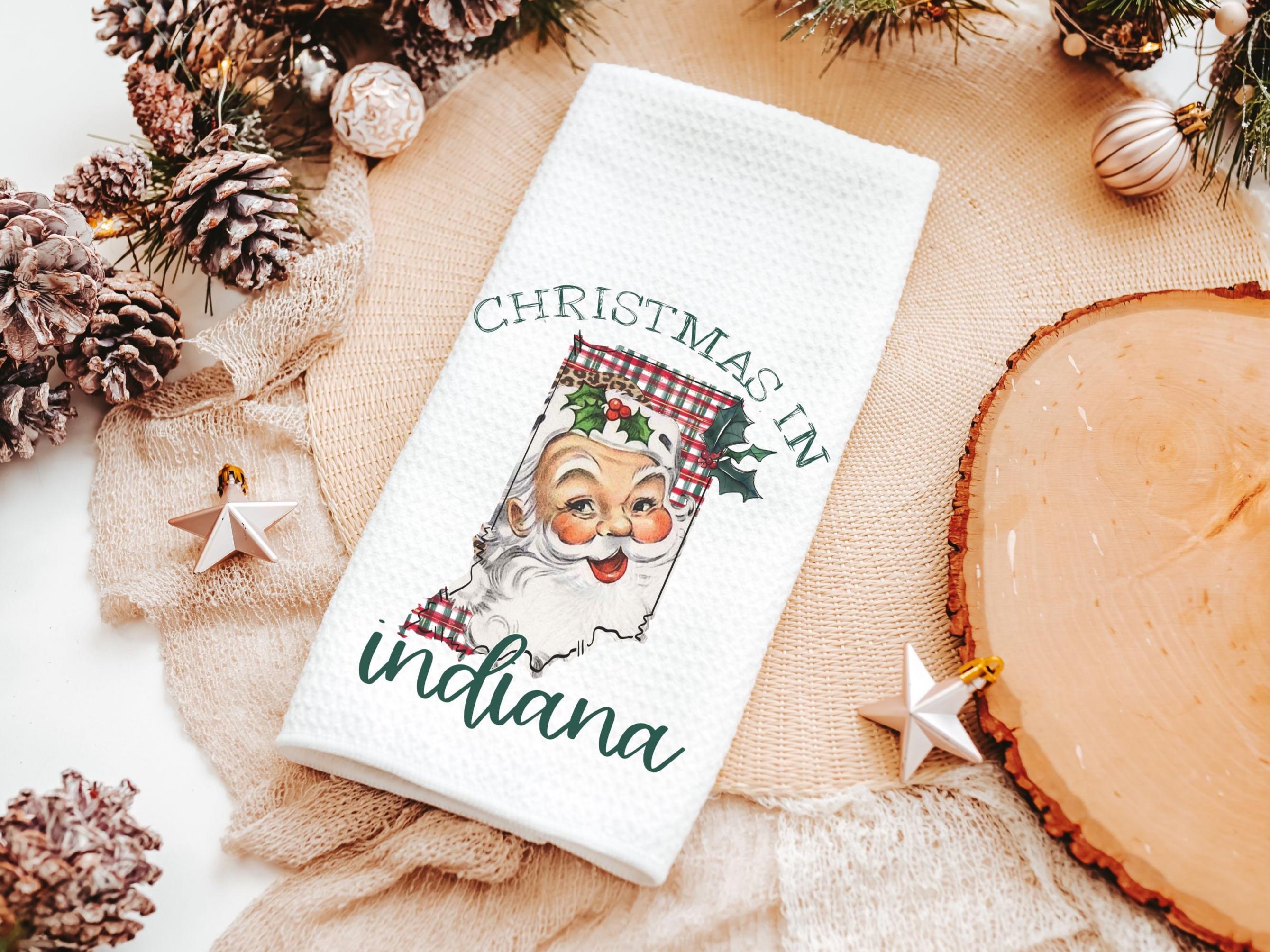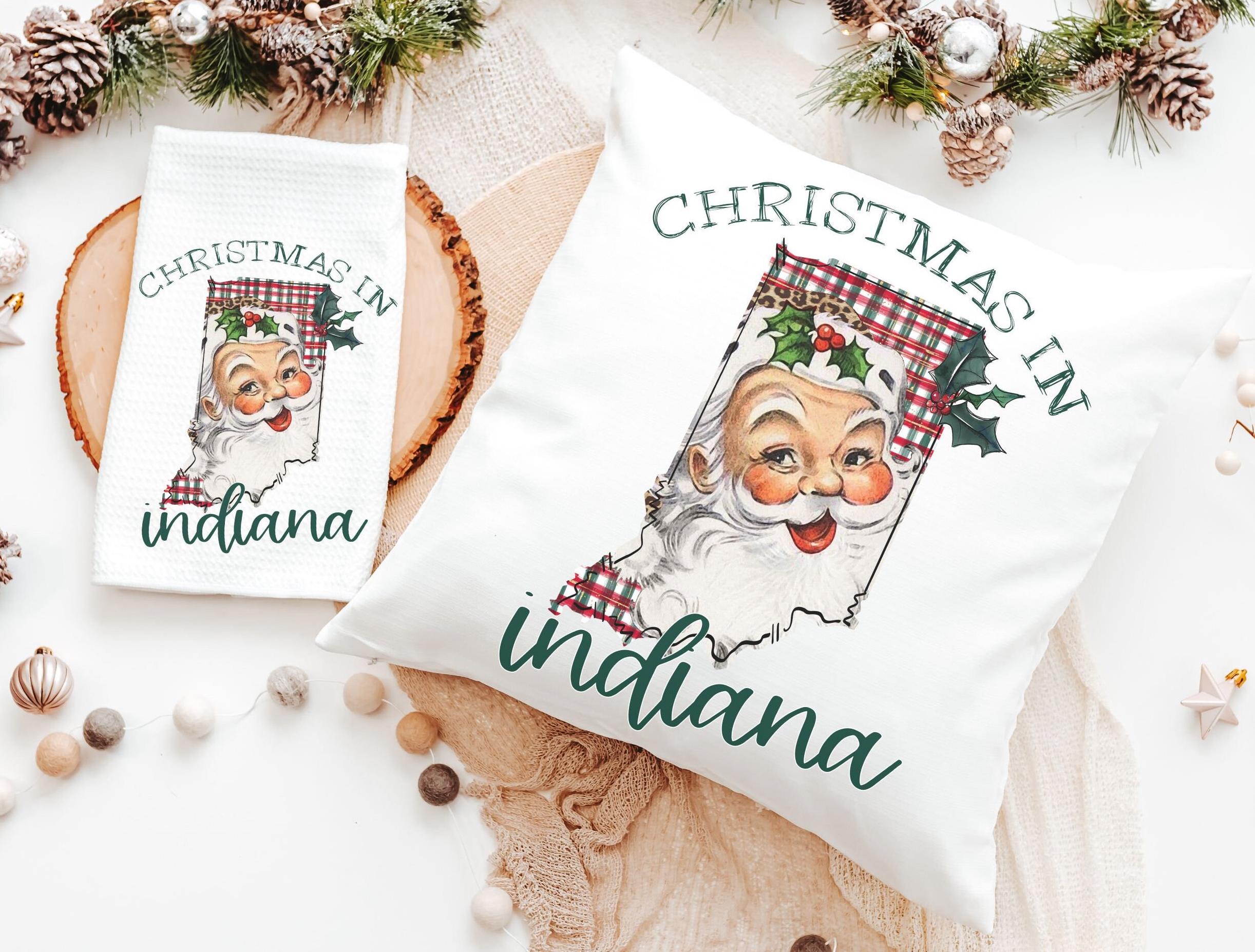 Add state pride to your holiday decor with Santa pillows and matching towels in Indiana Christmas style. Perfect for the couch or kitchen, they make great home decor gifts and thoughtful Christmas surprises for neighbors. Available to purchase as pillows or towels, sold separately or as sets.