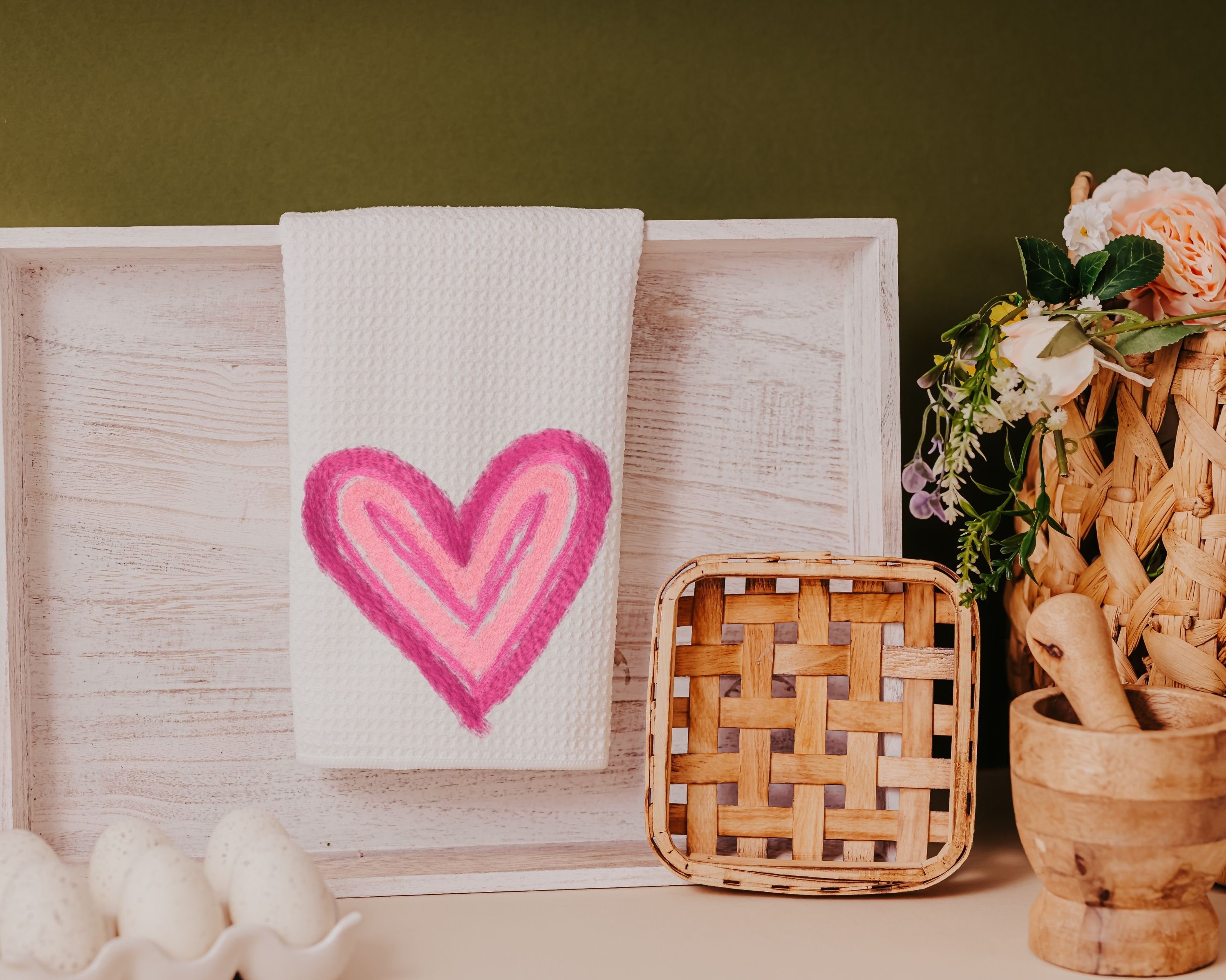faux yarn pink heart kitchen towels, cute Valentines kitchen decor, fun Valentines gifts for friend, knitting gifts for knitters, best gifts