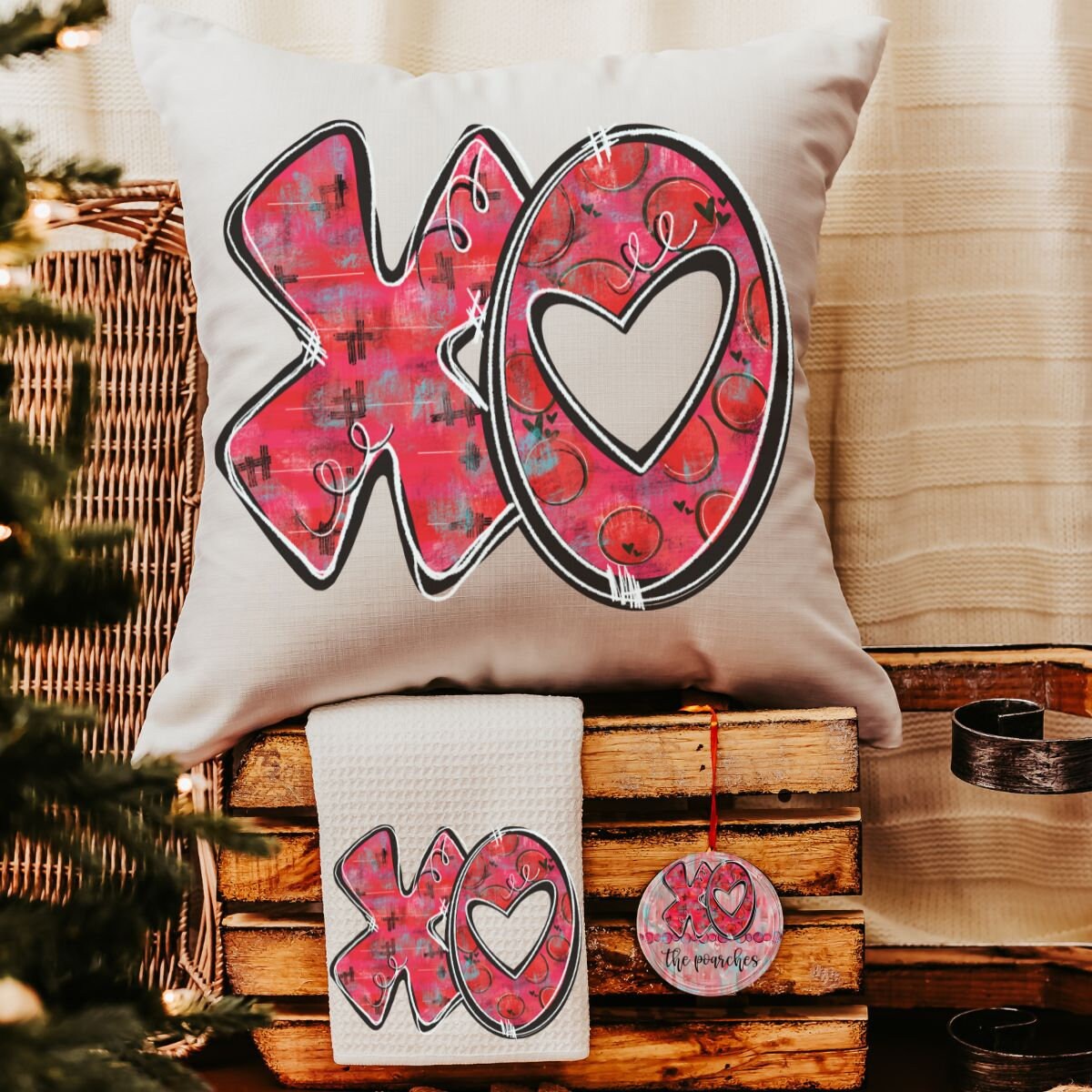 Introducing our XO Valentine throw pillow, perfect for bed or sofa decor. This cute Valentine's Day pillow makes an excellent gift for couples. Complete the set with our charming personalized Valentine ornaments that ads that special touch and is designed for your tree. These ornaments are a thoughtful addition, ideal for wedding gifts. Celebrate Galentine's Day with your friends and add hugs and kisses to your decor. You can also explore our matching kitchen towels. All 3 pieces are available for individual purchase or as a set. Upgrade your Valentine's Day with XO Valentine!