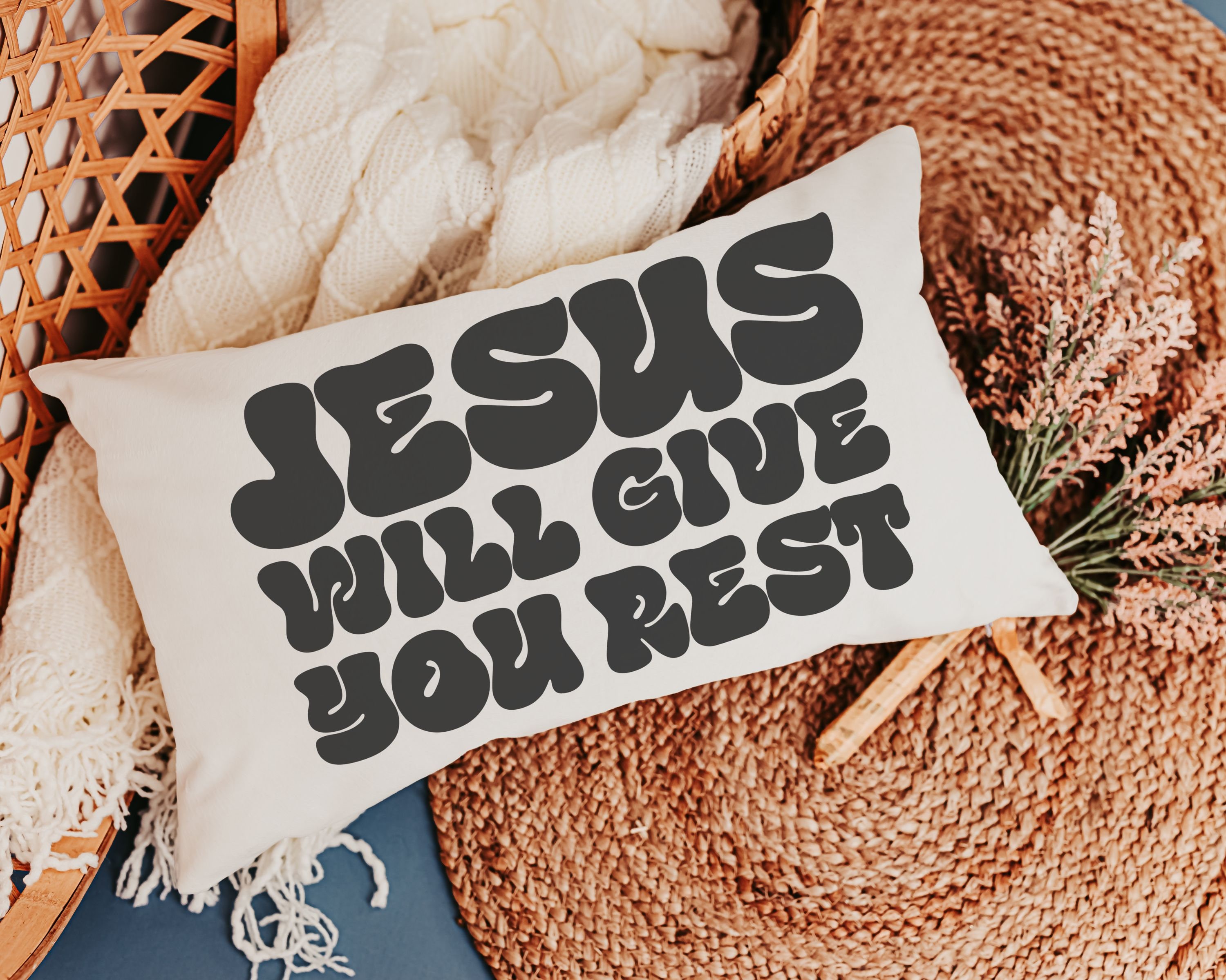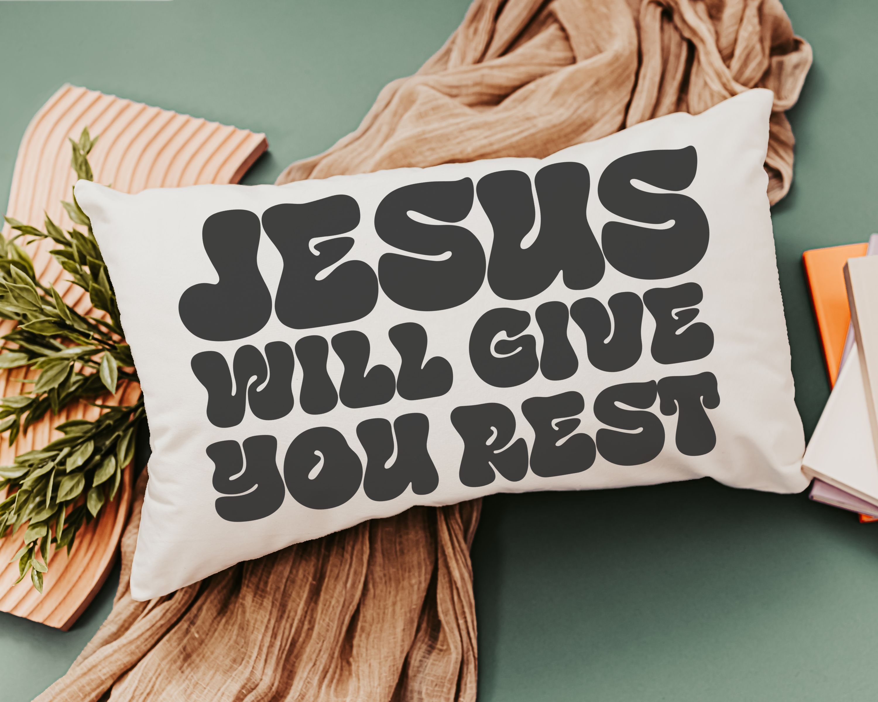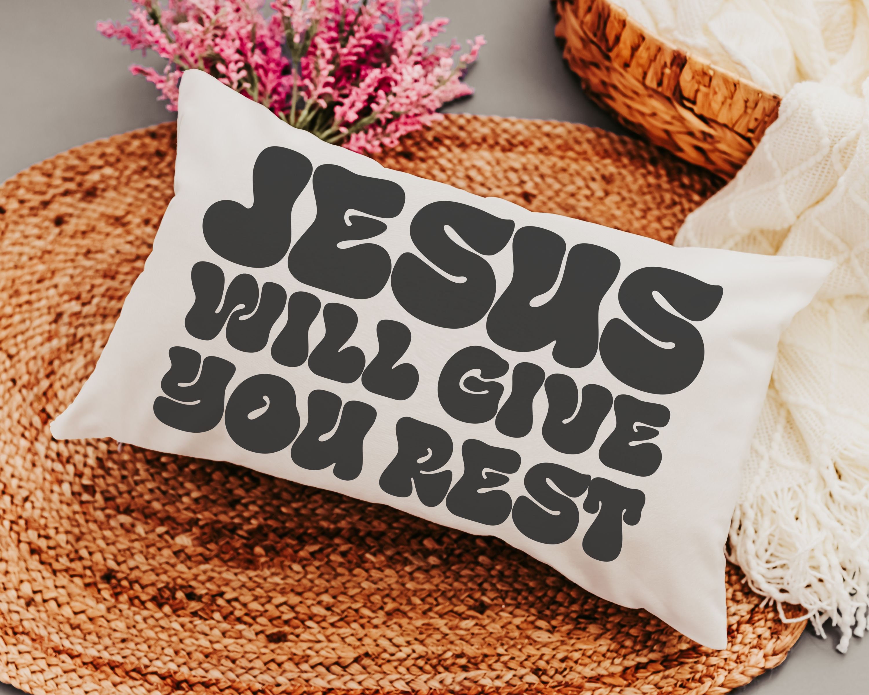 Find comfort in faith with this Matthew 11:28 "Jesus will give you rest" scripture lumbar pillow, a thoughtful encouragement gift for both women and men. Perfect for couches, beds, or reading nooks, this 12x20 accent pillow brings a meaningful touch to any space. A heartfelt Christian gift for best friends, family, or anyone needing a reminder of rest and peace.