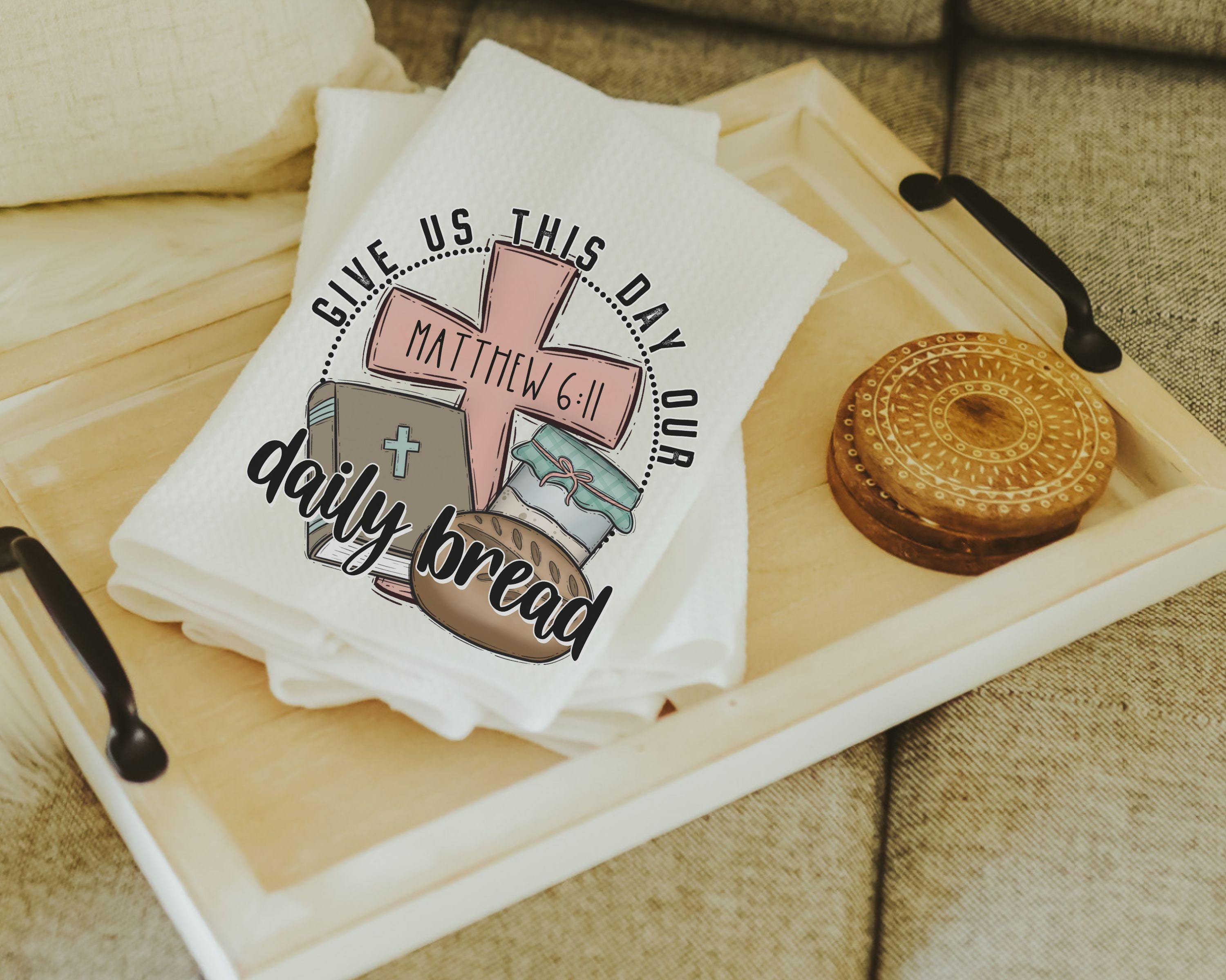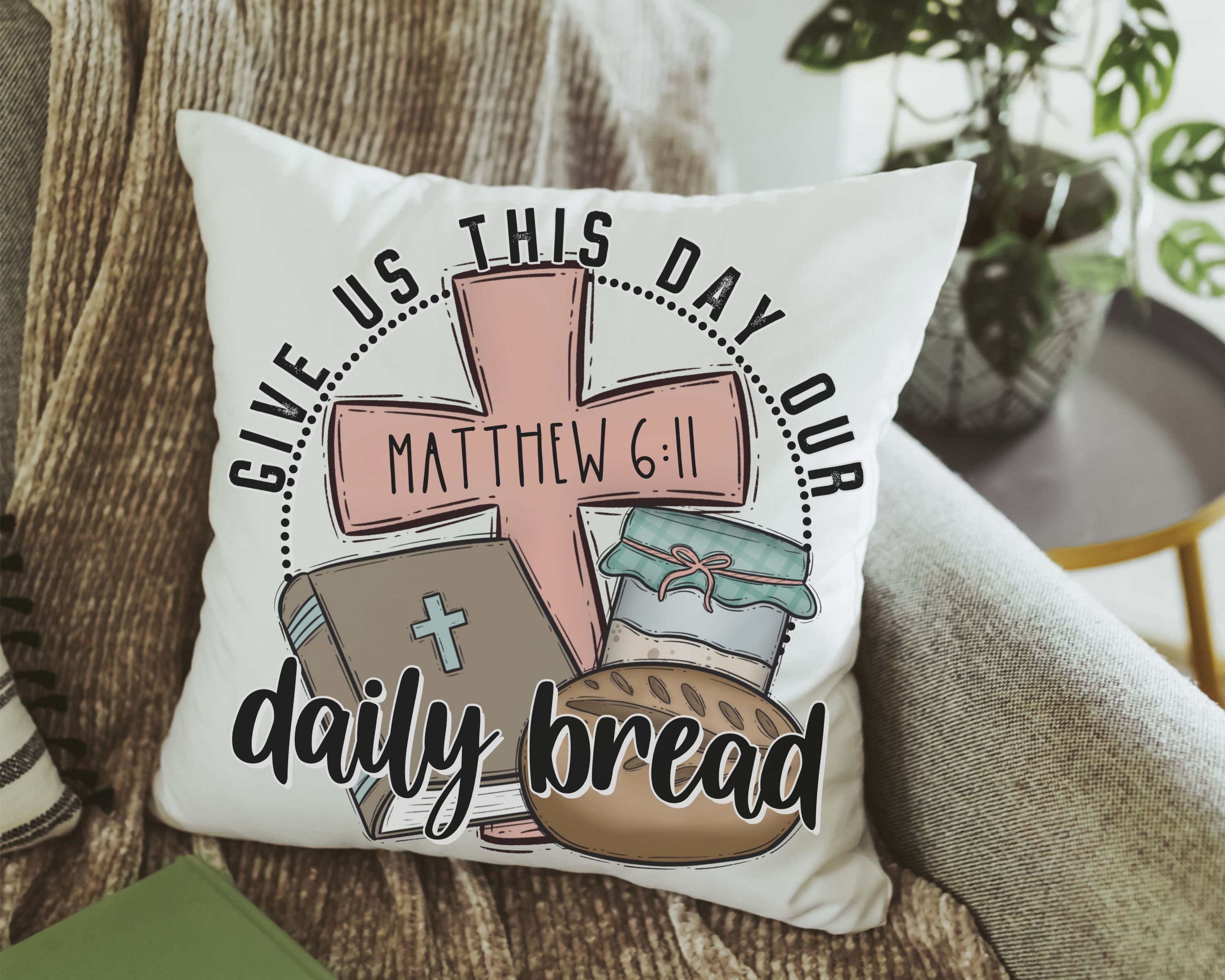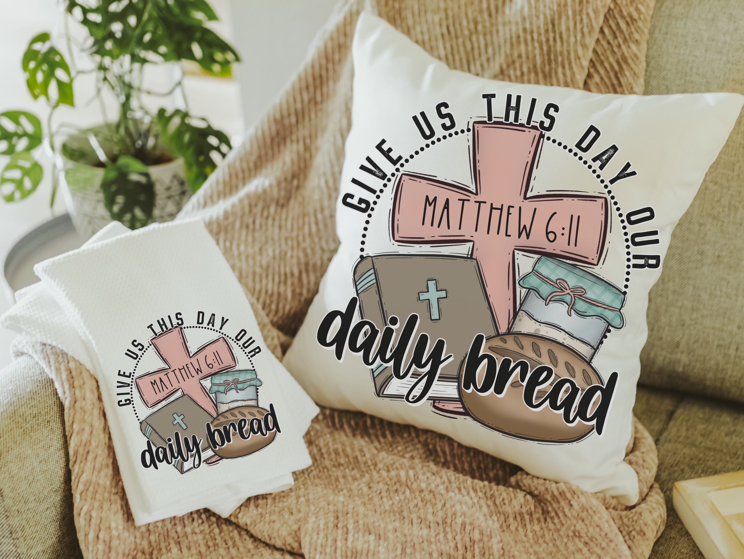 give us this day our daily bread Christian throw pillows for bed, the Lords prayer bread baking gifts for women, Bible verse kitchen towels