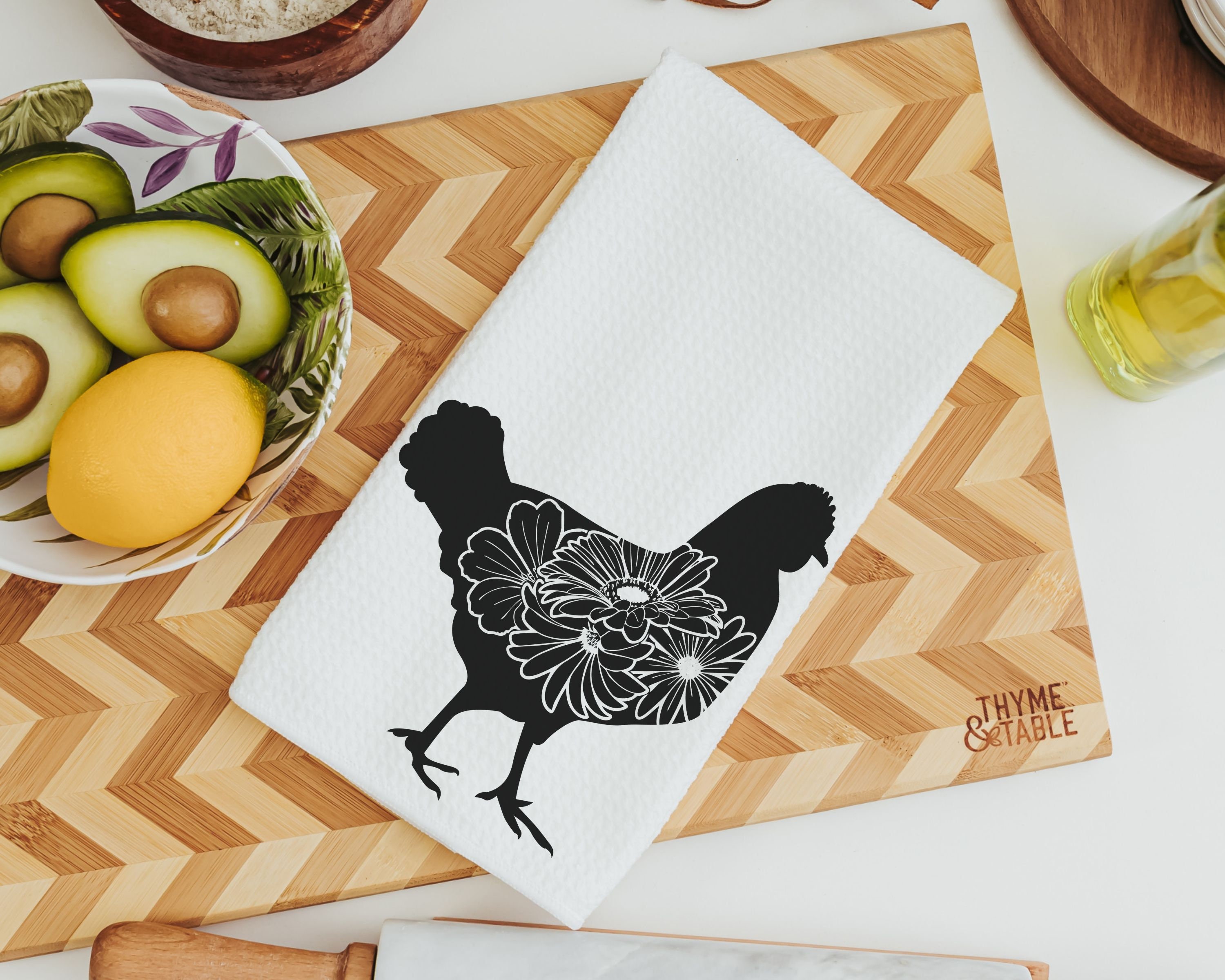 floral chicken kitchen towels for Spring, black and white farmhouse kitchen decor, cute chicken gifts for women, chicken mom gift, flower