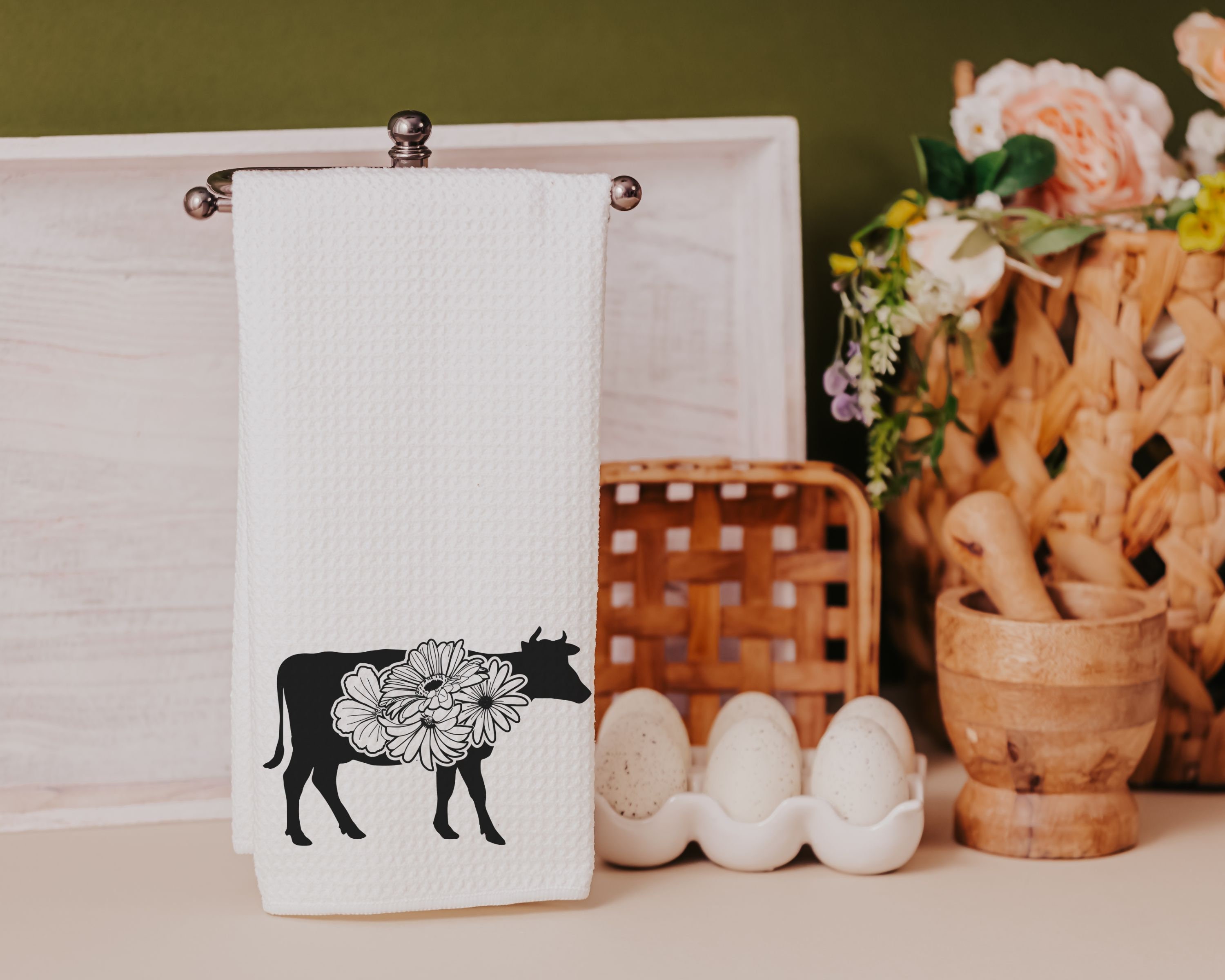 floral cow kitchen towels for Spring, black and white farmhouse kitchen decor, cute cow gifts for cow lovers, flower kitchen hand towels for