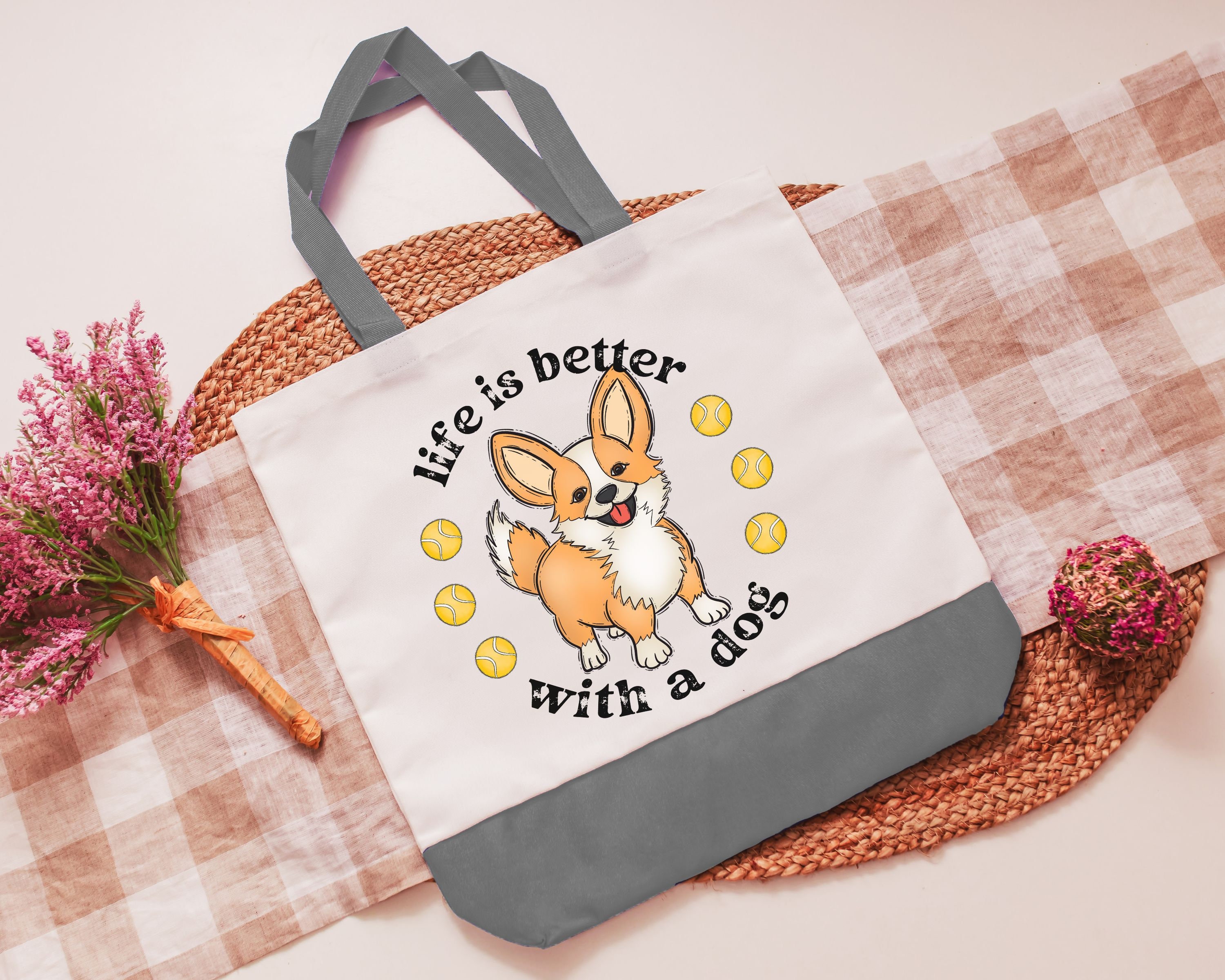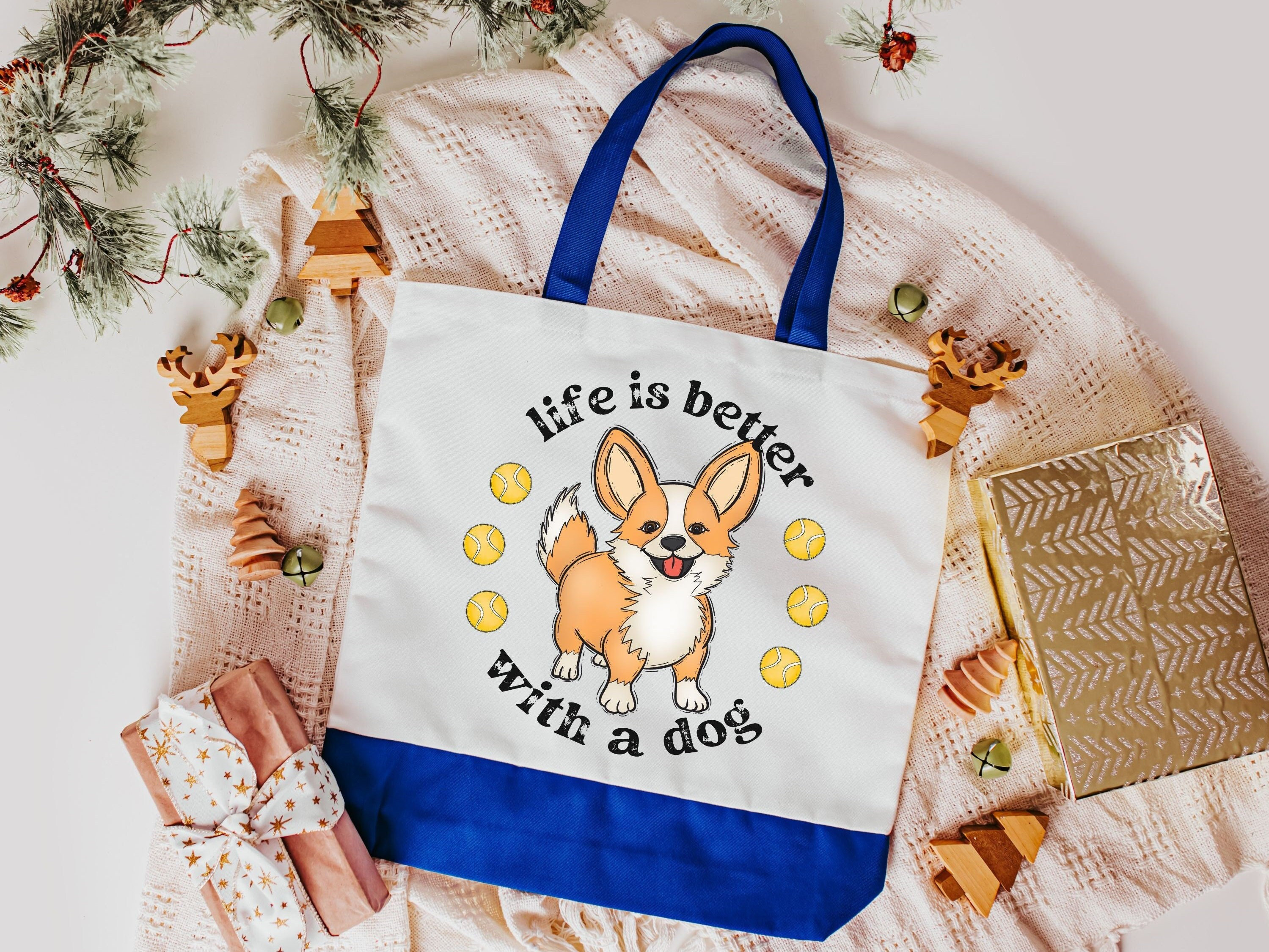 life is better with a dog corgi tote bag for women, cute corgi gifts for corgi lovers, Mothers day gifts for dog mom, corgi mom gifts, eco