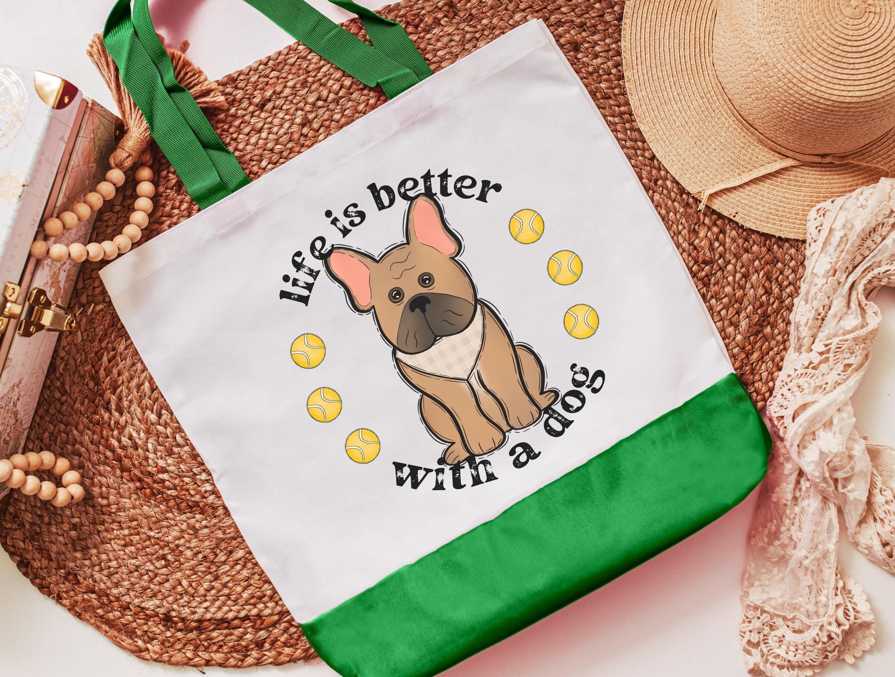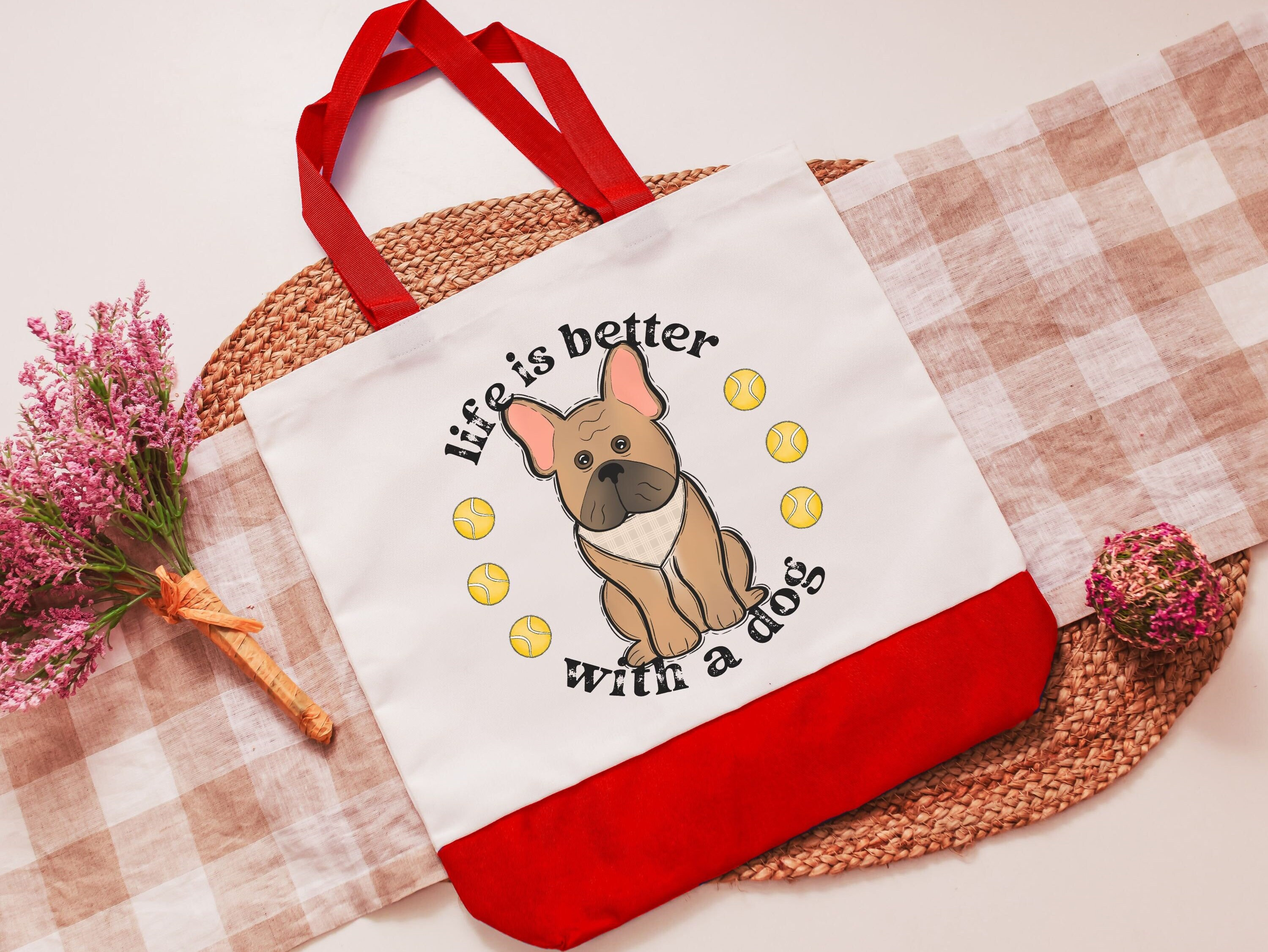 life is better with a dog French bulldog tote bag for books, Frenchie mom French bulldog gift for women, reusable grocery bag cute dog gifts