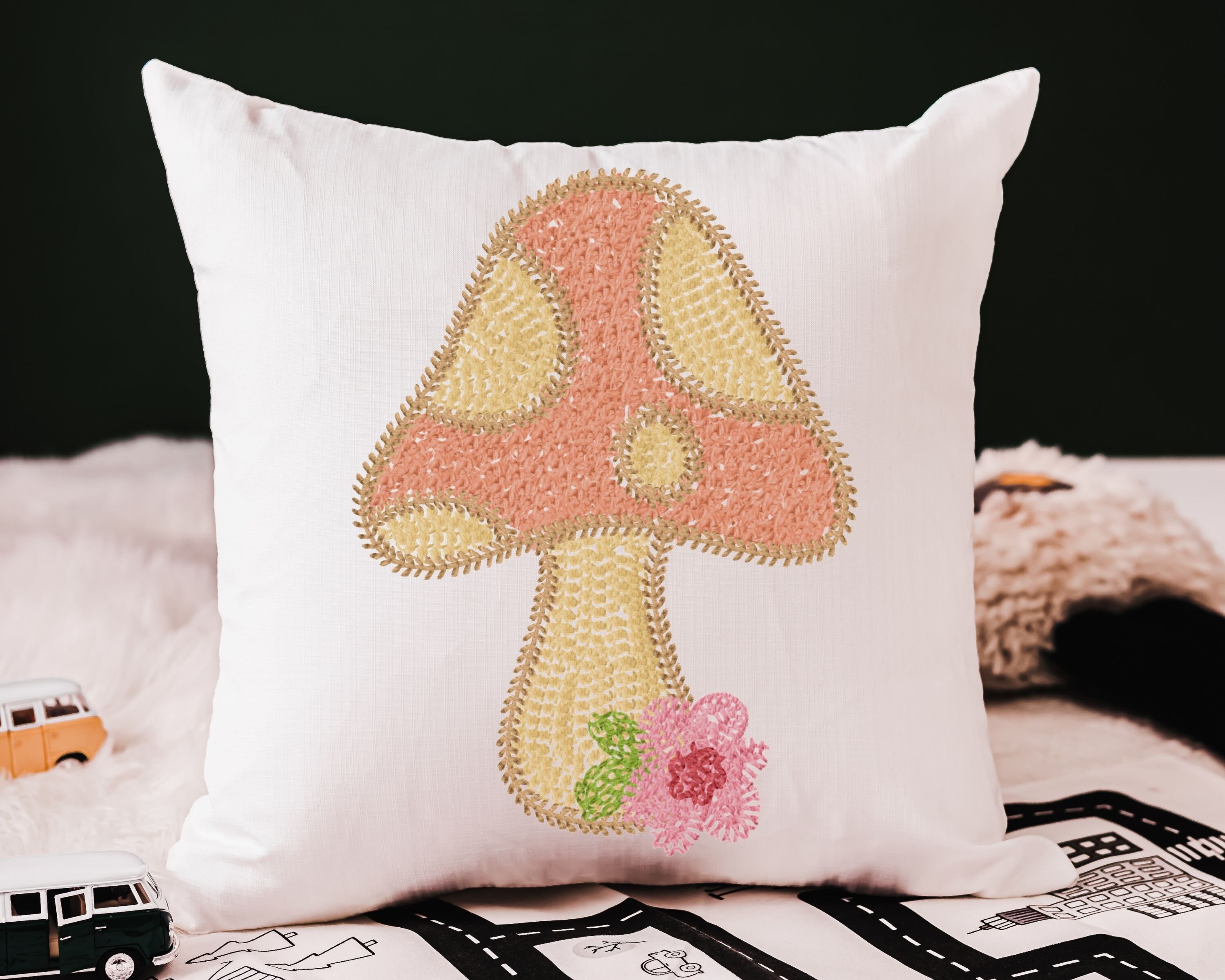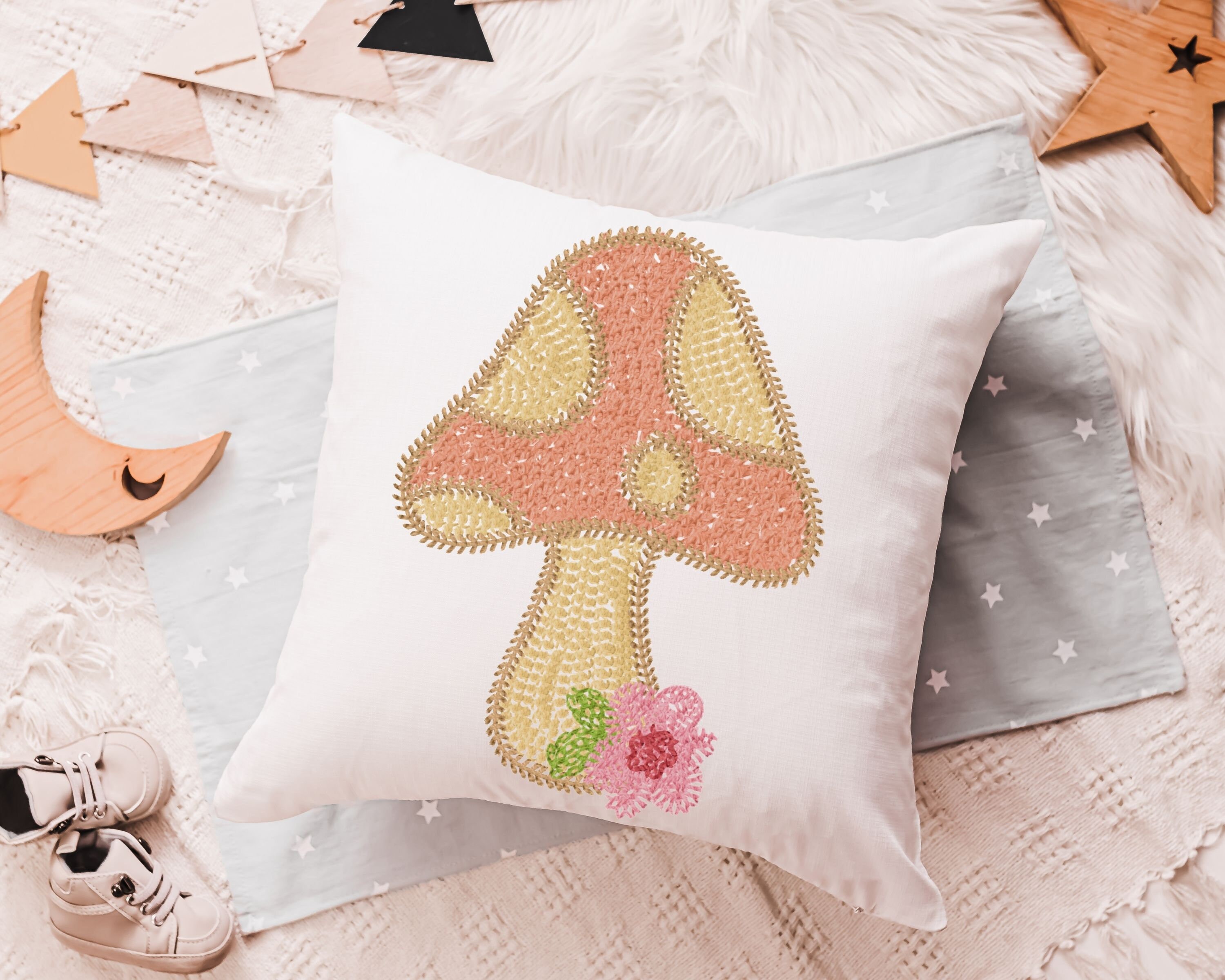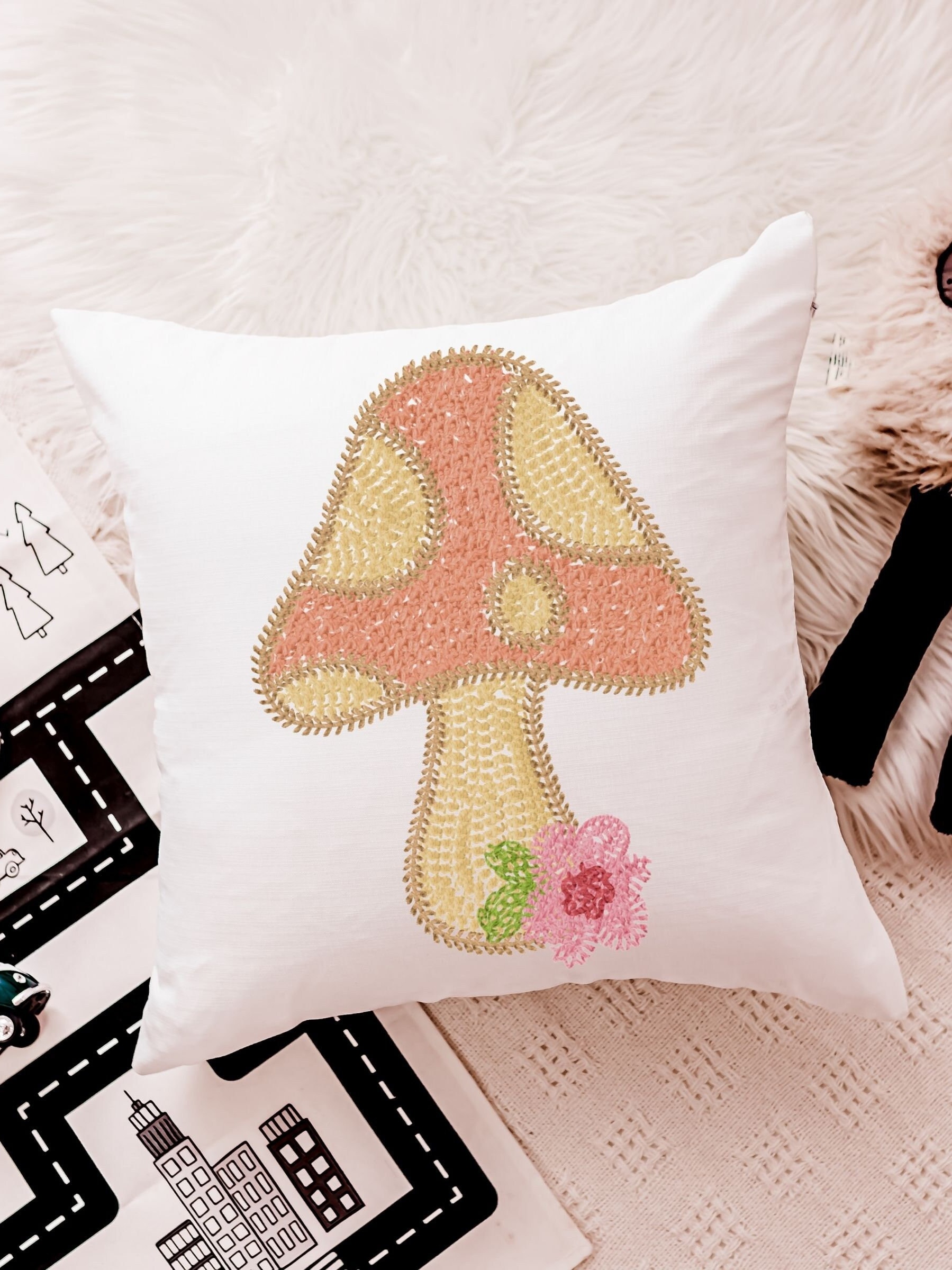 whimsical mushroom throw pillow for rocking chairs, cute mushroom decor for nursery, reading nook pillow, woodland baby shower gift girl