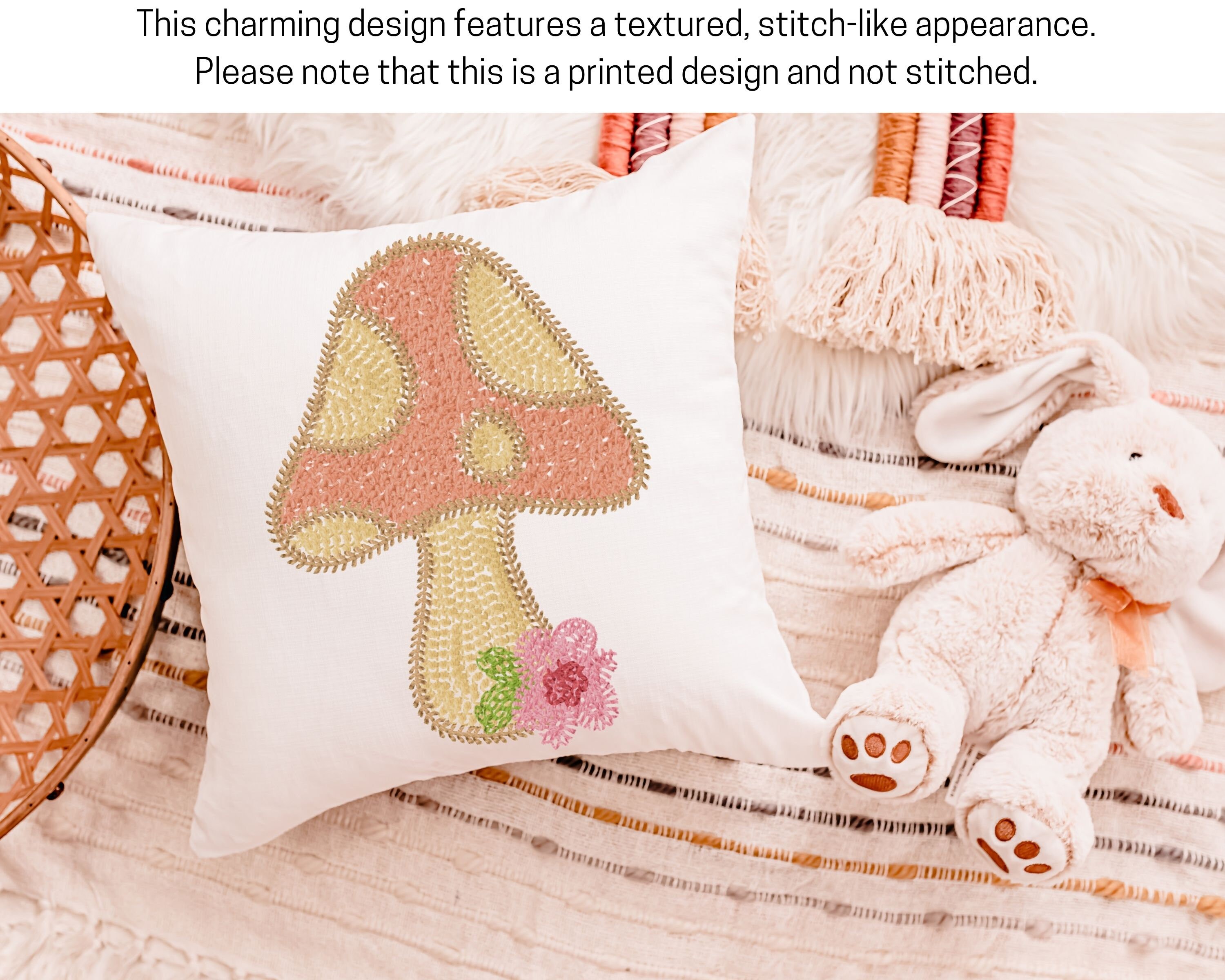 A whimsical mushroom with a printed design that mimics hand-stitched adds charm to rocking chairs, nurseries, or reading nooks. This cozy cottagecore accent makes a thoughtful woodland baby shower gift for girls. Perfect for mushroom lovers and soft, storybook-style nursery decor.