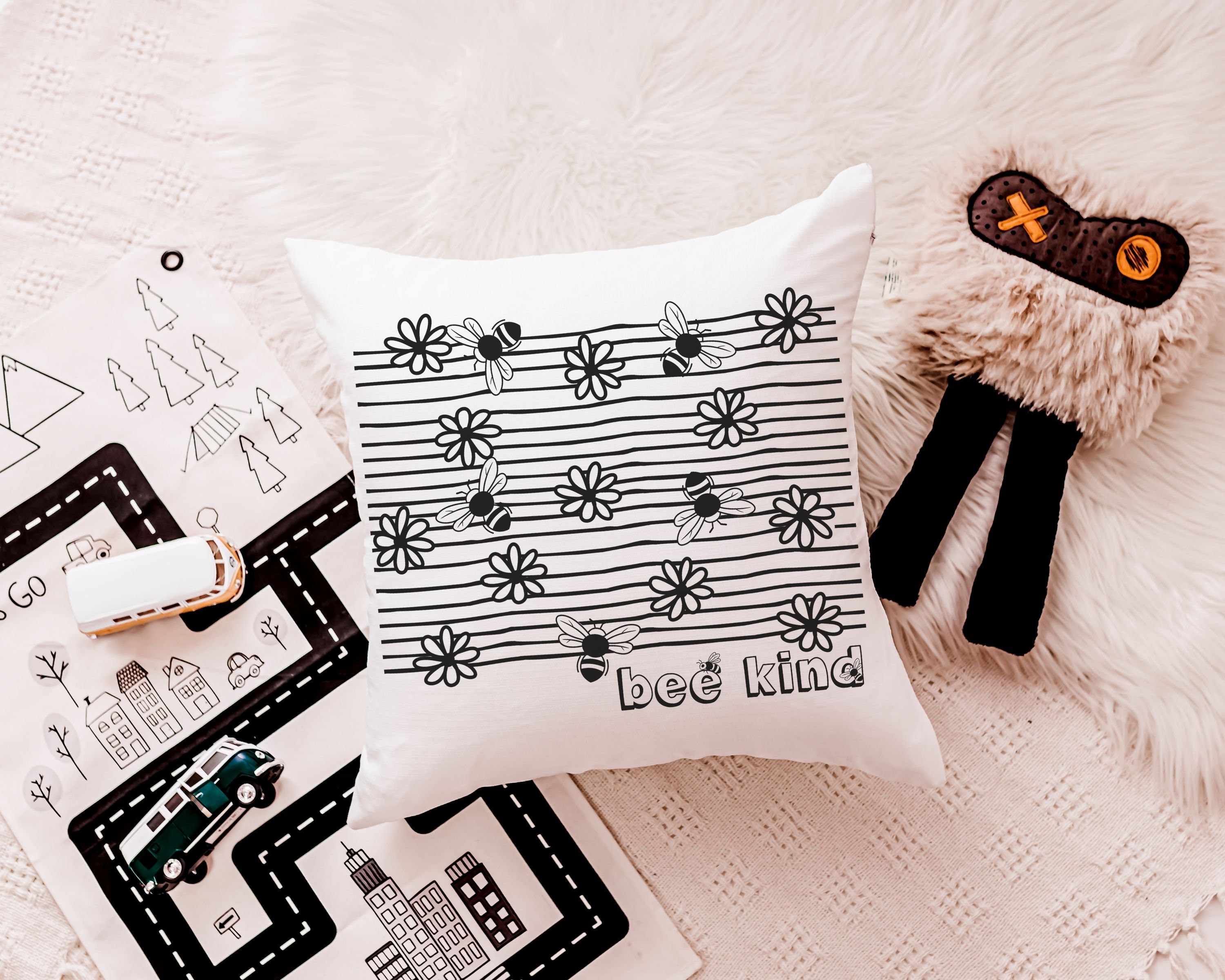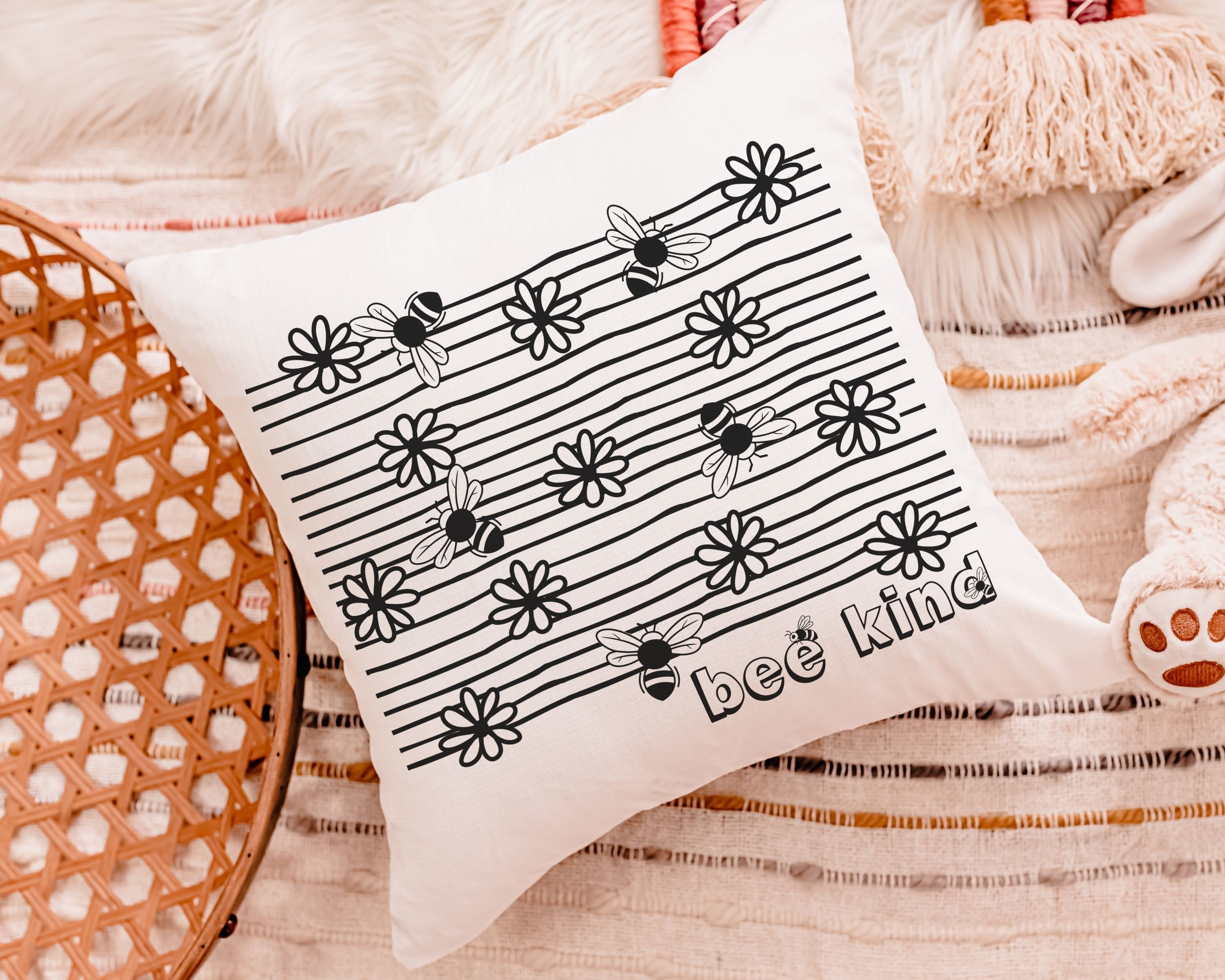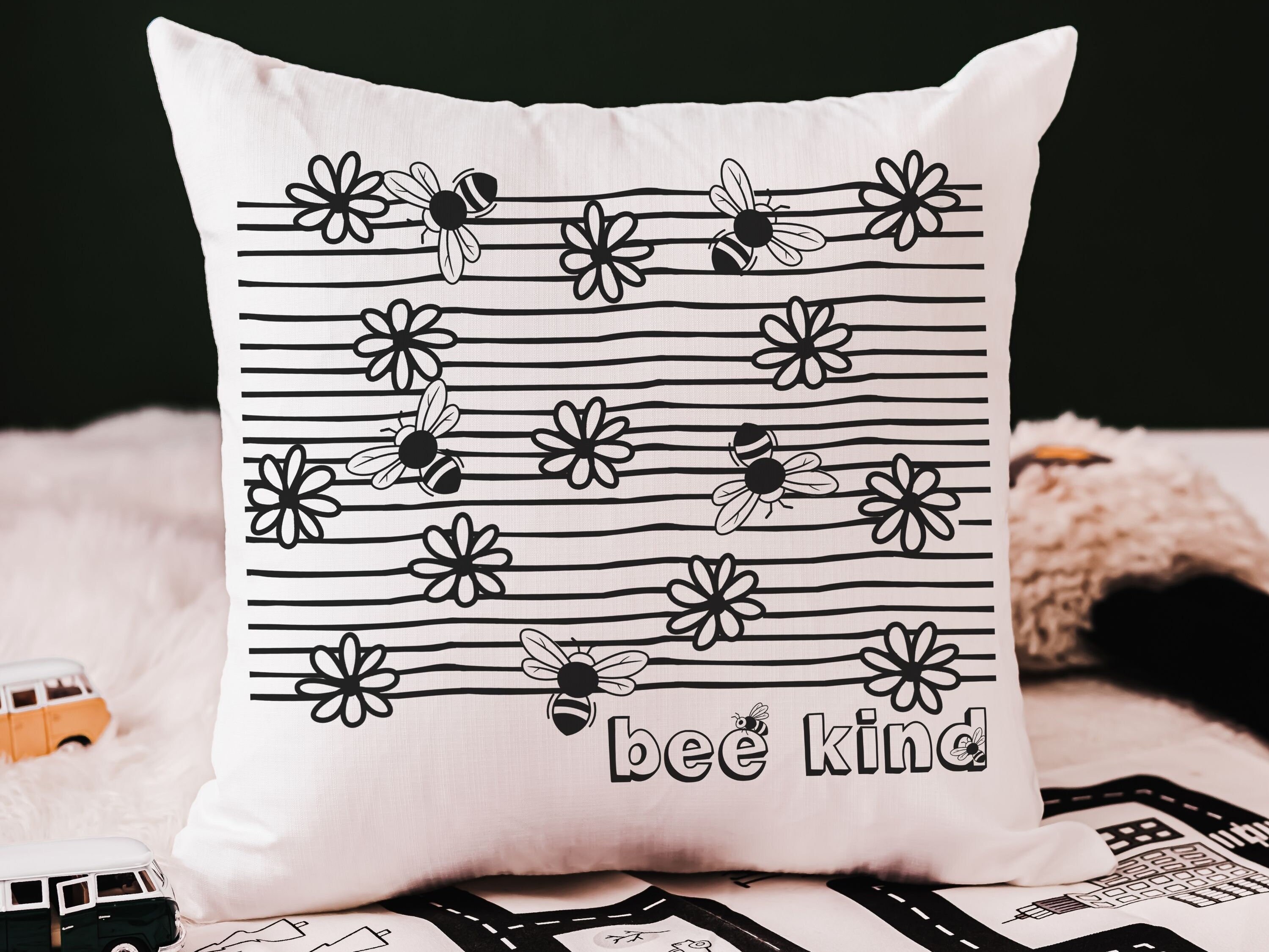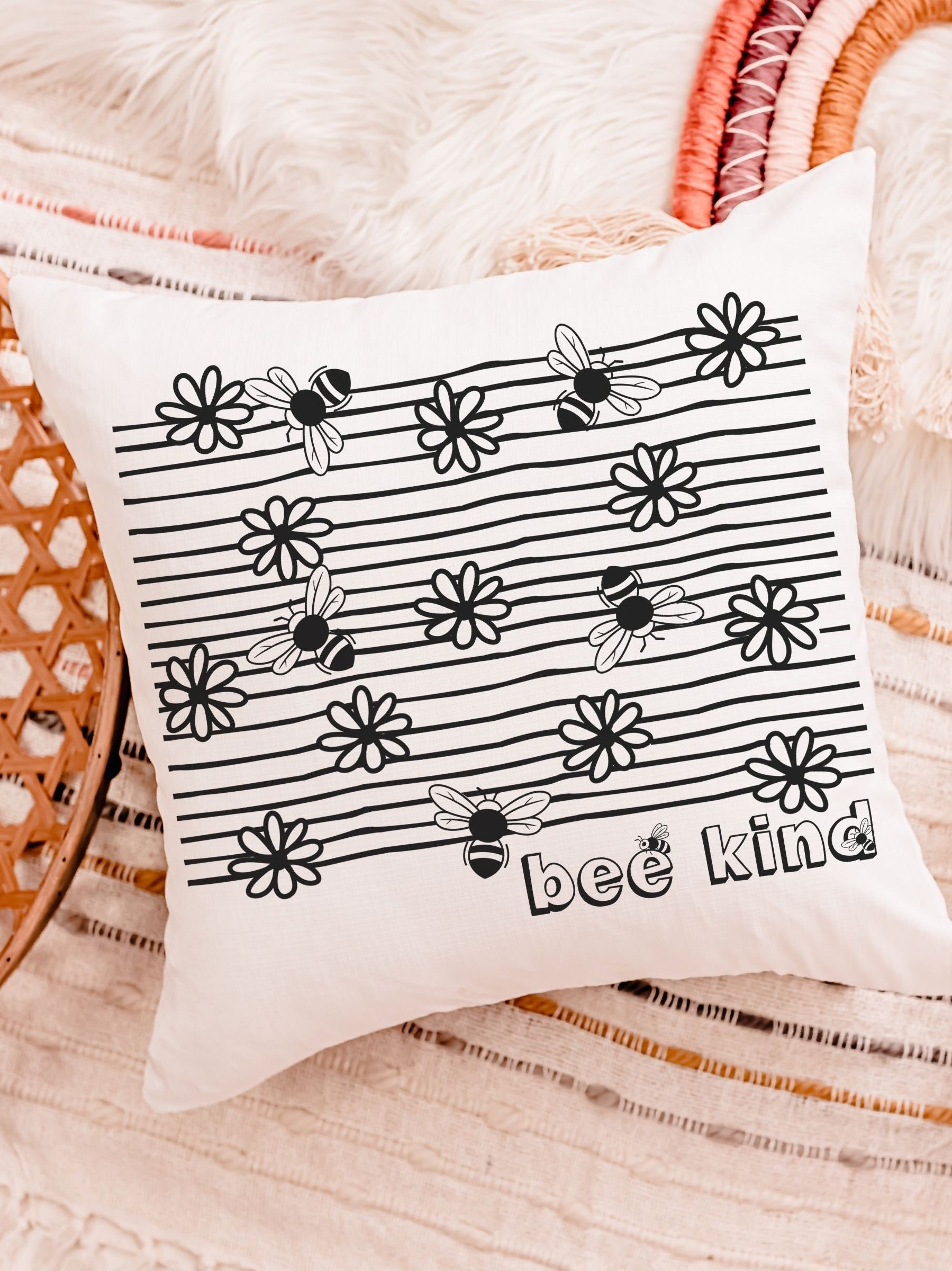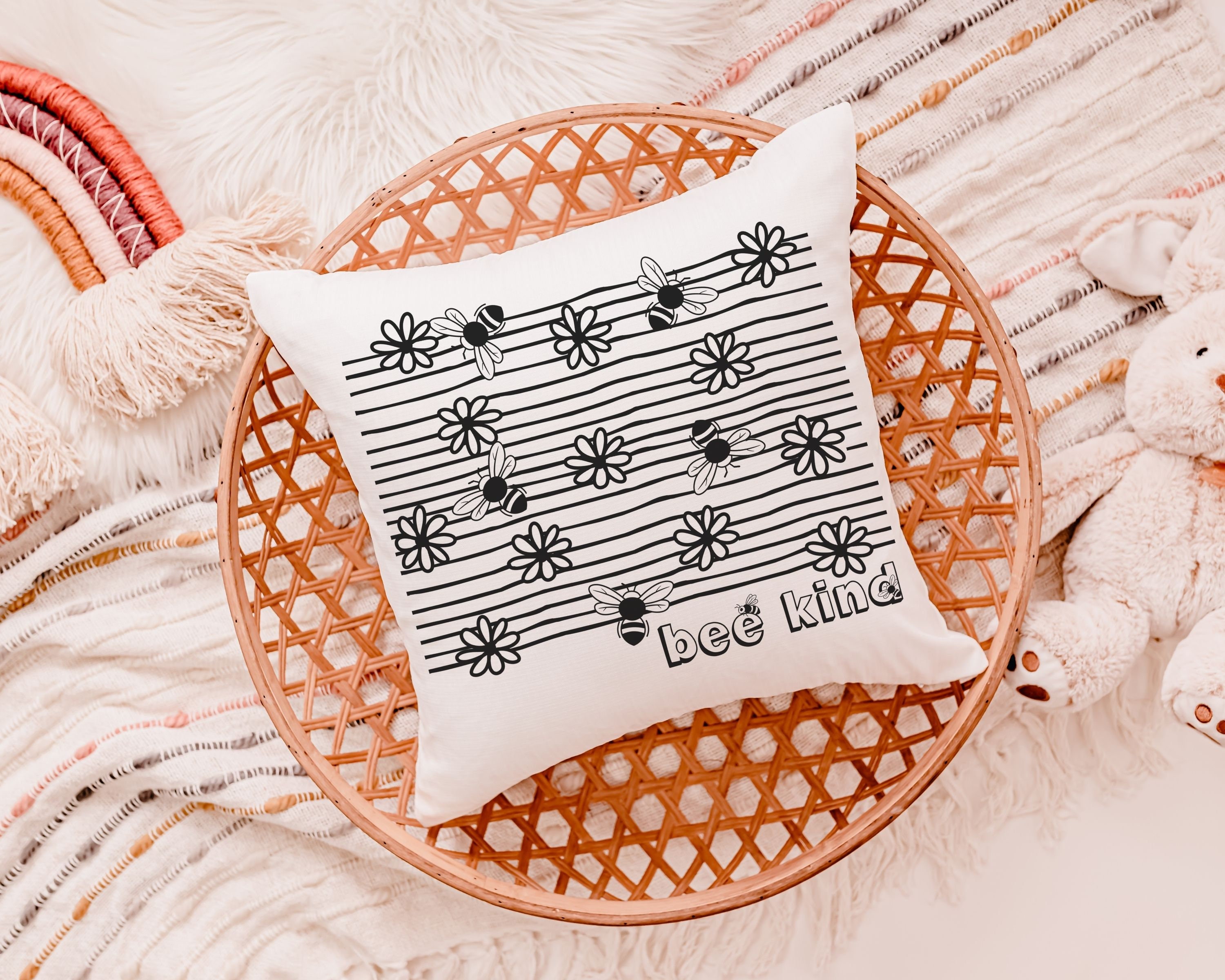 Add a beautiful touch to any space with this “bee kind” throw pillow. Perfect for a classroom reading nook, a bumble bee nursery, or as a sweet baby shower gift for teachers and little ones.