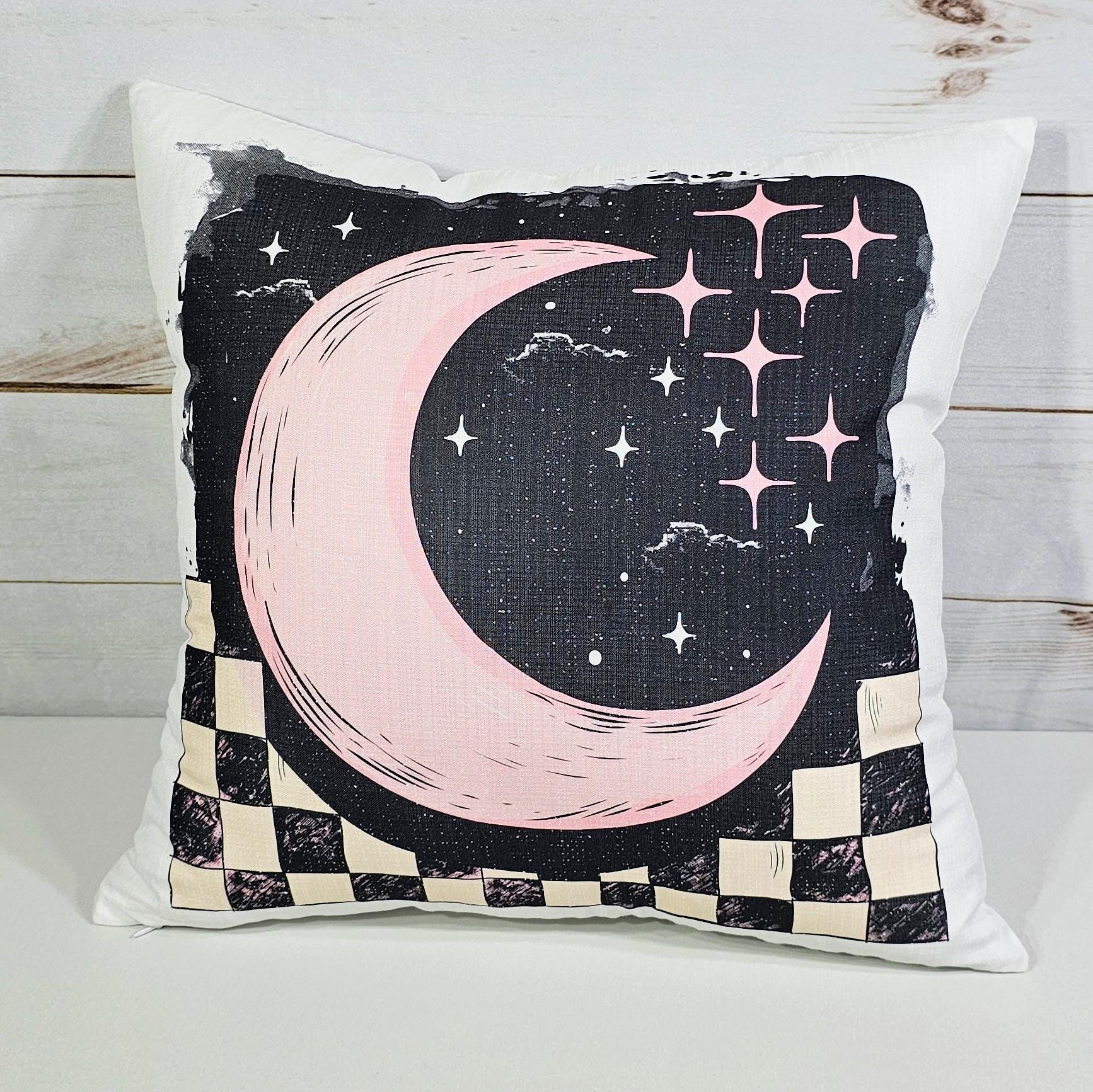 blush pink crescent moon throw pillow for kids room, outer space nursery decor, spacecore reading nook pillow for girls, college dorm decor
