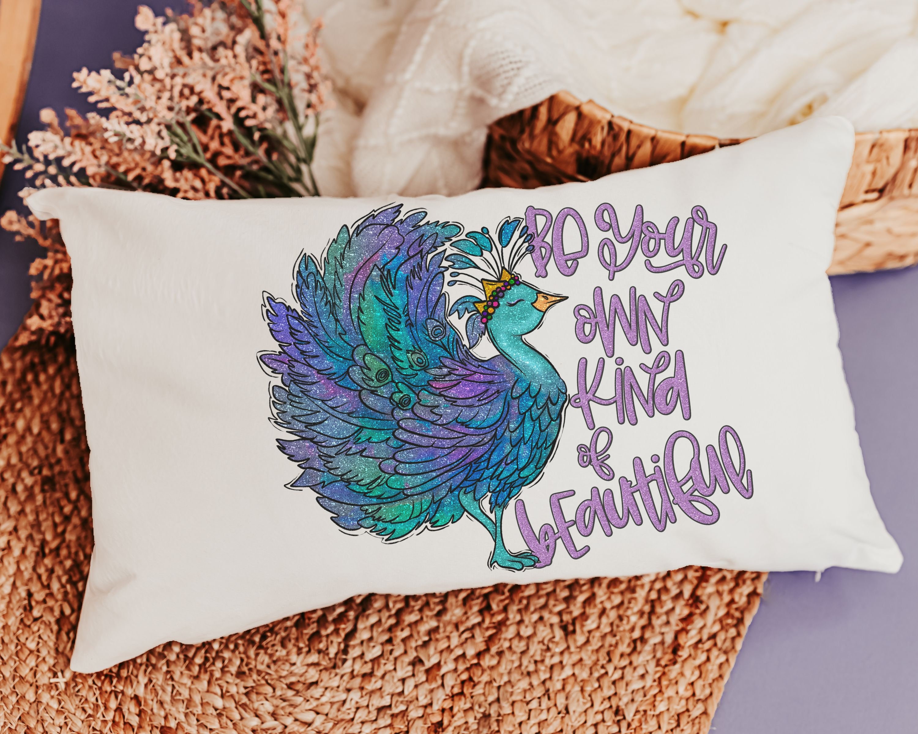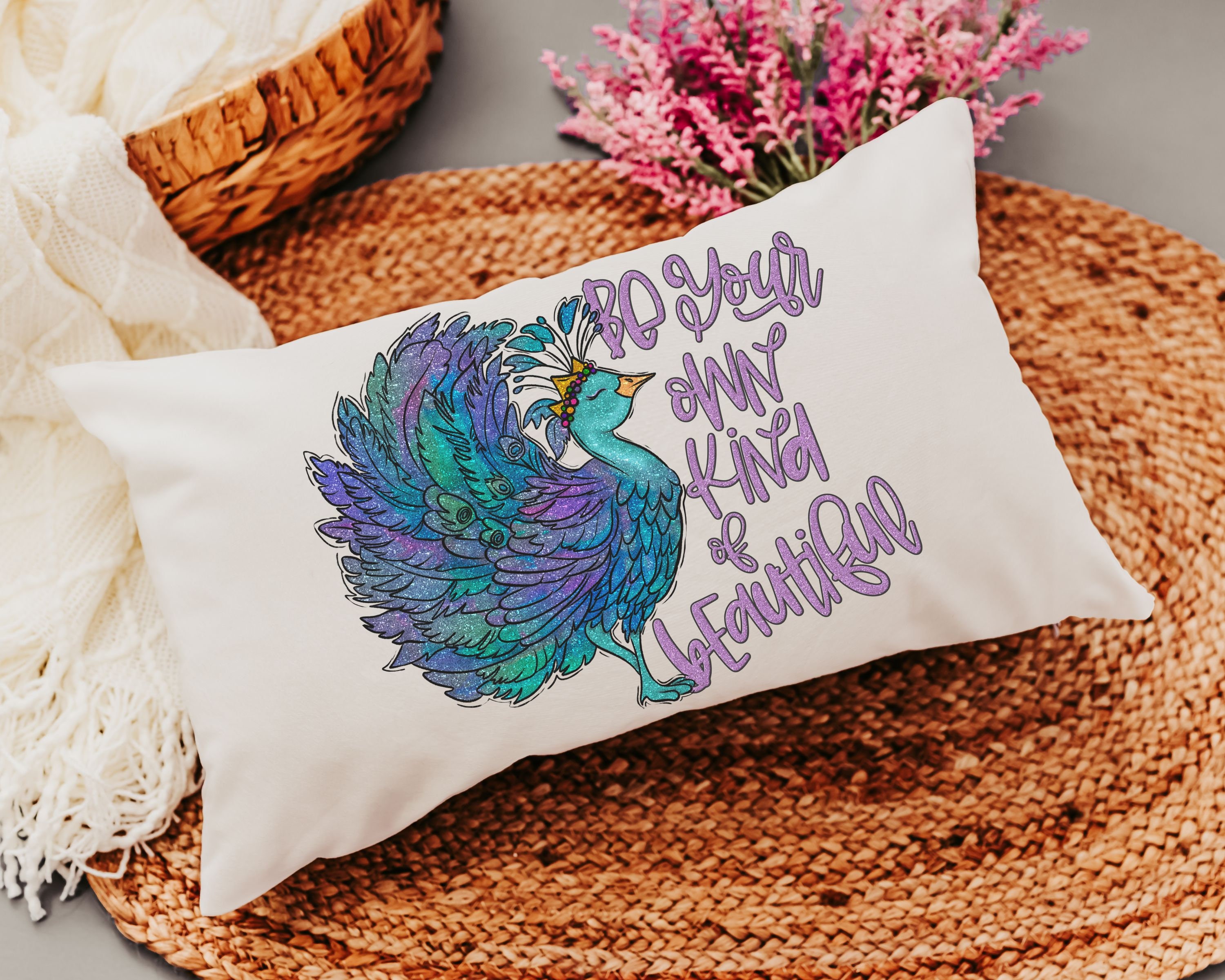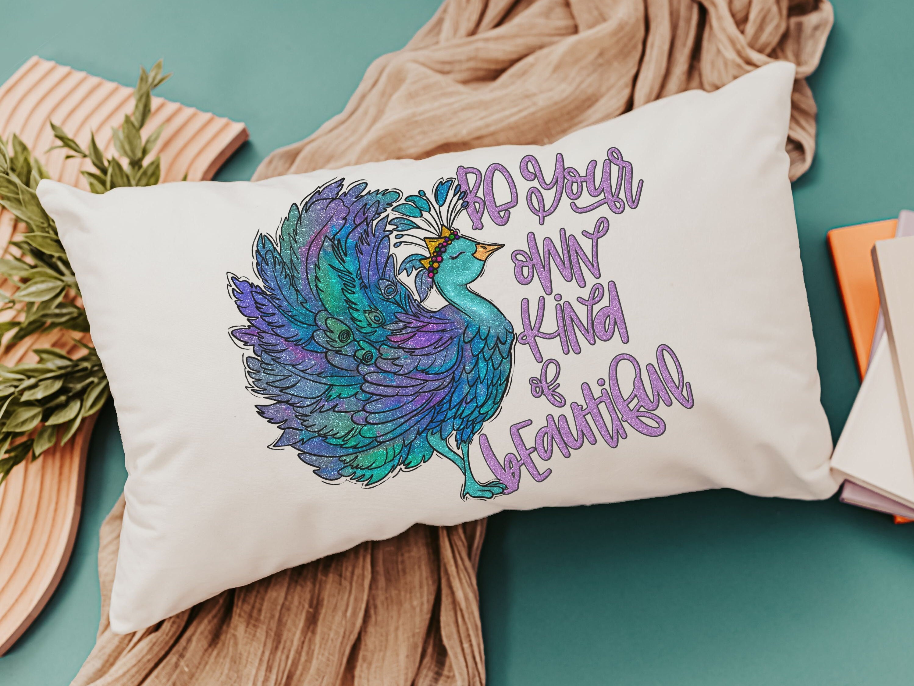 Add a touch of inspiration to any space with our "Be Your Own Kind of Beautiful" Lumbar Pillow, perfect for the bed or as cute dorm decor for girls. This peacock throw pillow makes a thoughtful and uplifting graduation gift, encouraging self-expression and confidence. Ideal for adding style and motivation to a room, it's a perfect choice for any girl embracing her uniqueness!