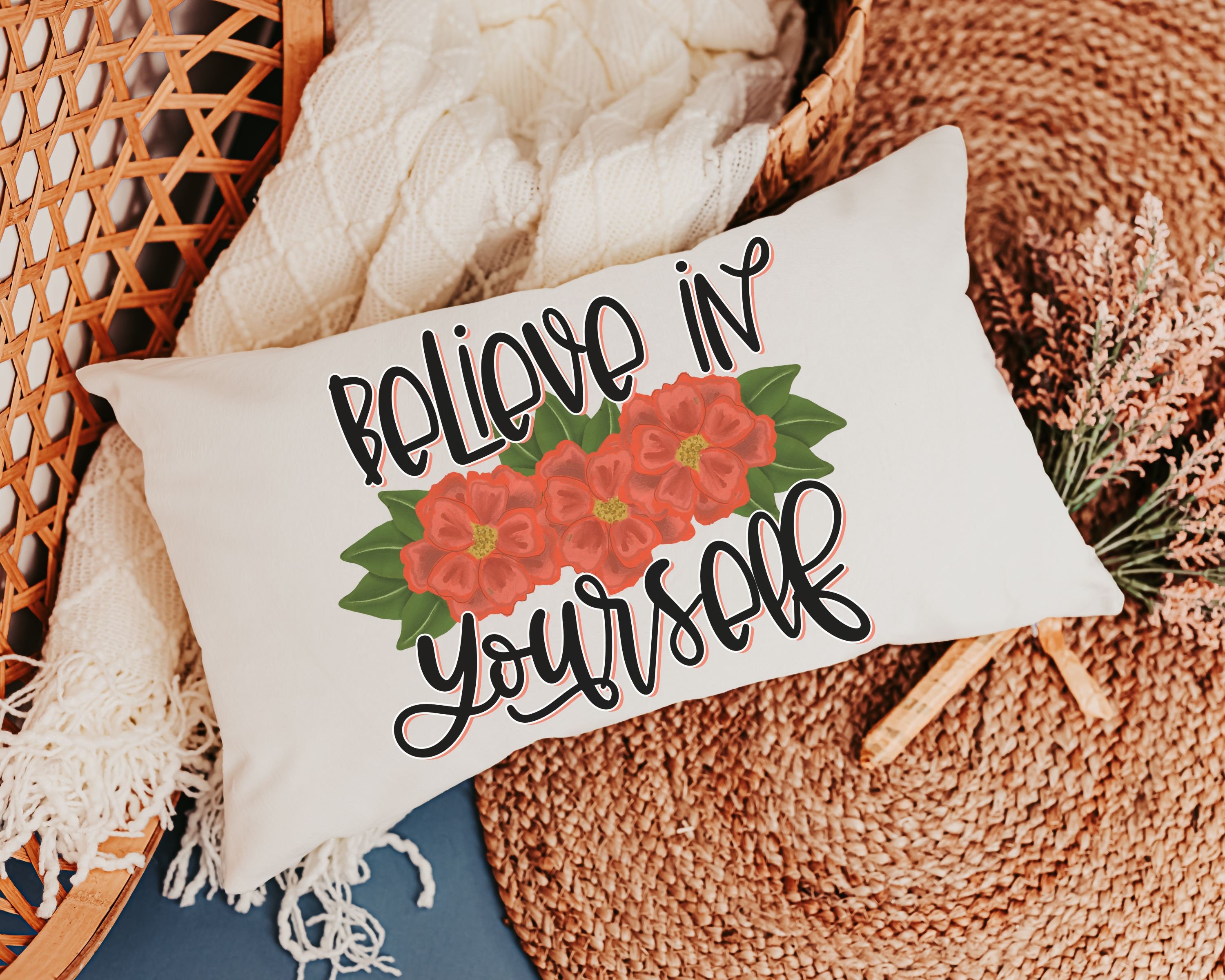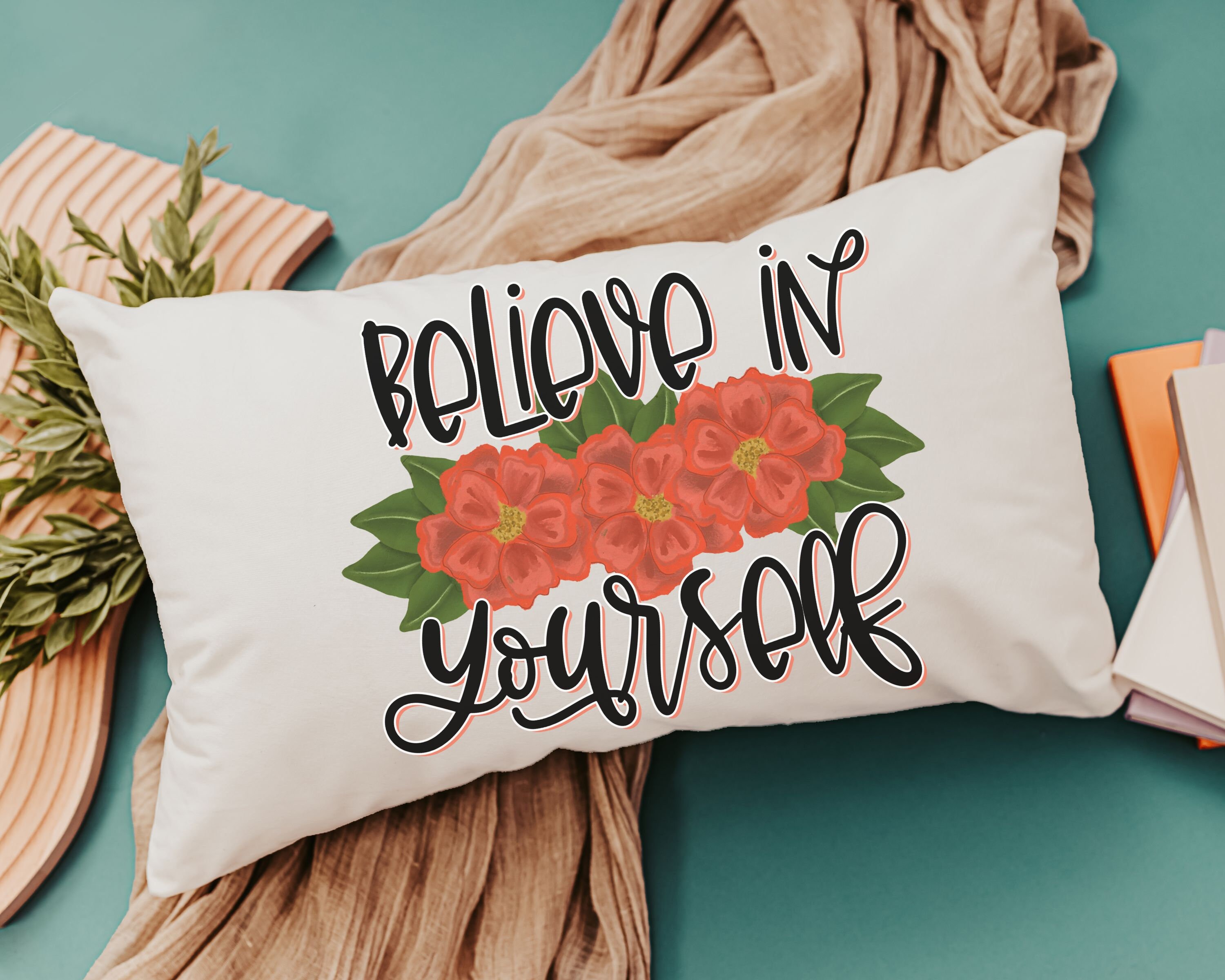 believe in yourself inspirational throw pillows for bed, red dahlia floral lumbar pillow cover 12x20, cute Christmas gifts for college girls