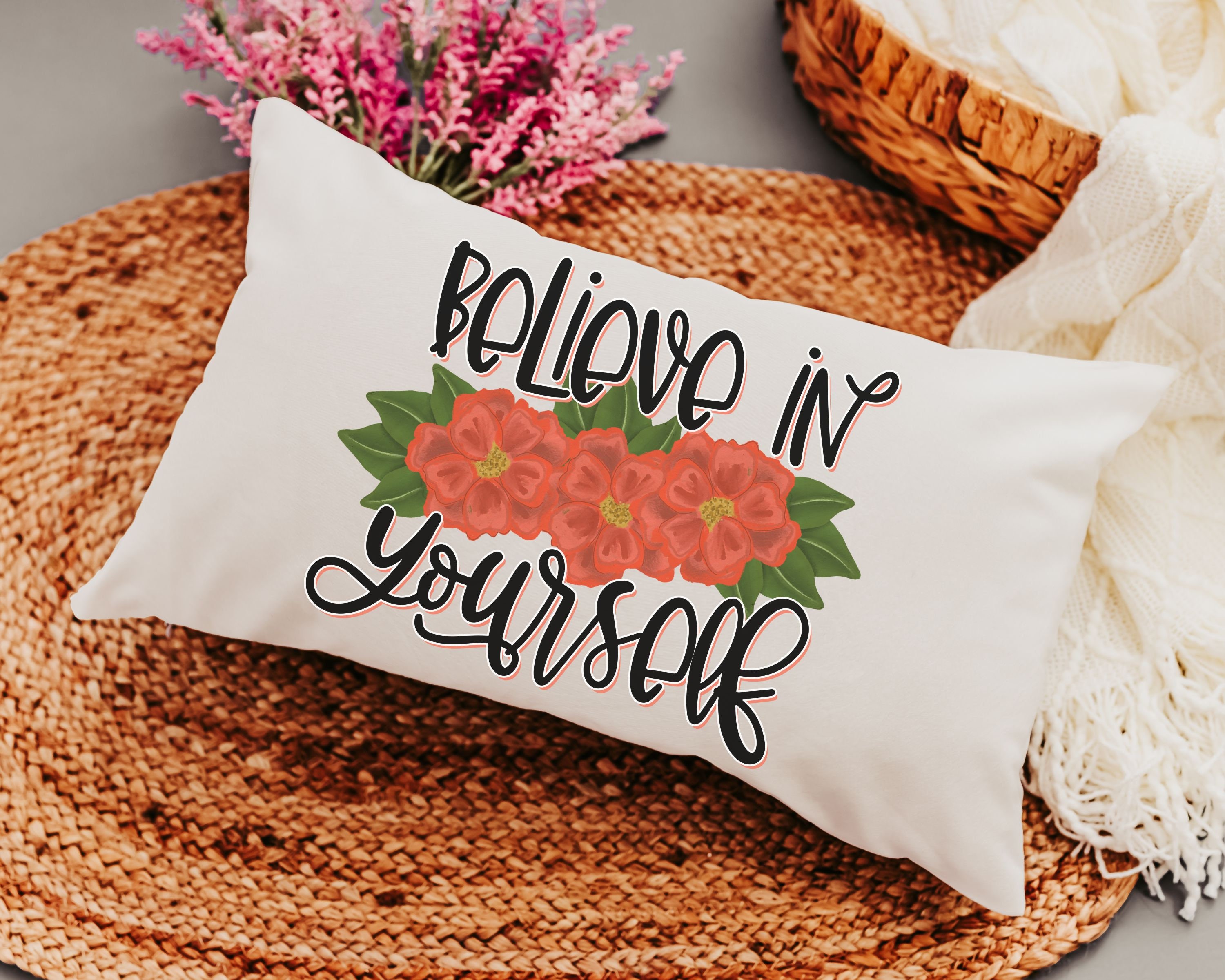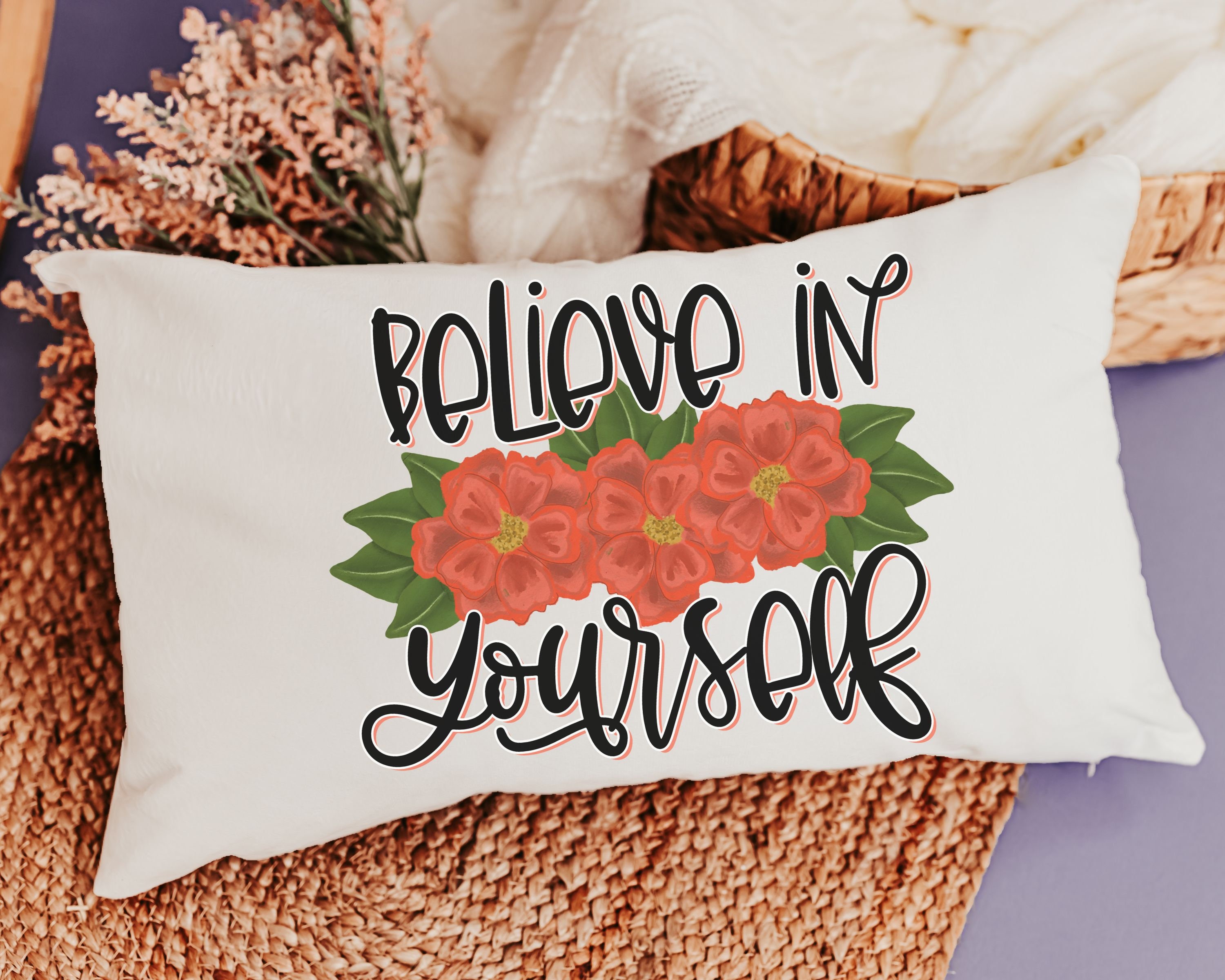 Add a stylish touch to any space with our Believe in Yourself Inspirational Throw Pillow. This red dahlia floral lumbar pillow (12x20) is perfect for the bed or a chair and makes cute Christmas gifts for college girls. Ideal for secret Santa gifts or as a unique present for women and gardeners, it's a thoughtful way to bring charm and encouragement to any room. A great gift choice for the holiday season!