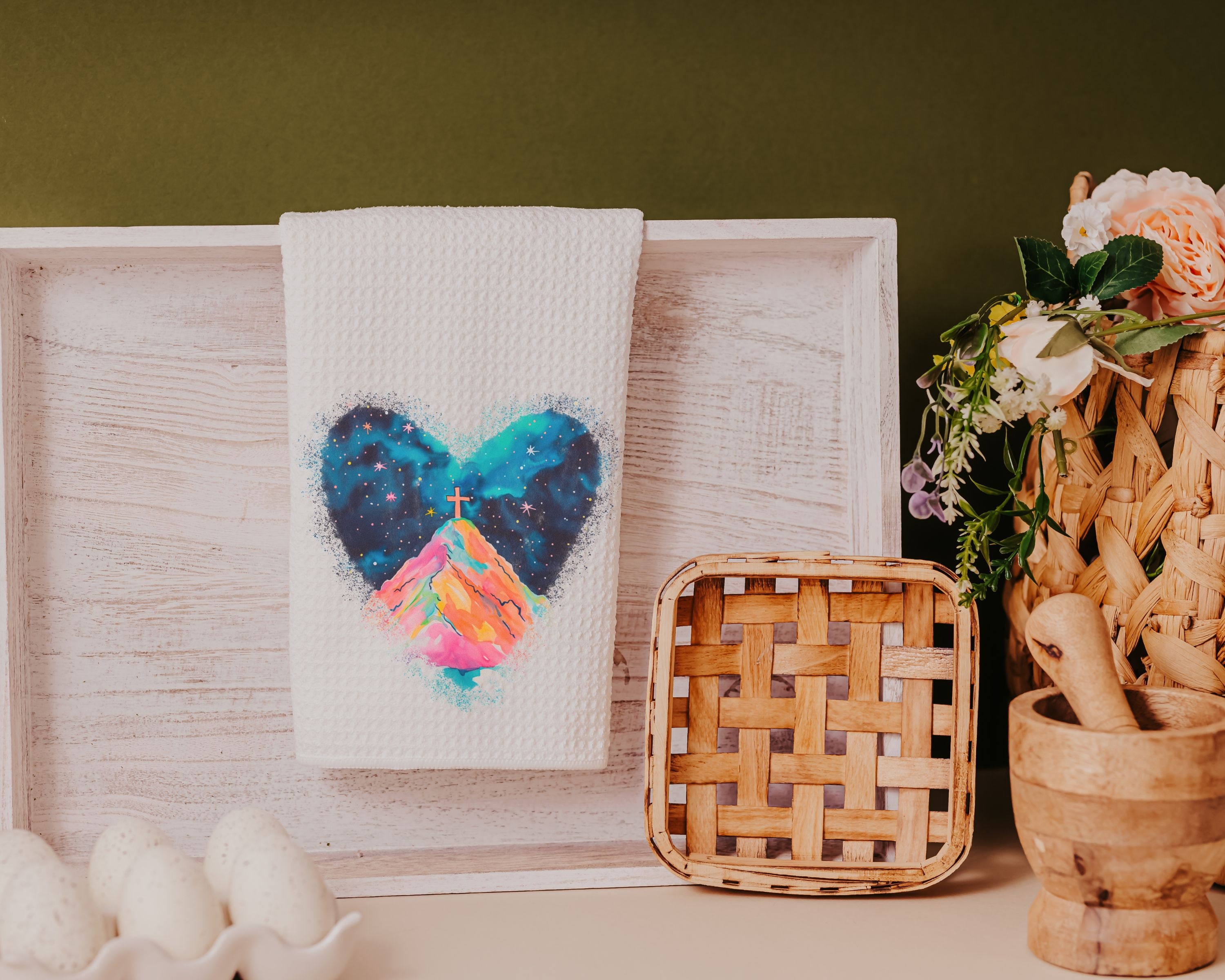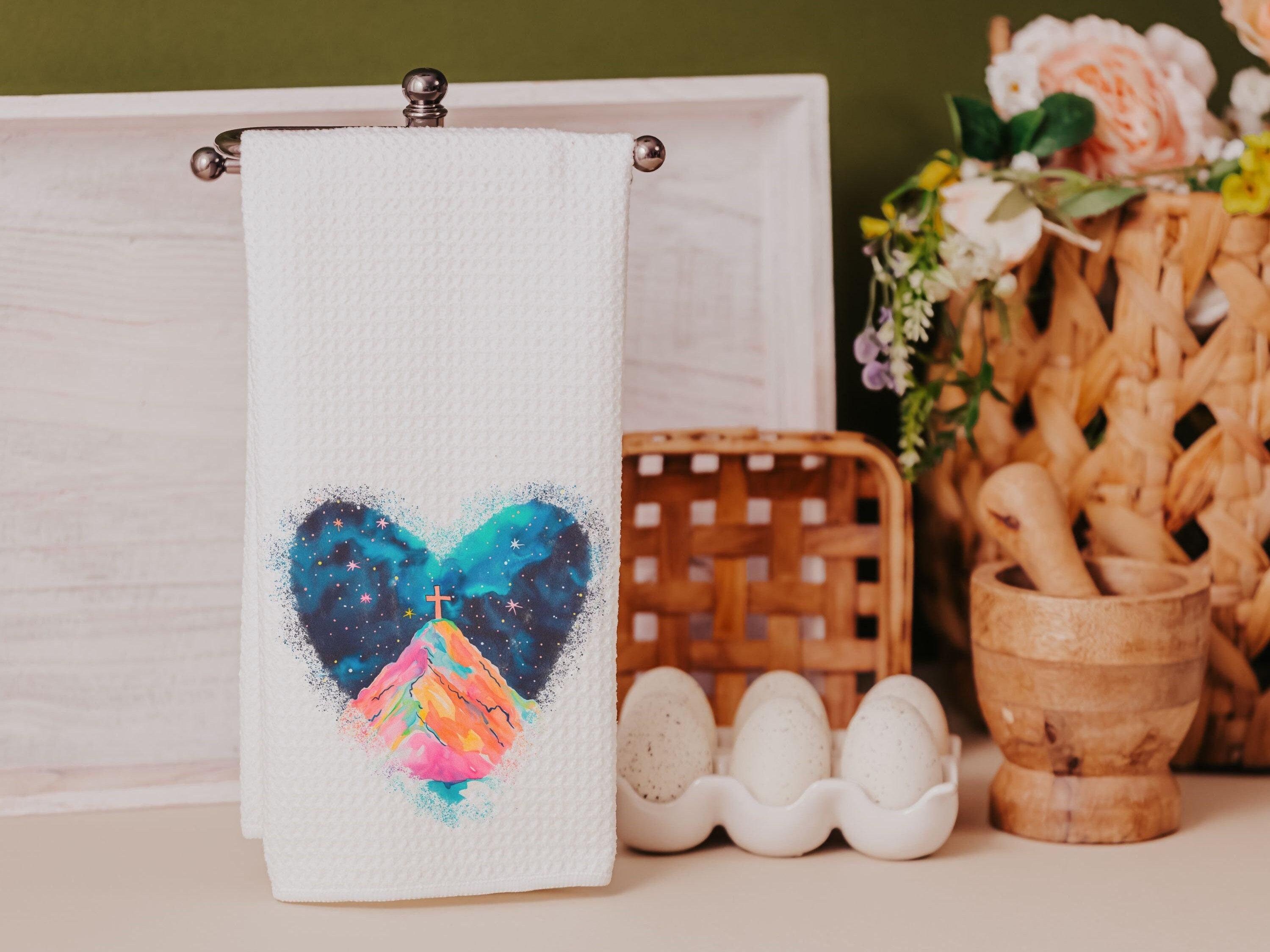 watercolor cross on the hill Christian kitchen towels for gifts, Christian decor for home, faith gifts for Mom, powder room hand towels for
