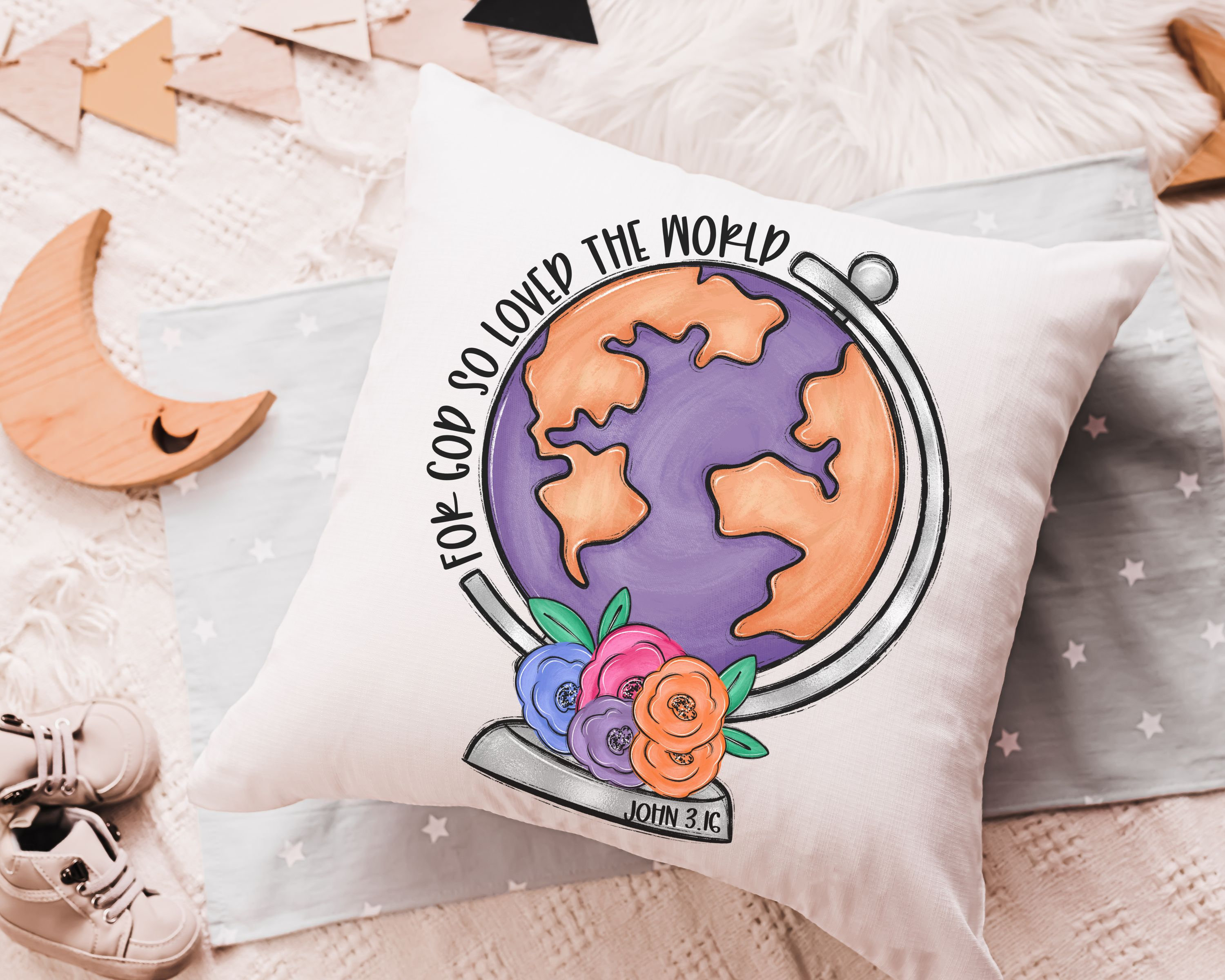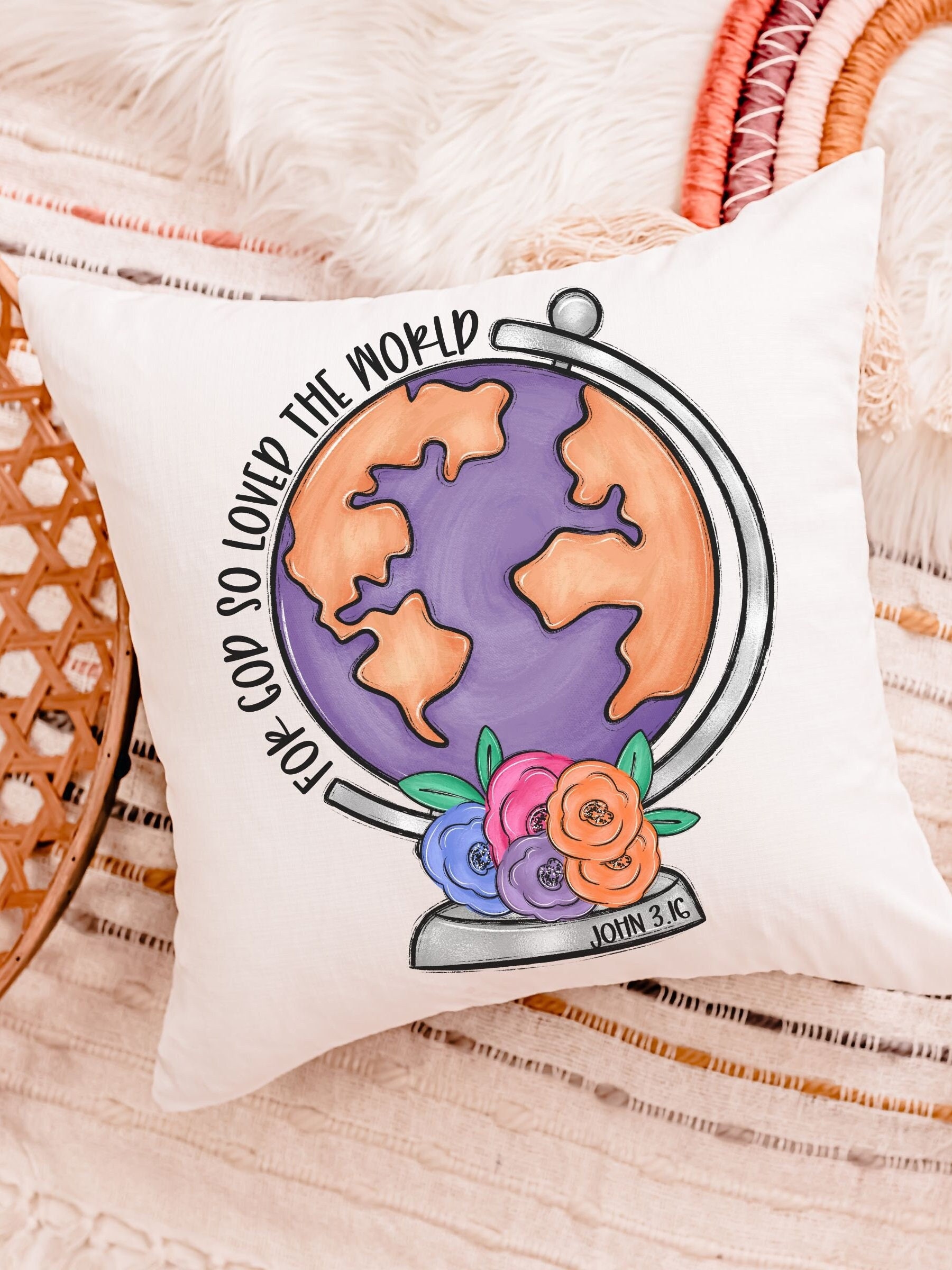 This floral globe throw pillow, inspired by John 3:16, makes a beautiful baptism gift for girls from a godmother. A meaningful piece for a Christian nursery, bedroom, or confirmation gift, bringing faith-filled decor to any space.