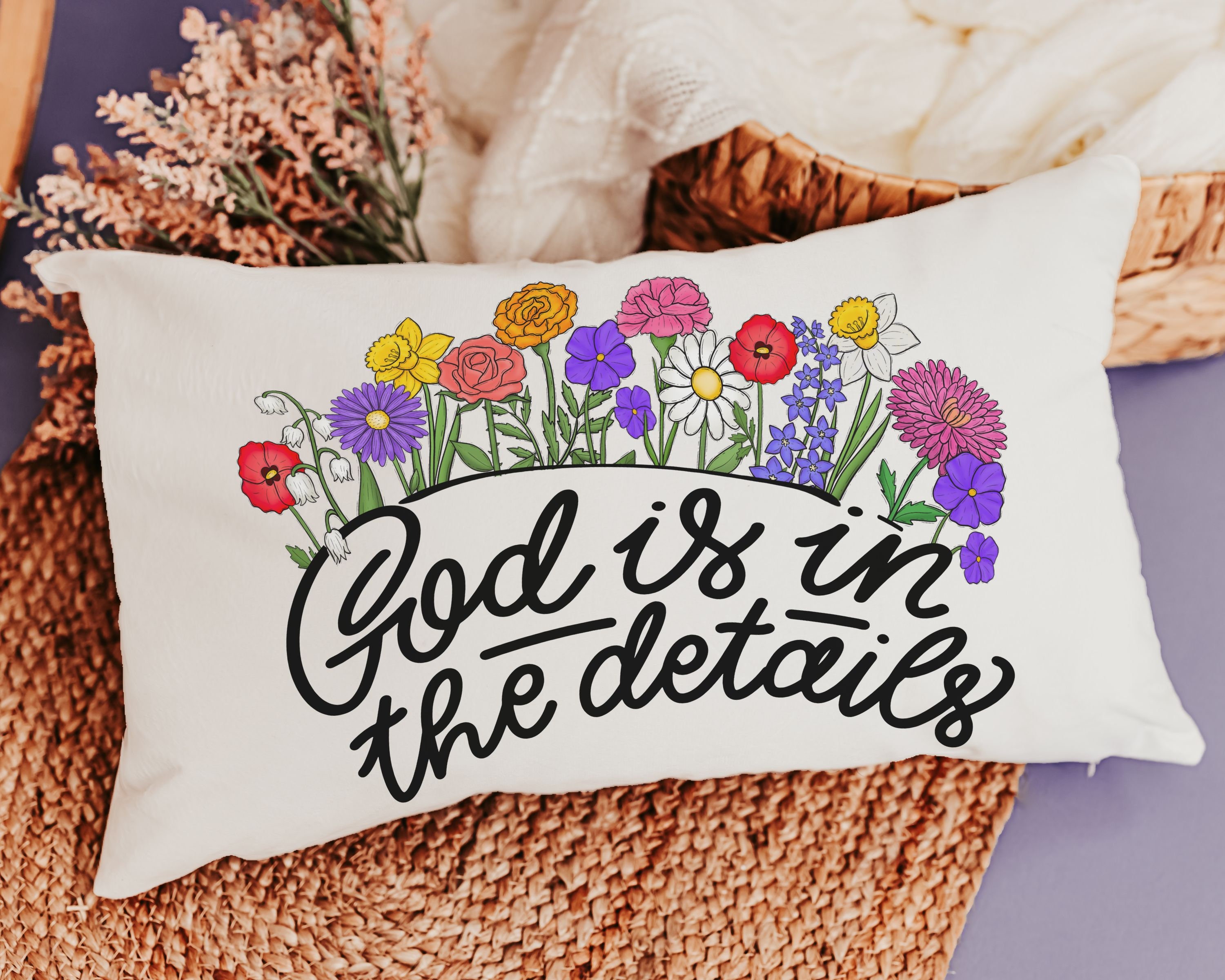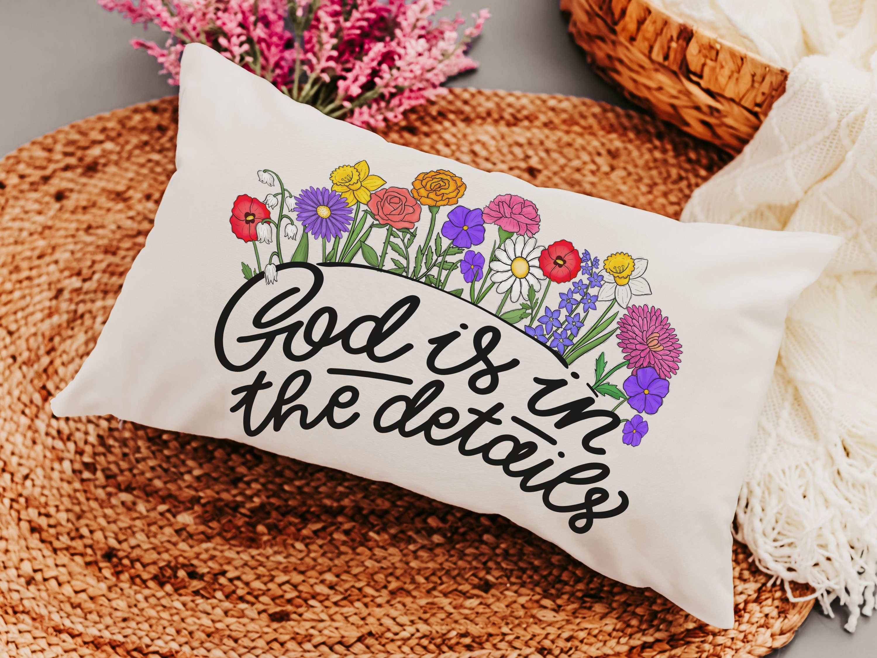 God is in the details wildflower lumbar pillow for couch, floral throw pillow for bed, Christian Mothers day gifts for mother in law, faith