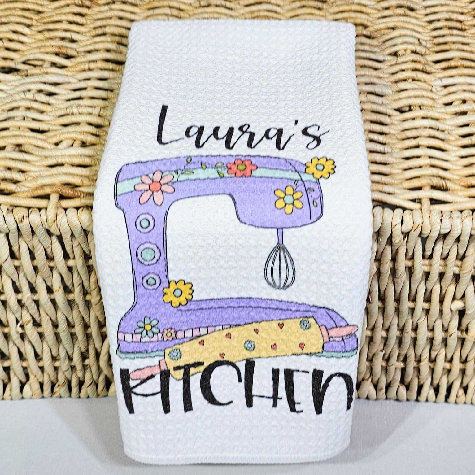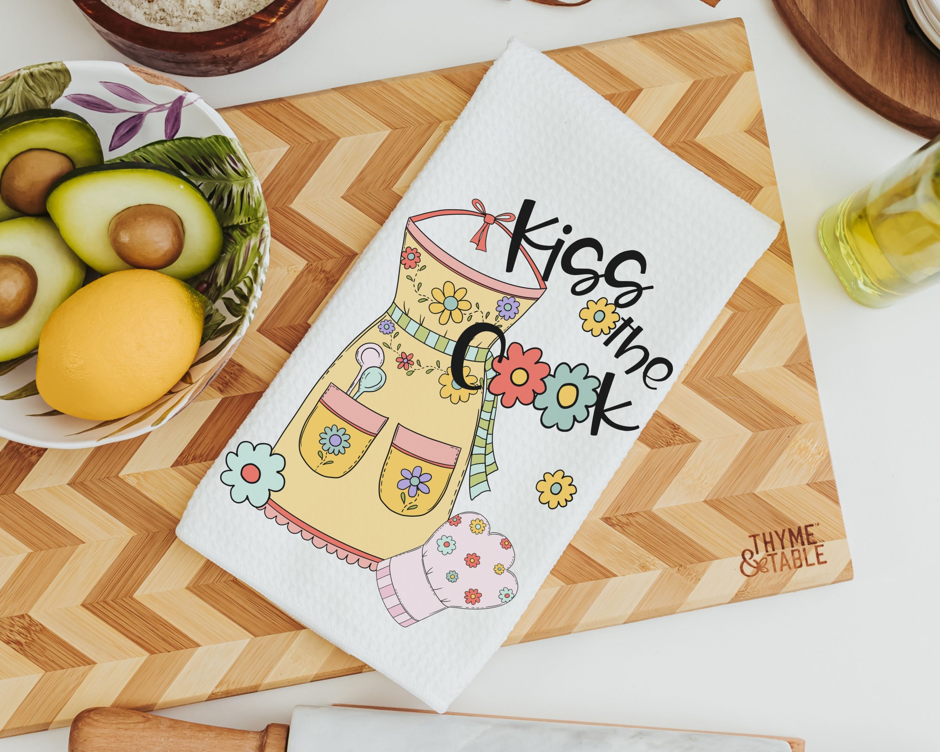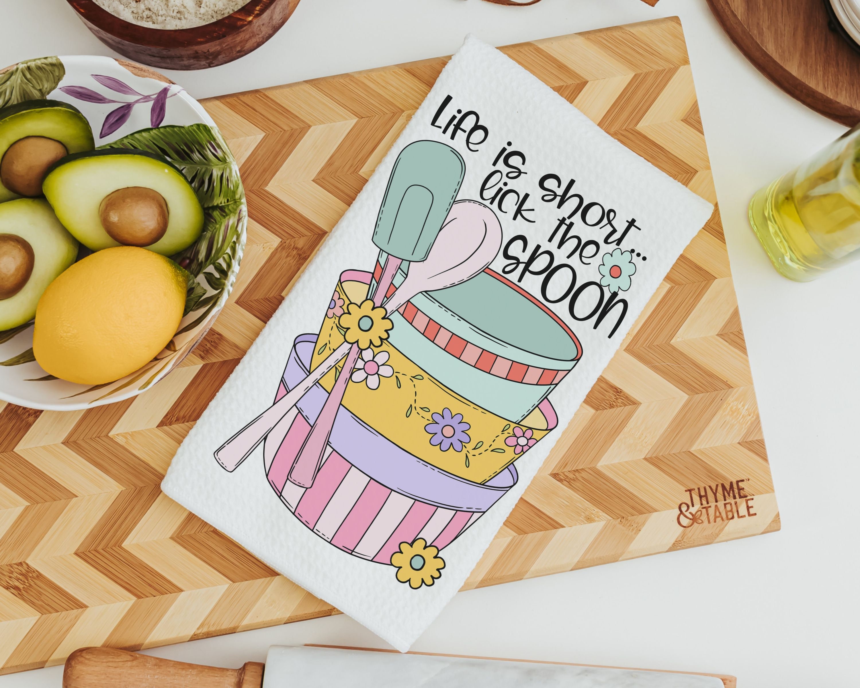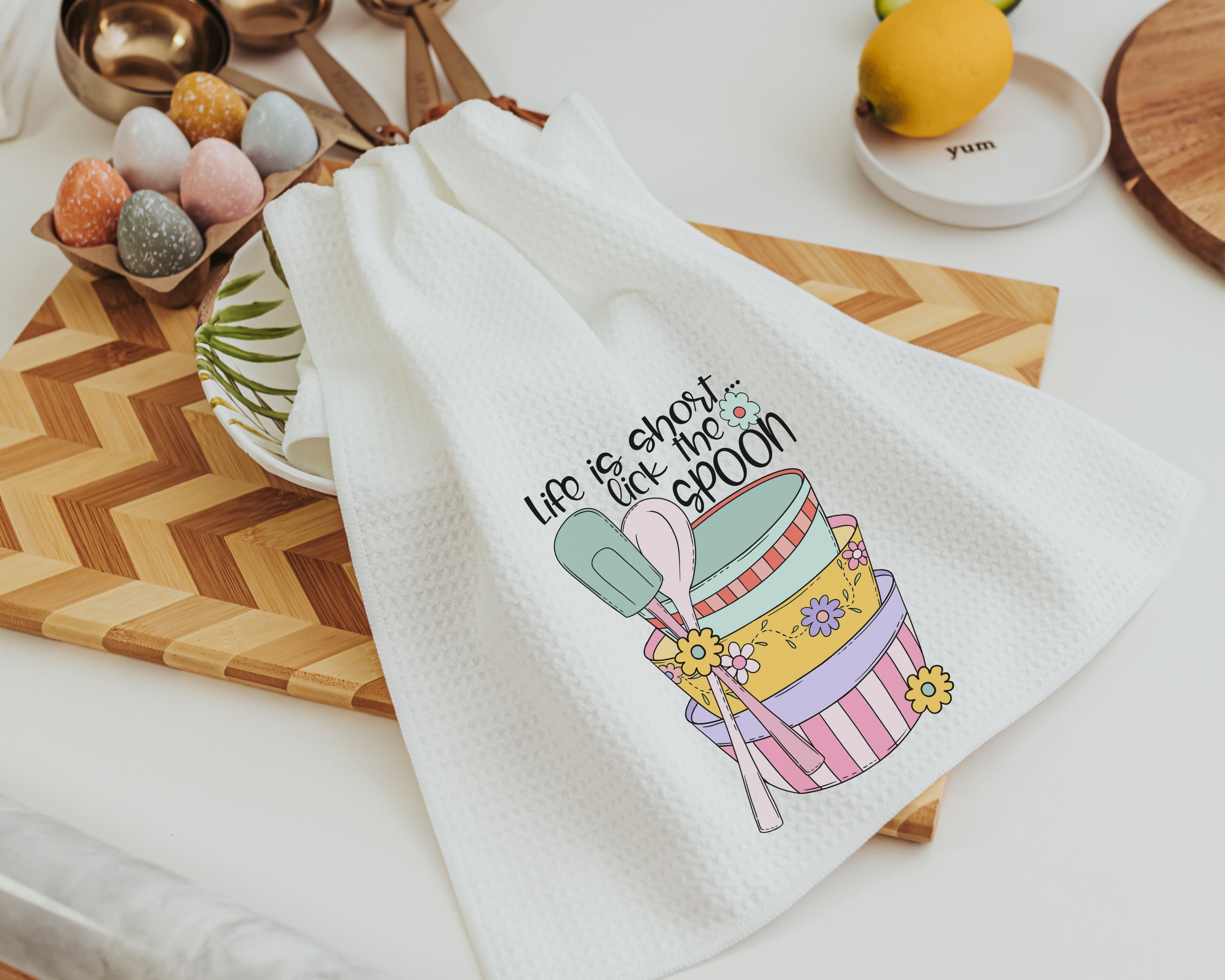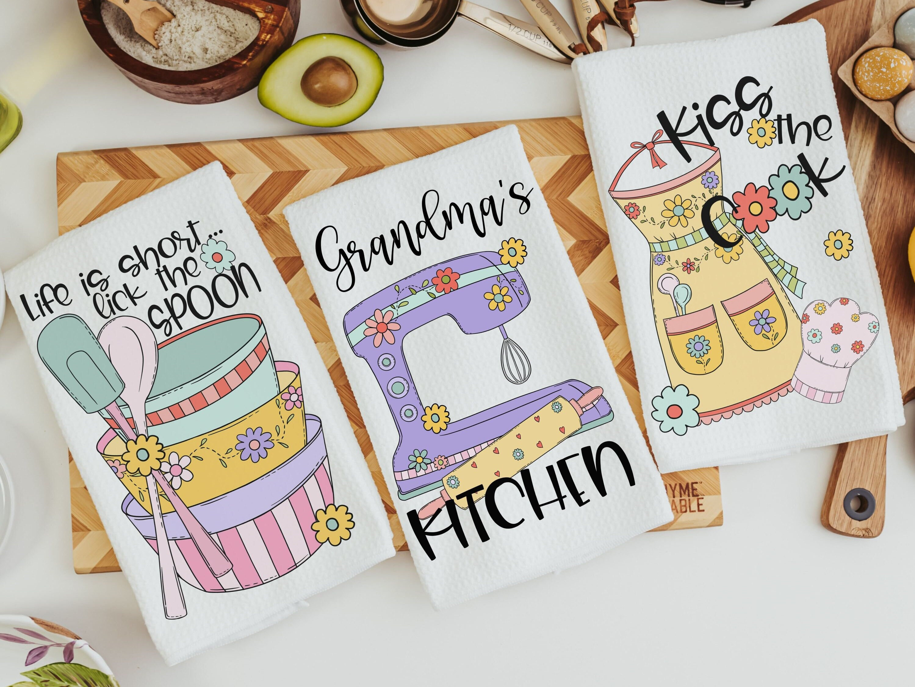 personalized Grandmas kitchen hand towels, cute Mothers day gifts for bakers, kiss the cook kitchen decor, life is short lick the spoon