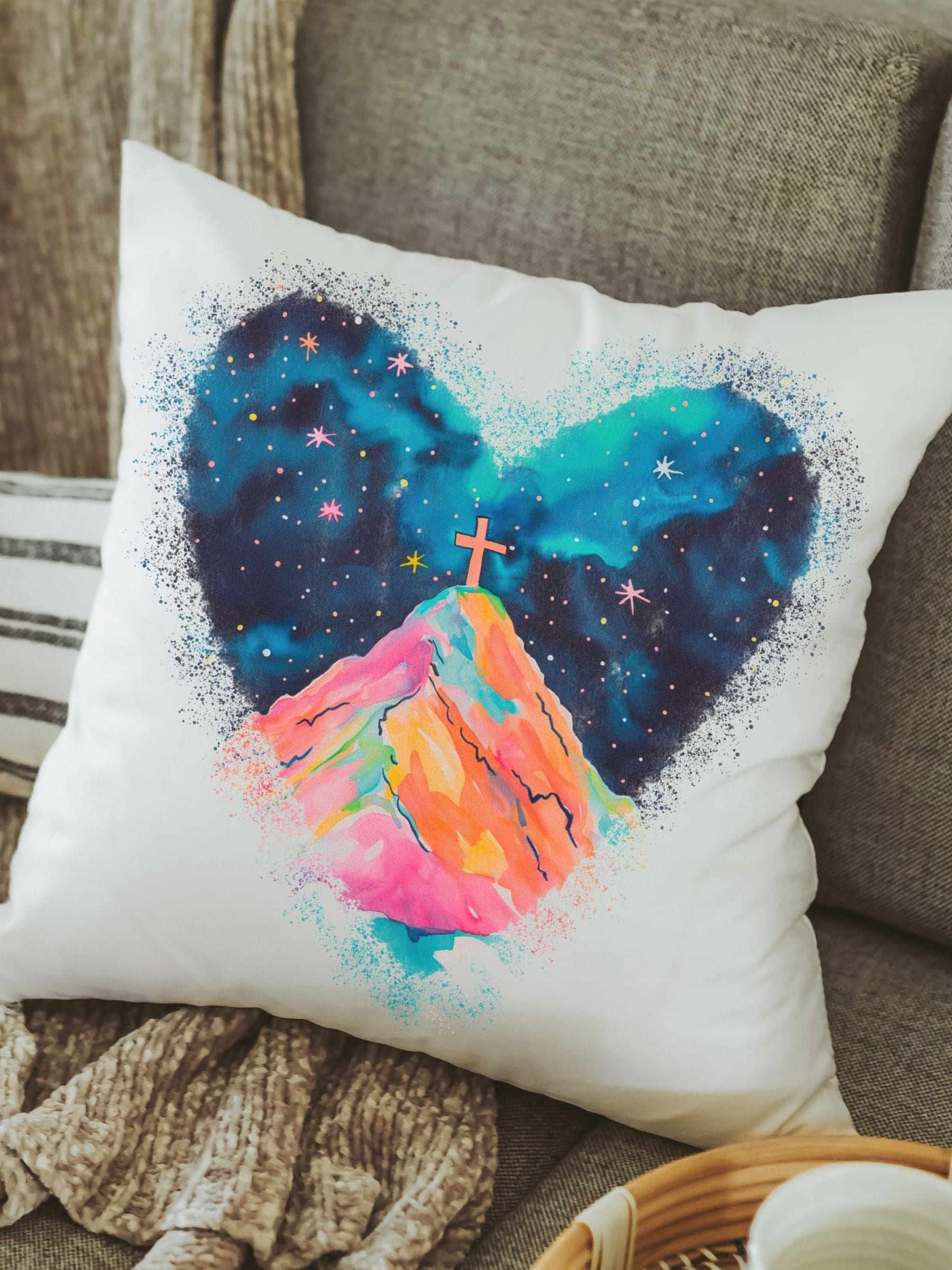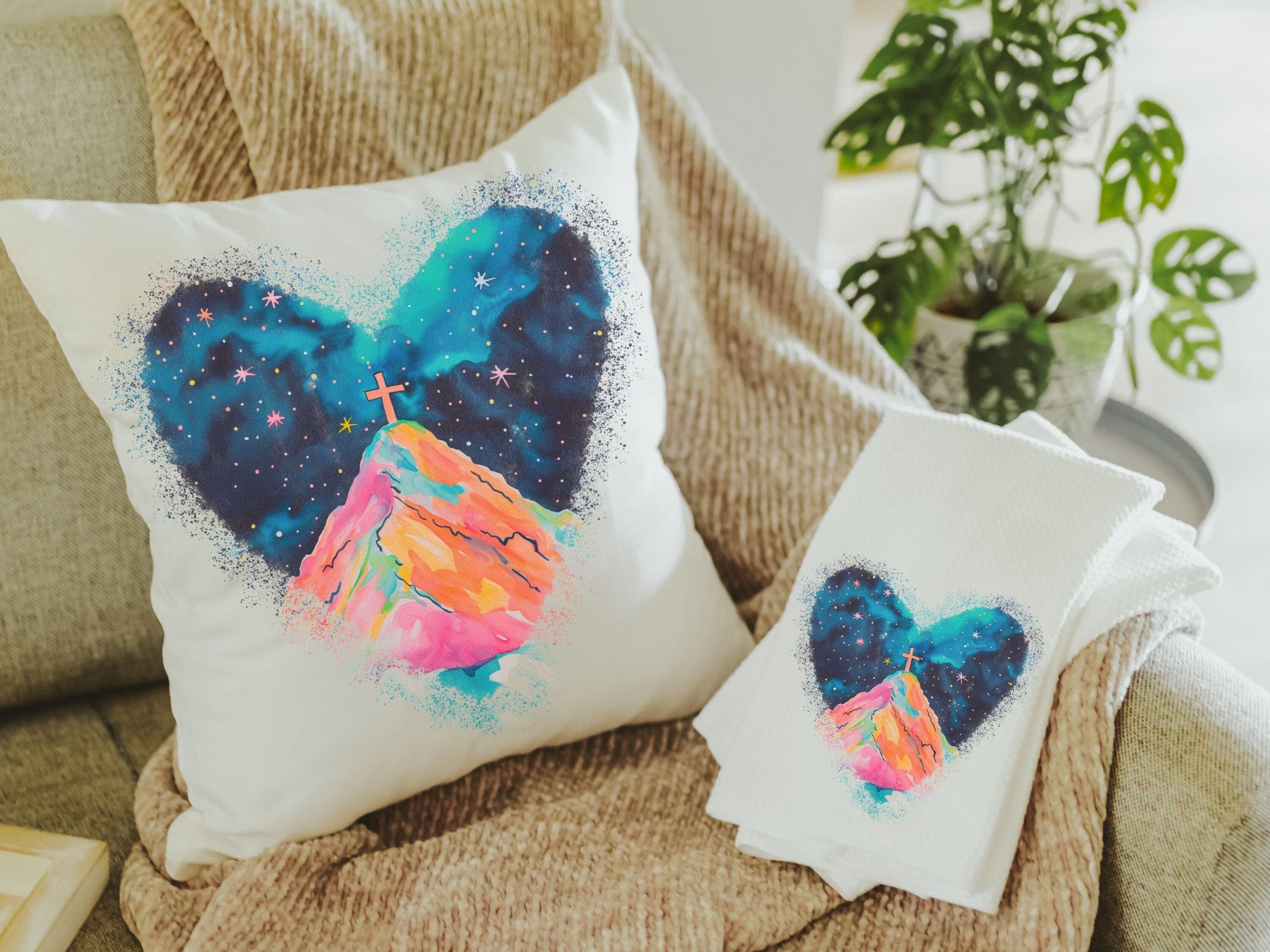 Our Watercolor Cross Christian Throw Pillows bring a serene touch to any bed with the Cross on the Hill design. Paired with matching Christian kitchen towels, this set makes thoughtful spiritual gifts or faith decor for your home. Ideal for godmother gifts from a goddaughter, these items are perfect for adding a touch of faith to any space. Purchase the throw pillow and kitchen towels separately or as a set, perfect for gifting!