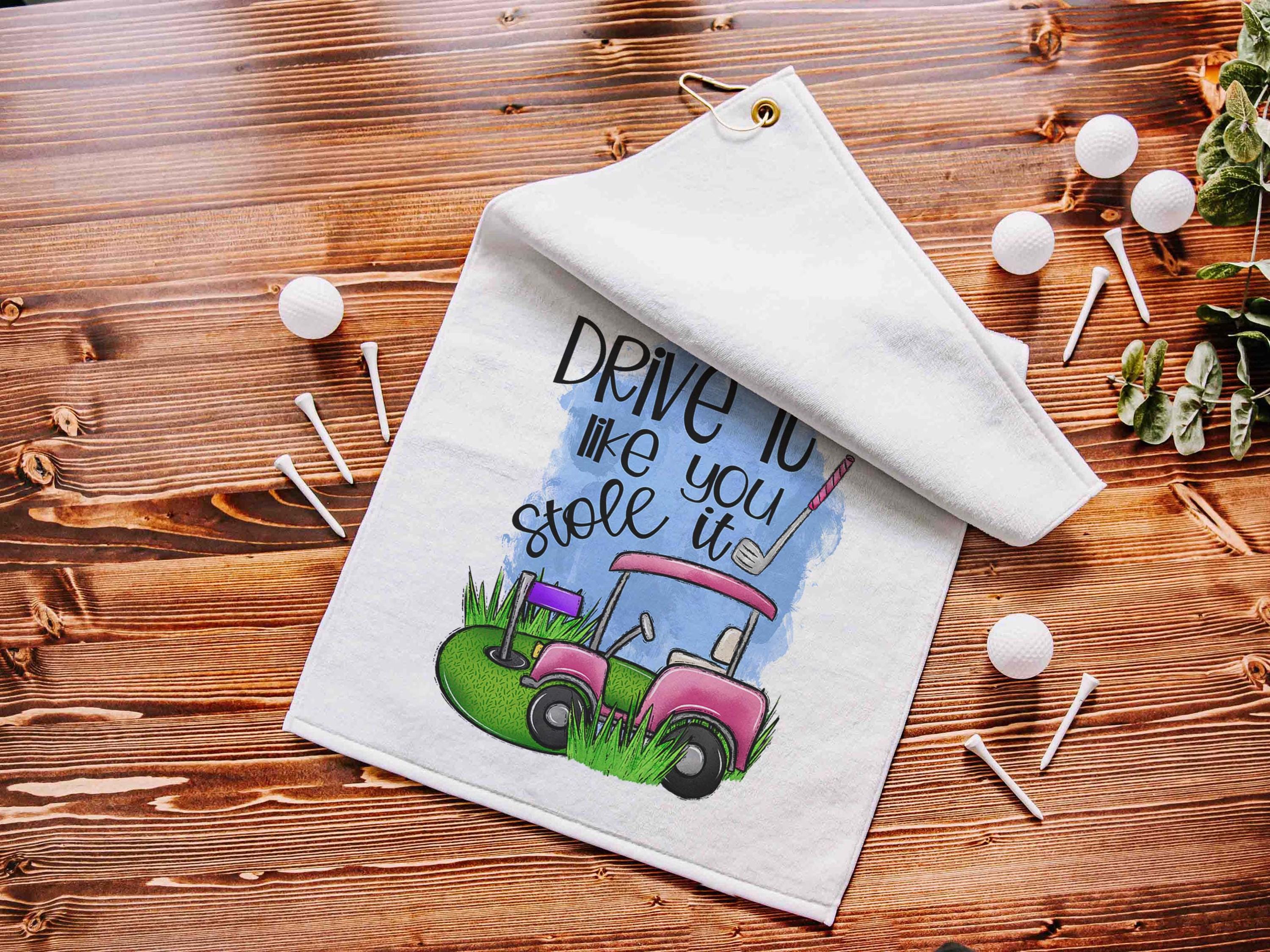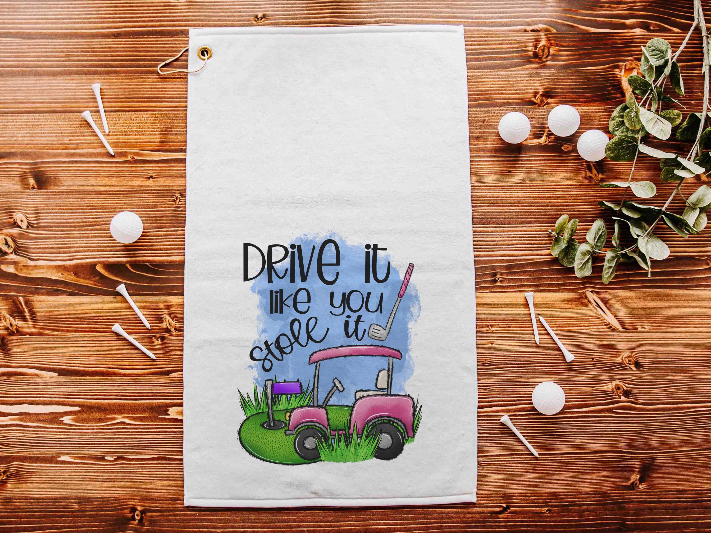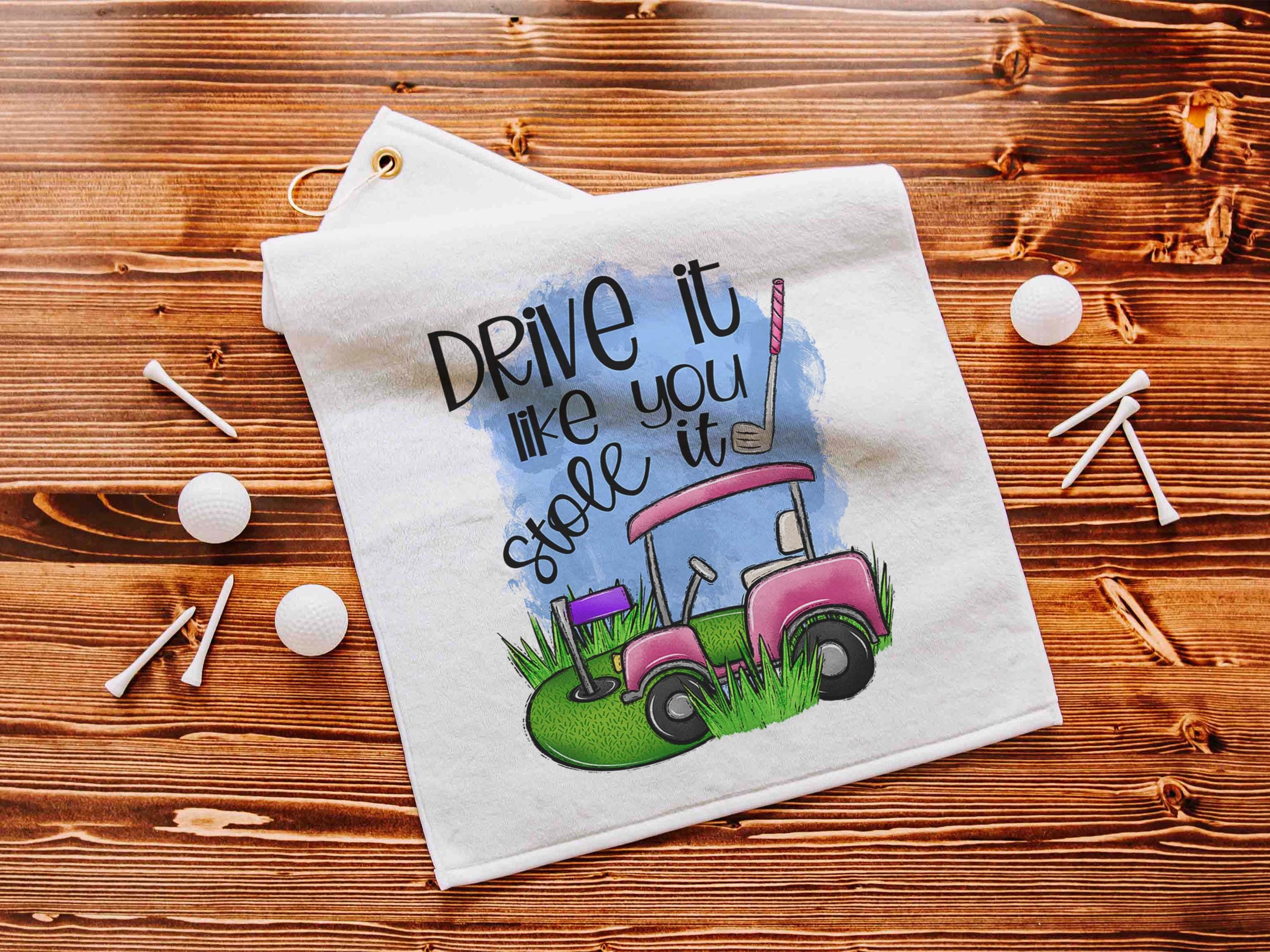 Add some humor to the golf course with our "Drive It Like You Stole It" Golf Towels, complete with a gold grommet and hook for easy attachment to any golf bag. These funny golf bag accessories make the perfect Mothers day gift for golfers or funny golf gifts for coworkers. Each towel measures 16" x 25", featuring a microfiber velour front and a rough back side for scrubbing.