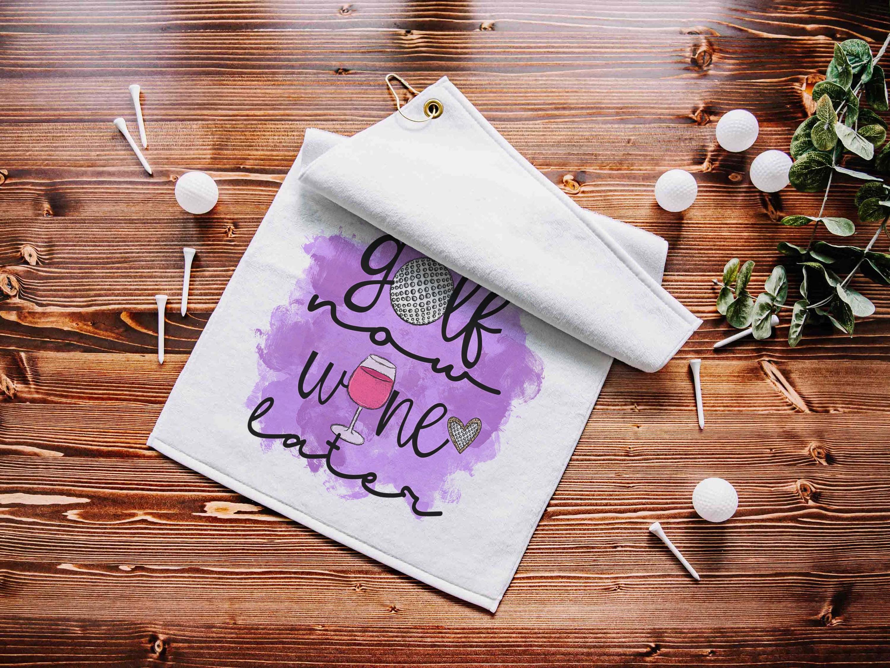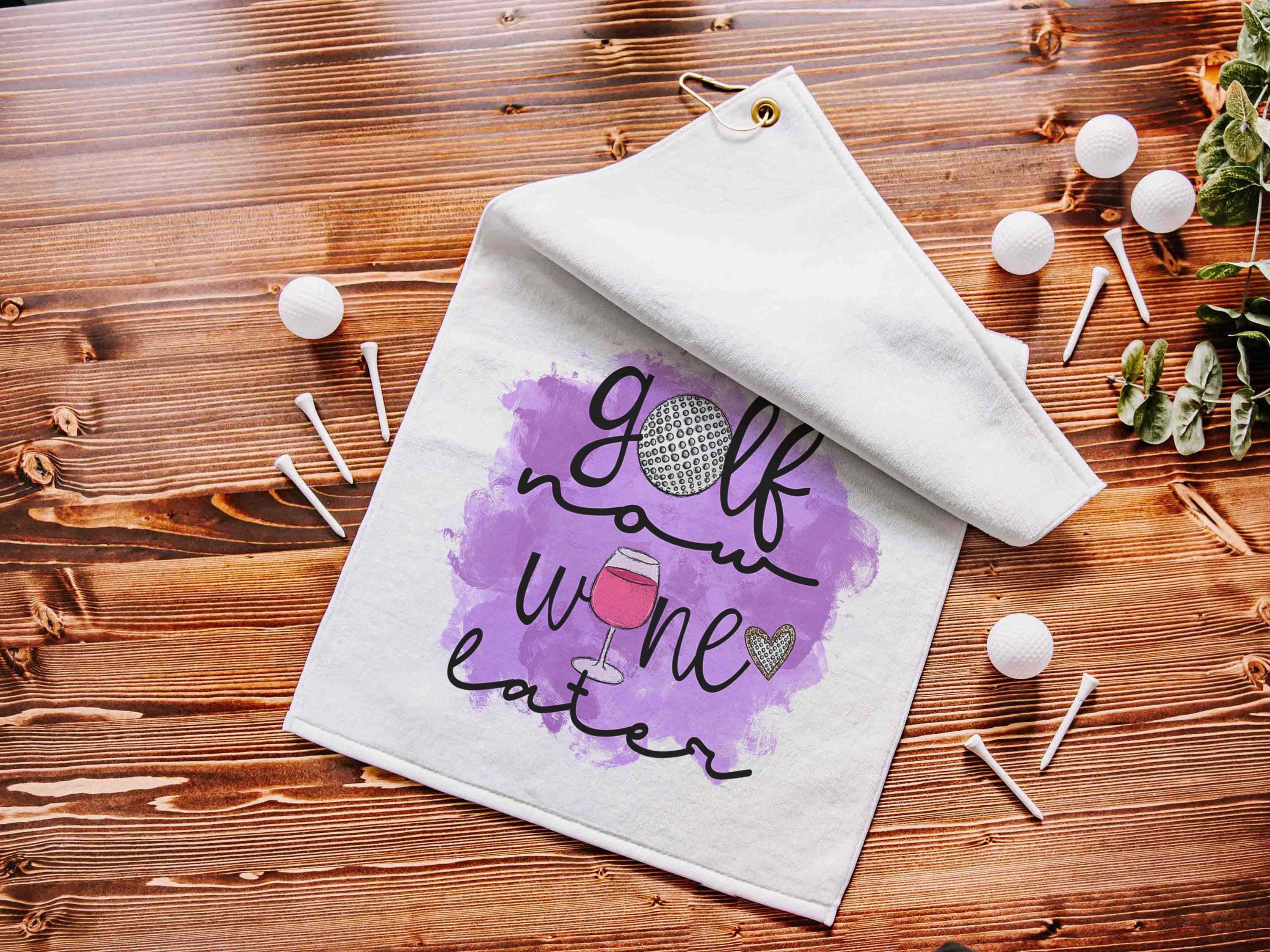 Add some humor to the game with this Golf Now, Wine Later towel—perfect for any lady golfer who loves a good round on and off the course. Designed with a gold grommet and hook for easy attachment, this 16" x 25" microfiber velour towel is soft on one side and features a textured back for scrubbing clubs clean. A fun and functional gift for golf lovers, wine enthusiasts, and friends who enjoy both!