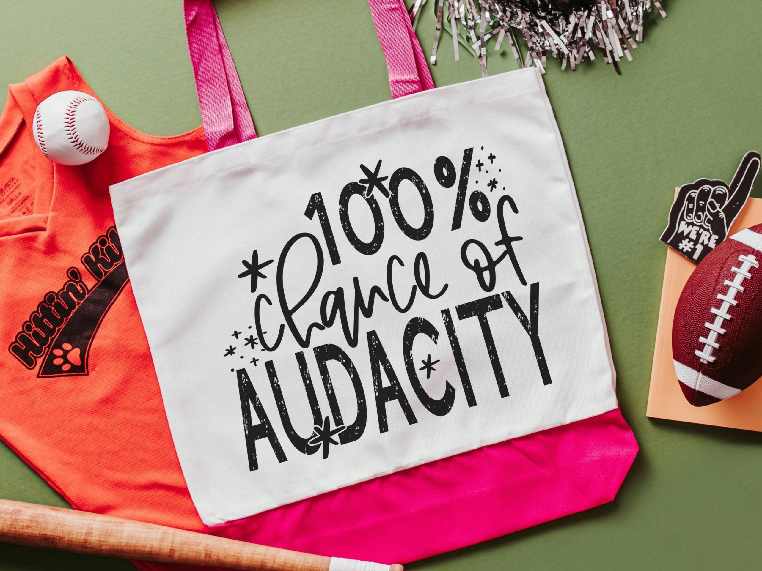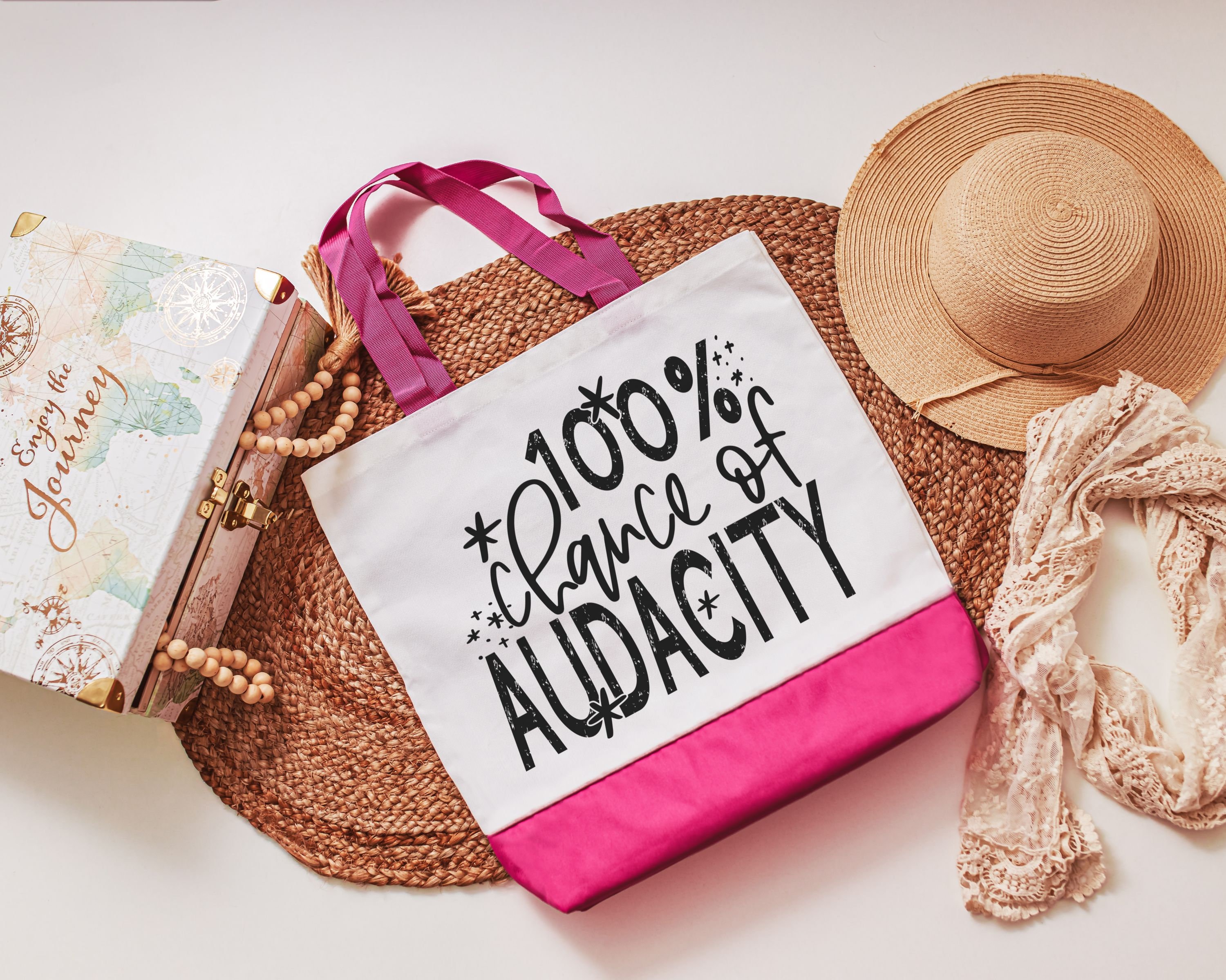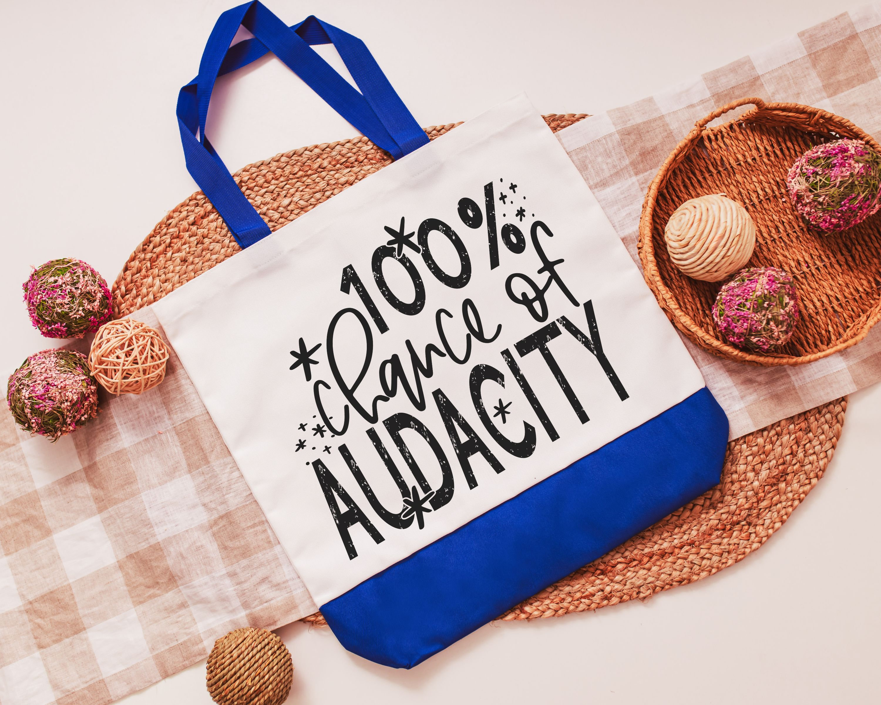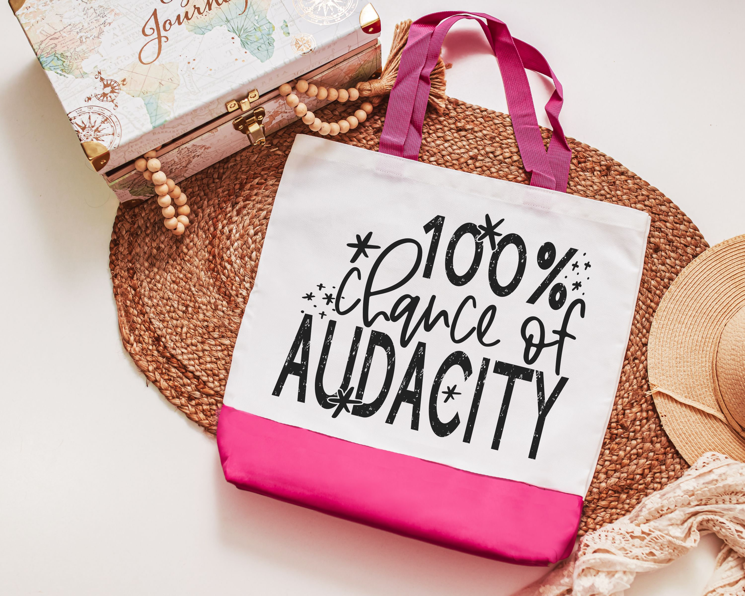 Add a funny touch to her style with our "100% Chance of Audacity" tote bag. Perfect for year round, this reusable shopping bag makes a sassy and sarcastic gift for friends. Ideal for best friend birthday gifts, this tote bag combines practicality with a sense of humor. Whether for her daily errands or a fun day out, this bag is a standout choice for any audacious woman.