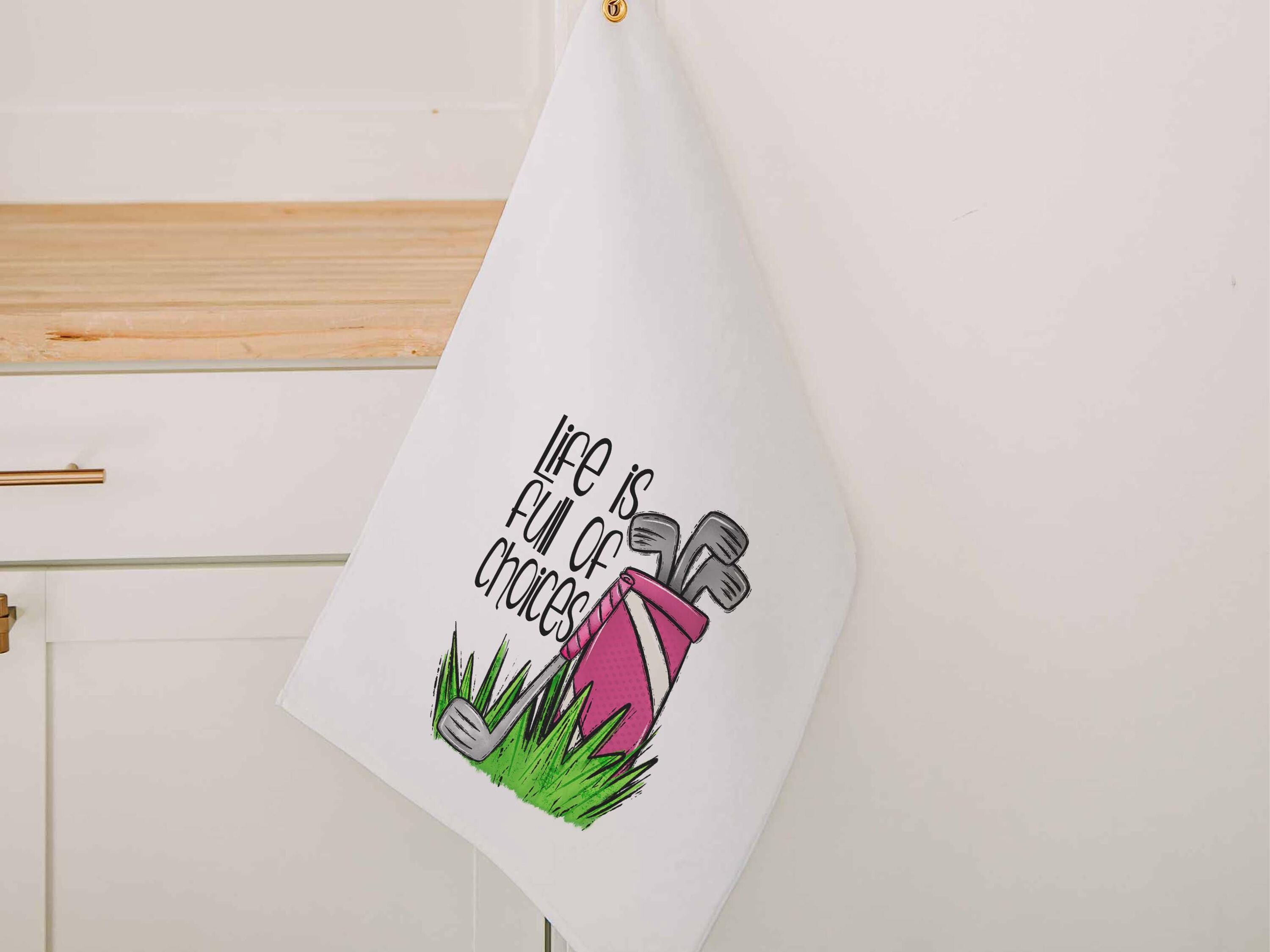 Perfect for lady golfers, the "Life is Full of Important Choices" golf towel with a grommet combines humor and practicality. This golf bag towel makes a cute golf gift. Each towel measures 16" x 25" and features a gold grommet and hook for easy attachment. Made from soft microfiber velour on the front and a rough finish on the back for scrubbing and cleaning, it's machine washable for convenience.