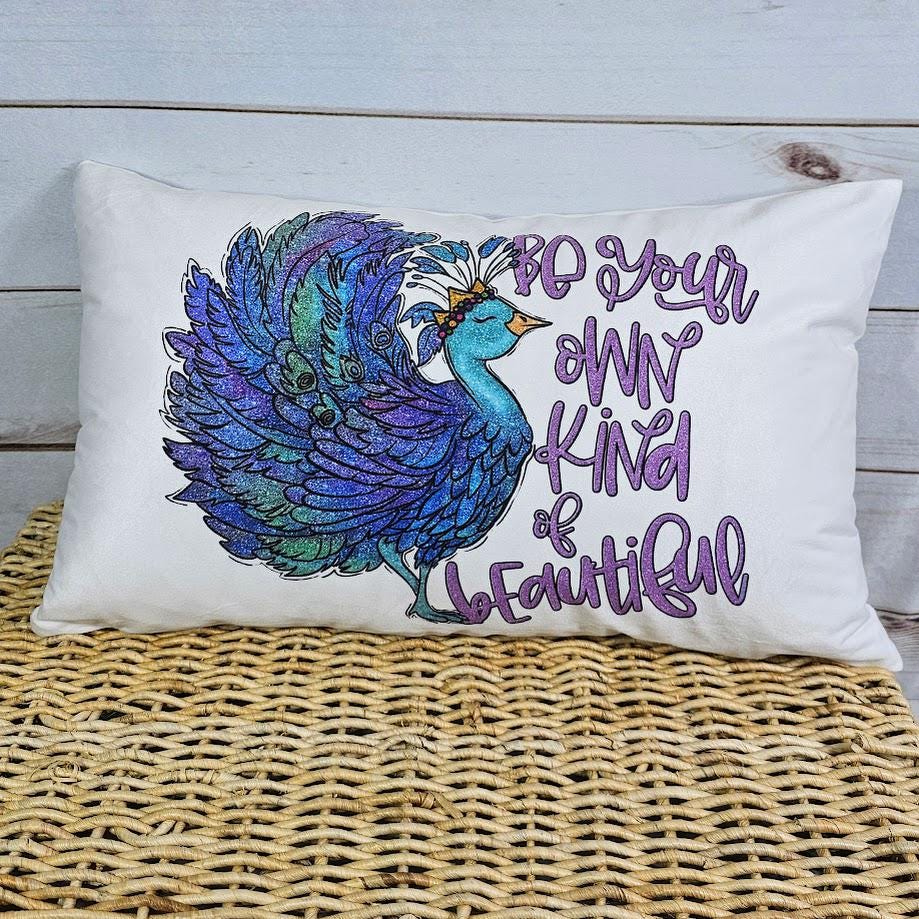 be your own kind of beautiful lumbar pillow for bed, cute dorm decor for girls, positive affirmations for teens, peacock throw pillow