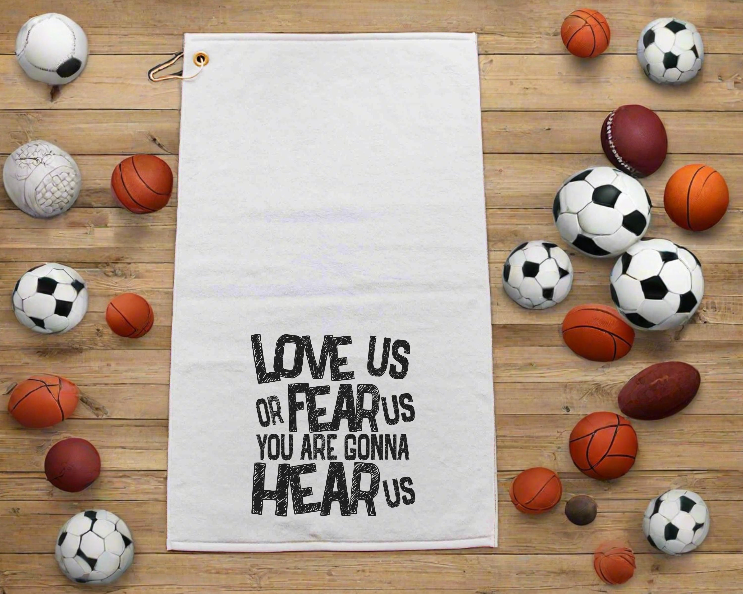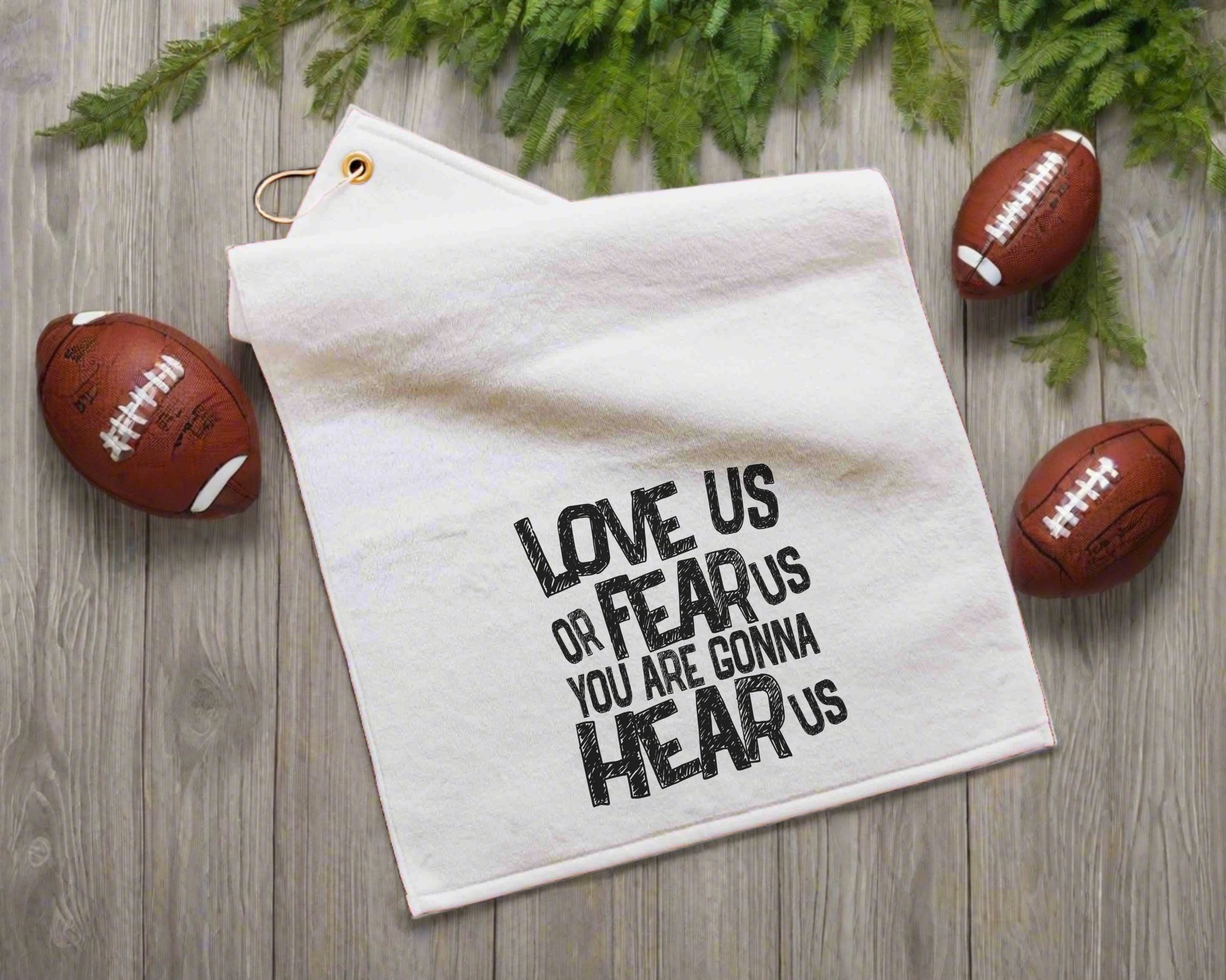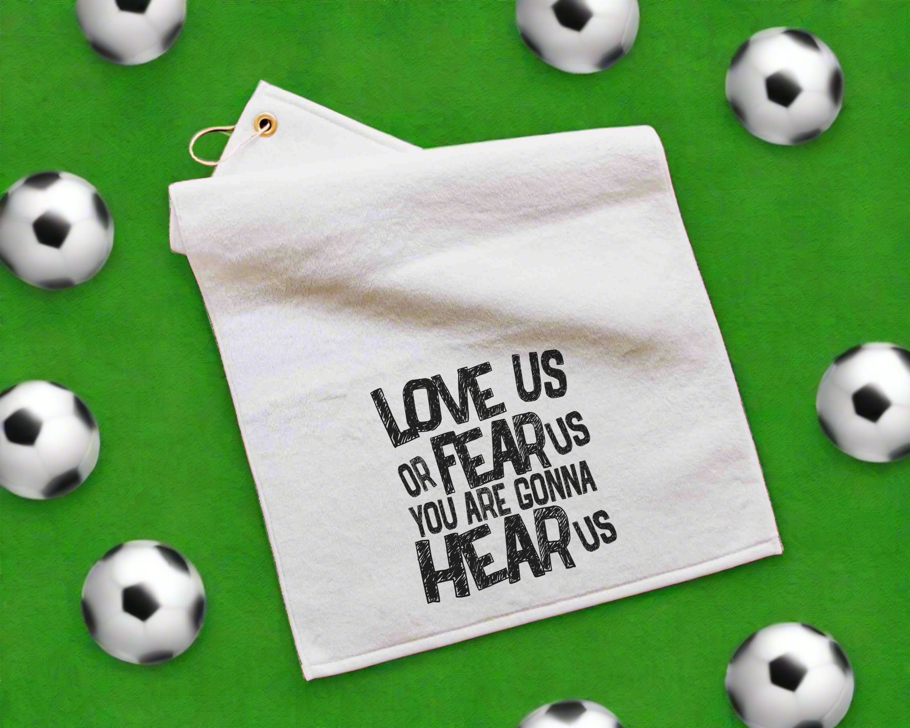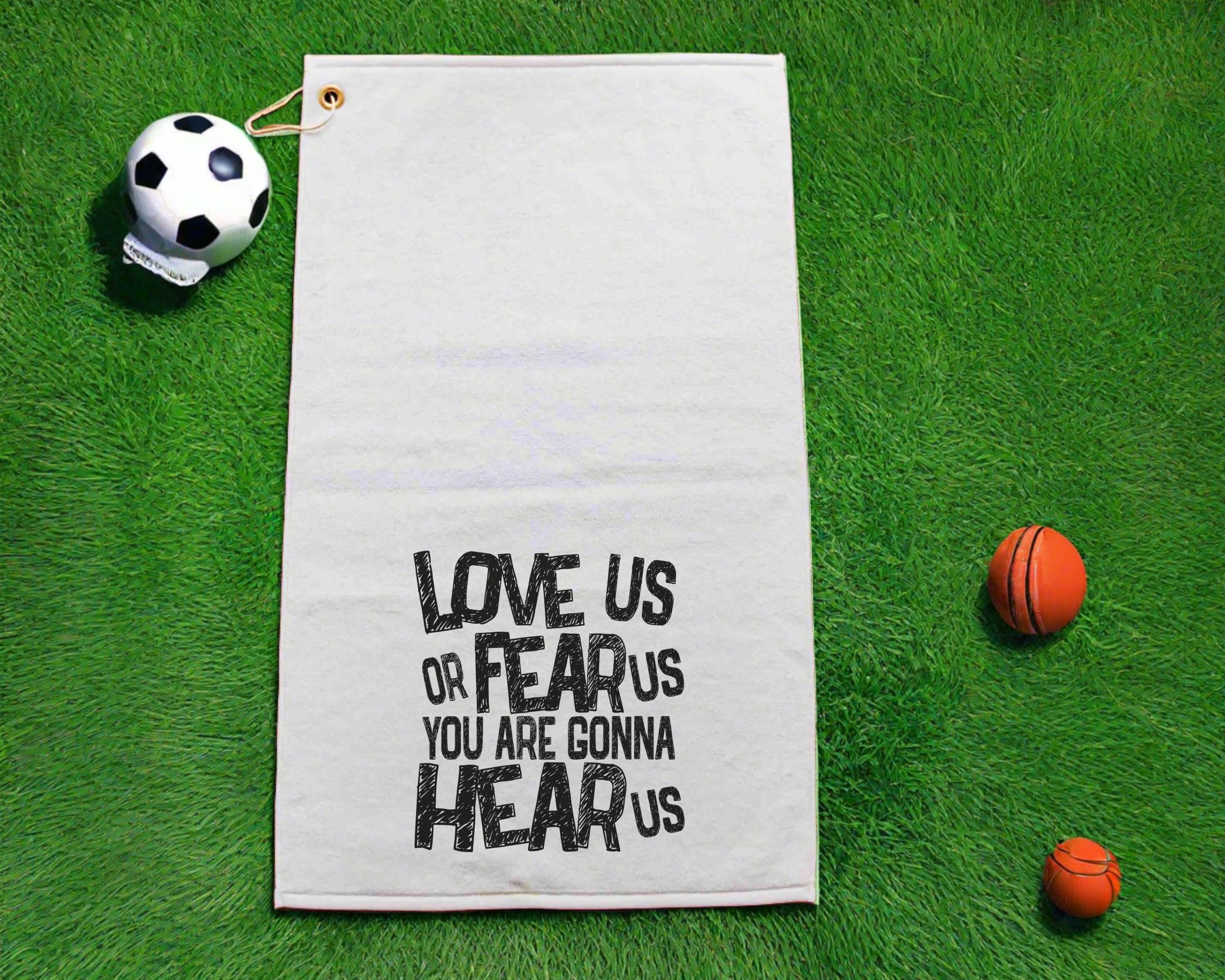 Perfect for the sports enthusiast, the "Love Us or Fear Us, You Are Gonna Hear Us" rally towel is an excellent gift for baseball moms, football dads, and sports coaches. Ideal as a sports duffle bag accessory or golf towel with grommet, this towel combines functionality and fun. Each towel measures 16" x 25" and features a gold grommet and hook for easy attachment. The front is made of soft microfiber velour, while the back side has a rough finish for scrubbing and cleaning. Machine washable for convenience, this rally towel makes a great addition to any game day or sports event.