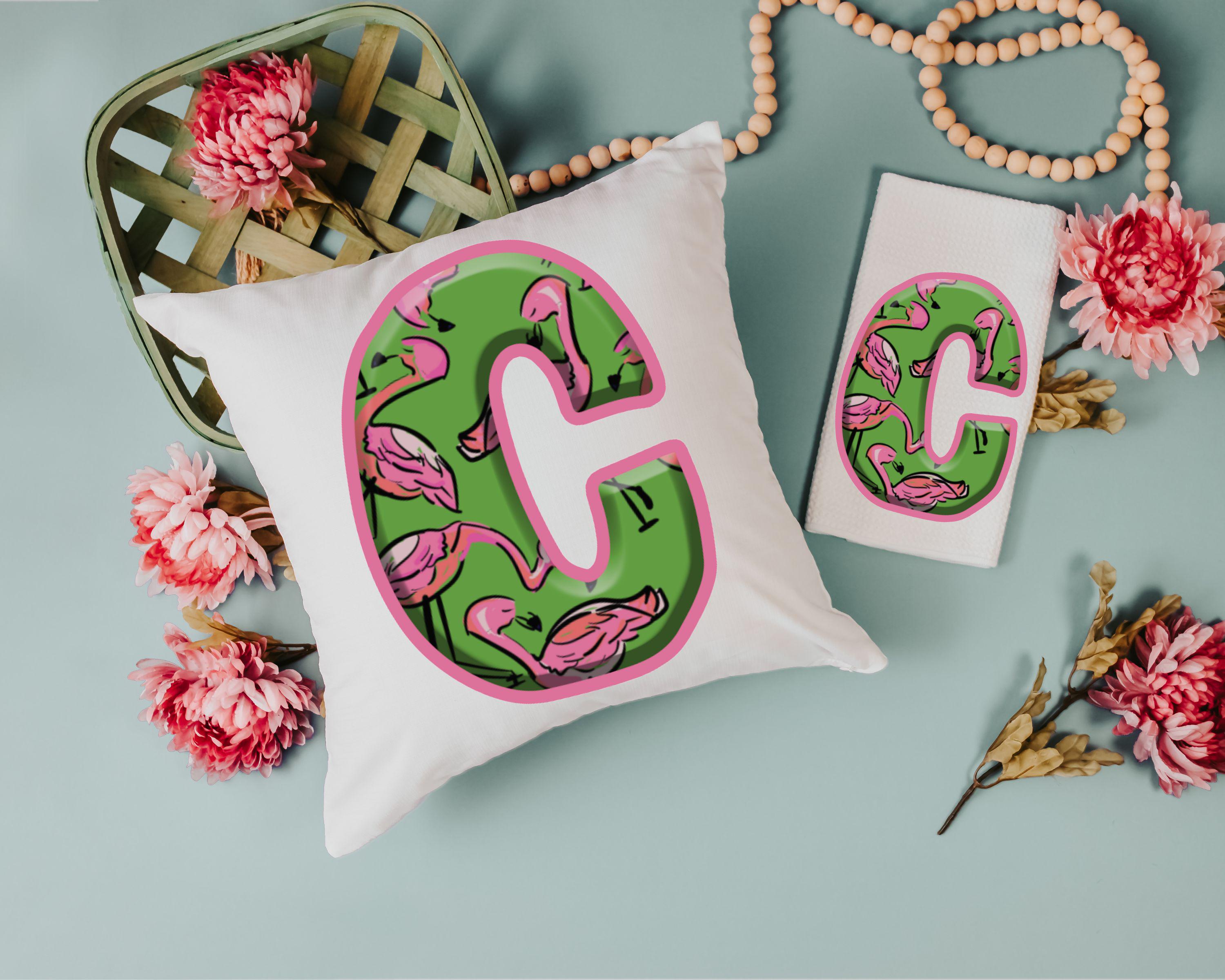 Add a personal touch to your holiday decor with our personalized flamingo ornament. This initial ornament is perfect for your tree and makes a cute flamingo gift. Ideal for tropical Christmas decorations, it also doubles as a flamingo car charm for the rear view mirror. Celebrate the season with these unique and stylish Christmas ornaments. Purchase the ornament, towel, and pillow separately or as a set.