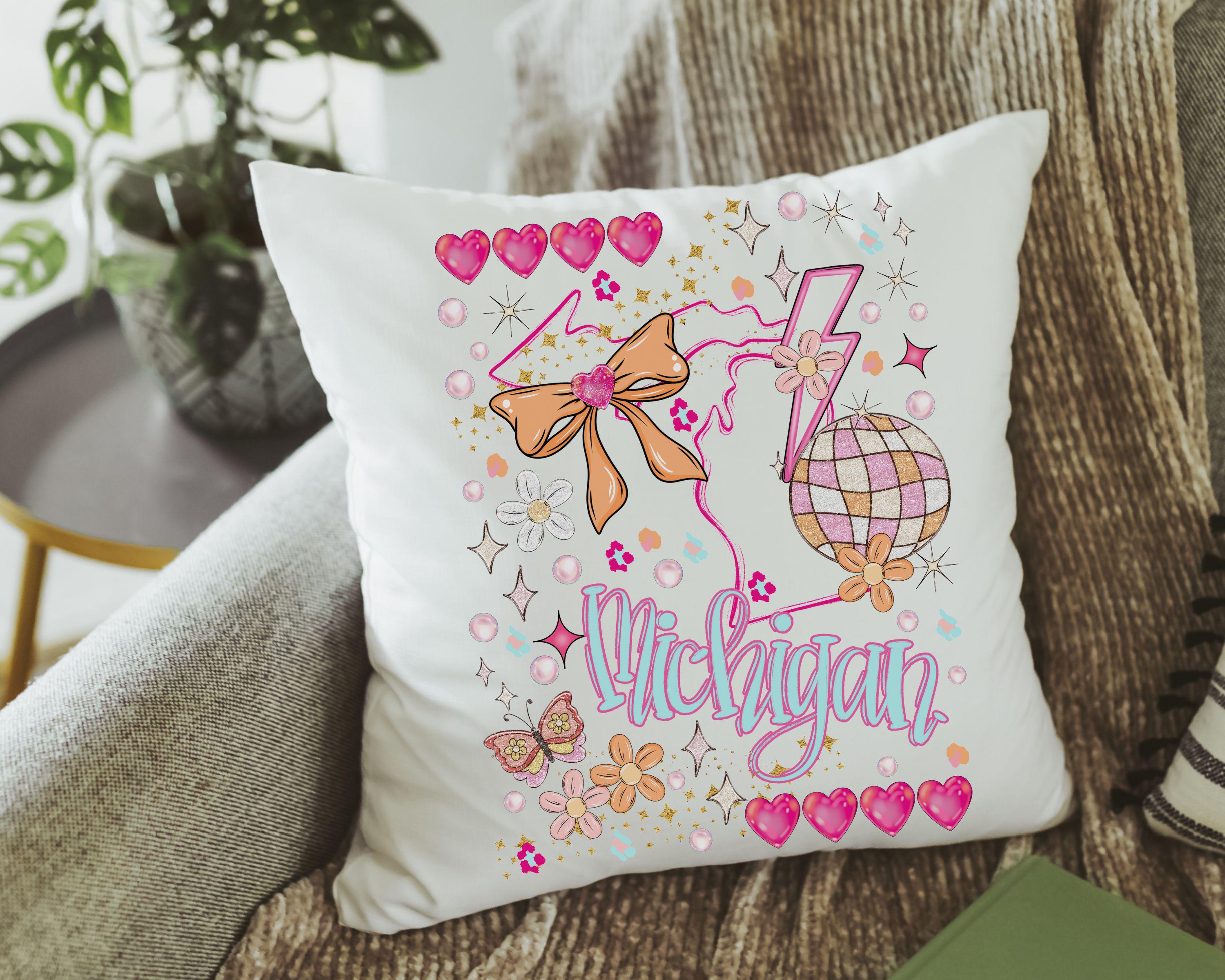 custom state throw pillow for bed, Indiana gifts, preppy stuff for teens, coquette room decor, college dorm gifts for girls, pink preppy