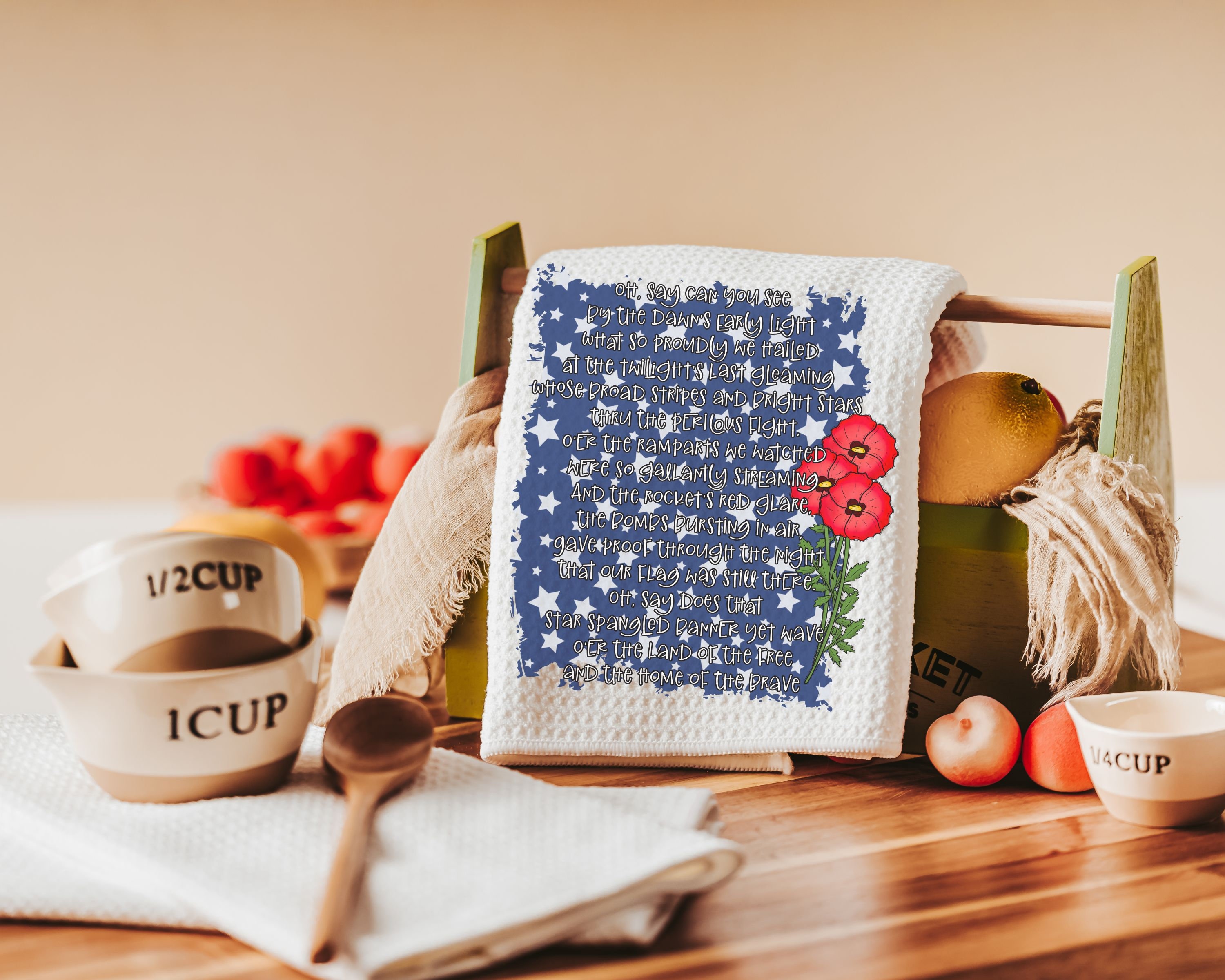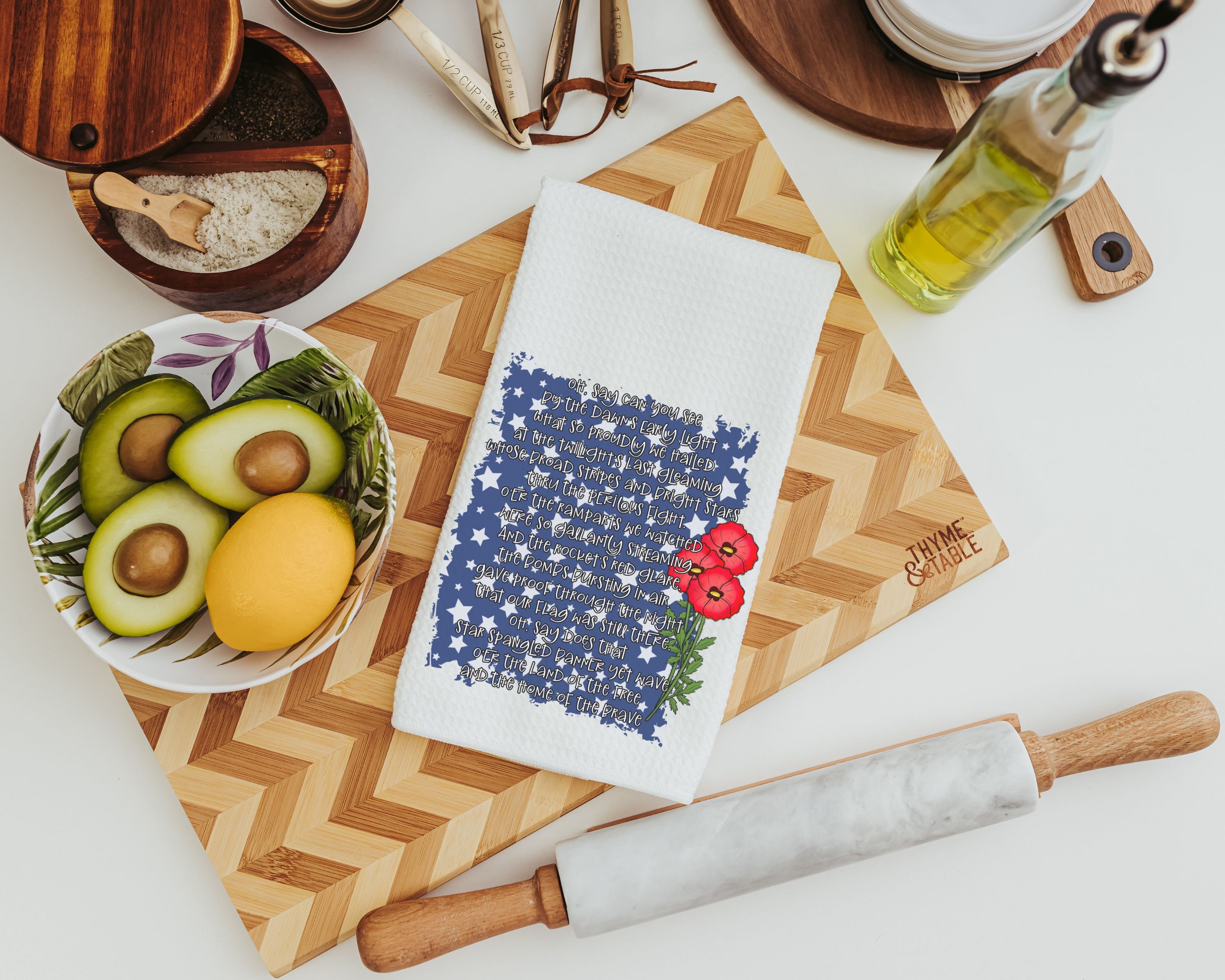 star spangled banner print patriotic kitchen towel for summer, 4th of July hand towels for women, Americana kitchen decor, red poppy floral