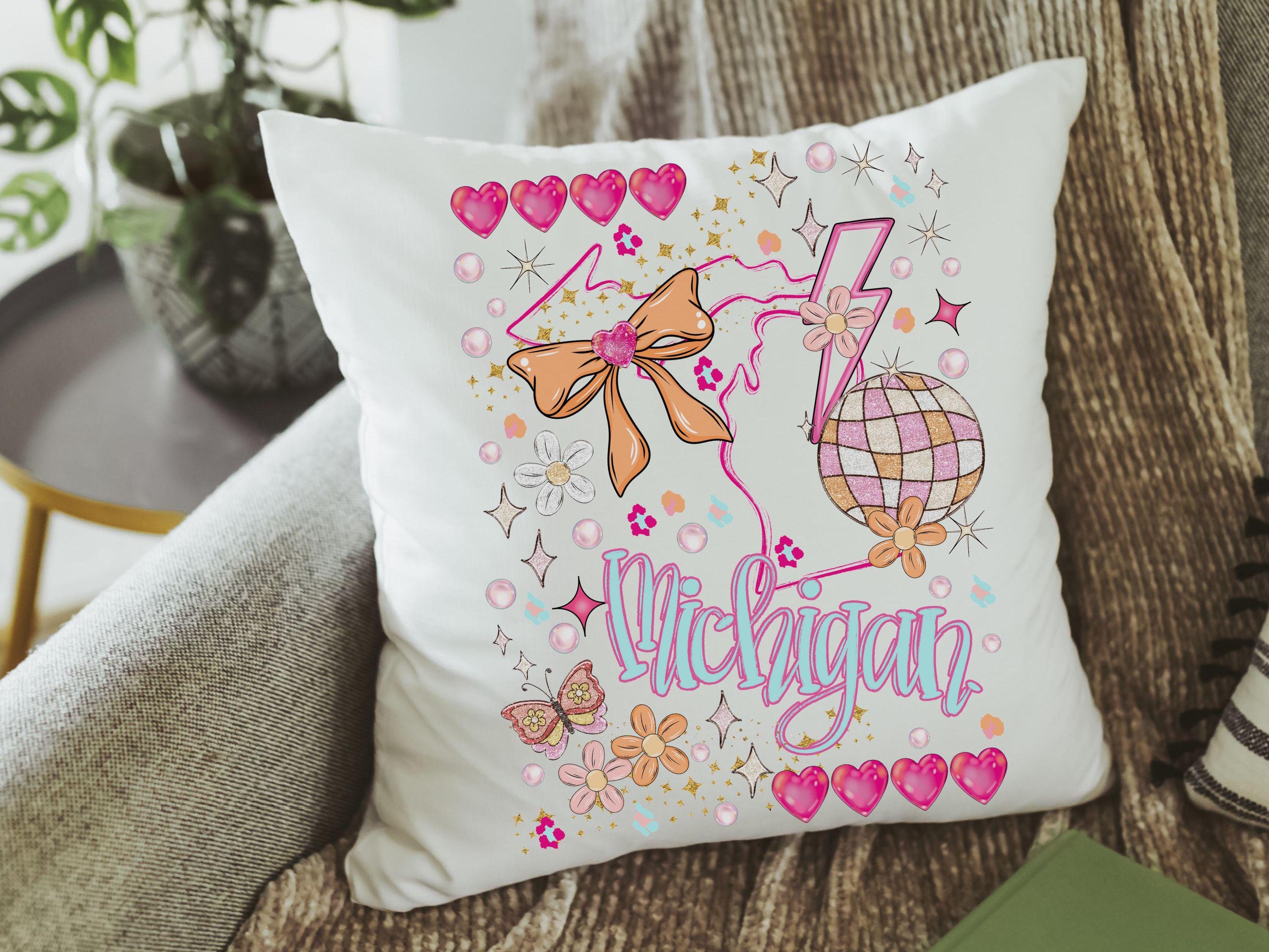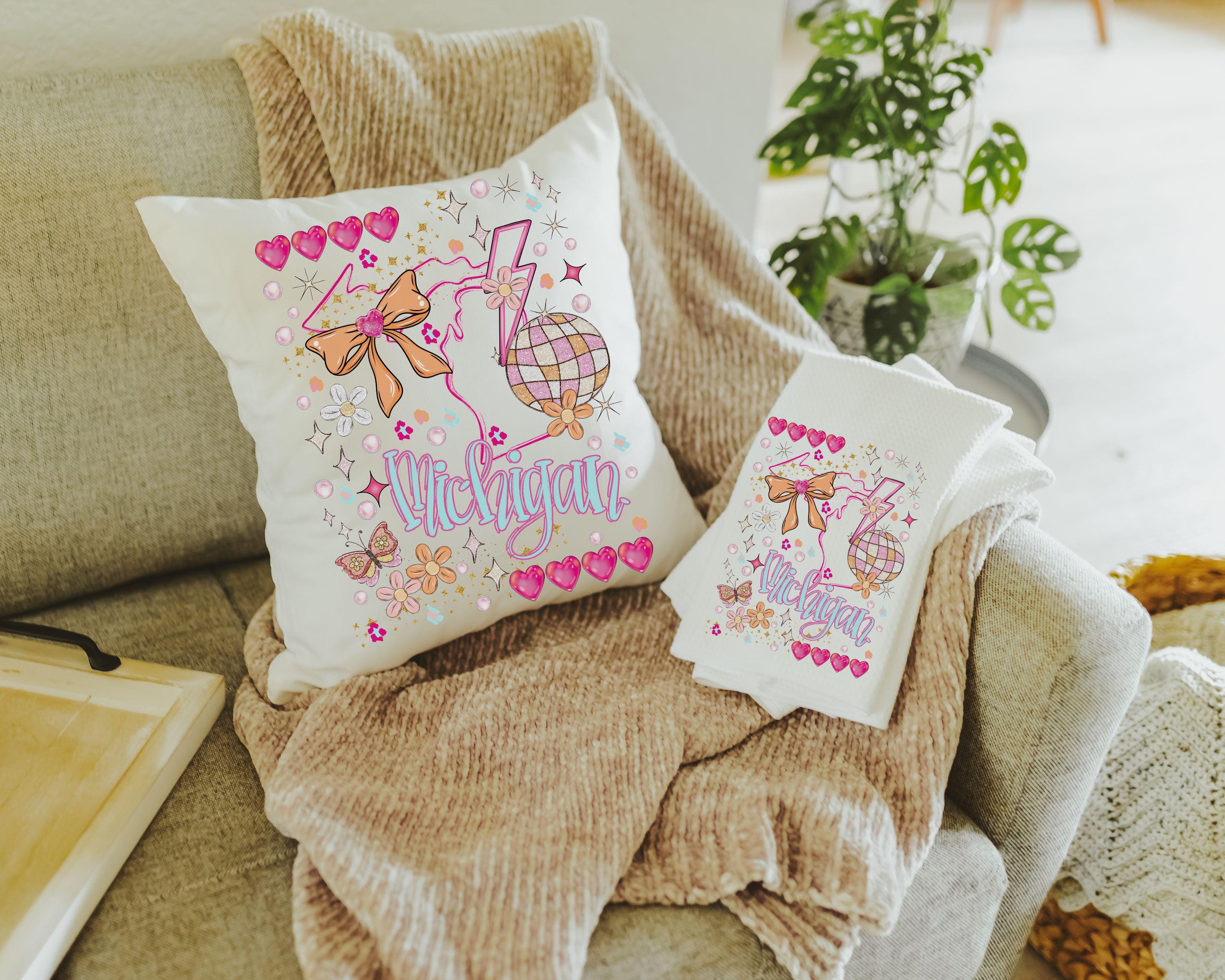 Add a personal touch to your space with our custom state pink preppy pillows. Perfect for dorm decor for college girls and preppy stuff for teens, these Michigan coquette room decor pieces make stylish state throw pillows for the bed. Celebrate state pride with these charming and trendy pillows, ideal for girls who love unique and personalized decor. Purchase the matching towel or a pillow and towel set to complete the look.