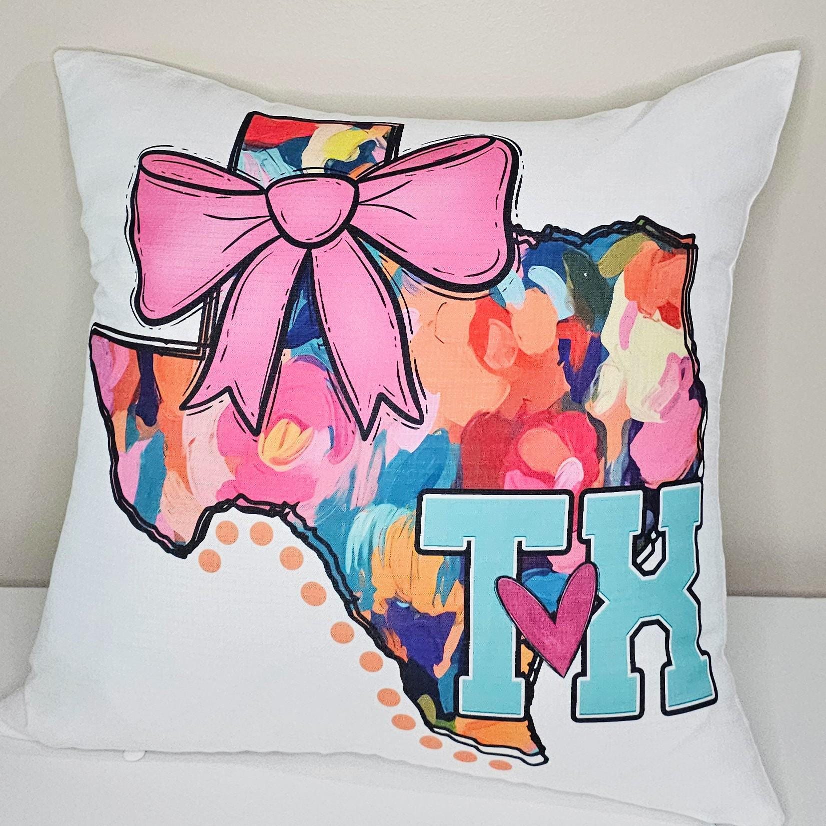 watercolor Texas throw pillow for bed cute Texas coquette kitchen towels for gift, floral Texas gifts for her, pink bow pillow cover 18 x 18
