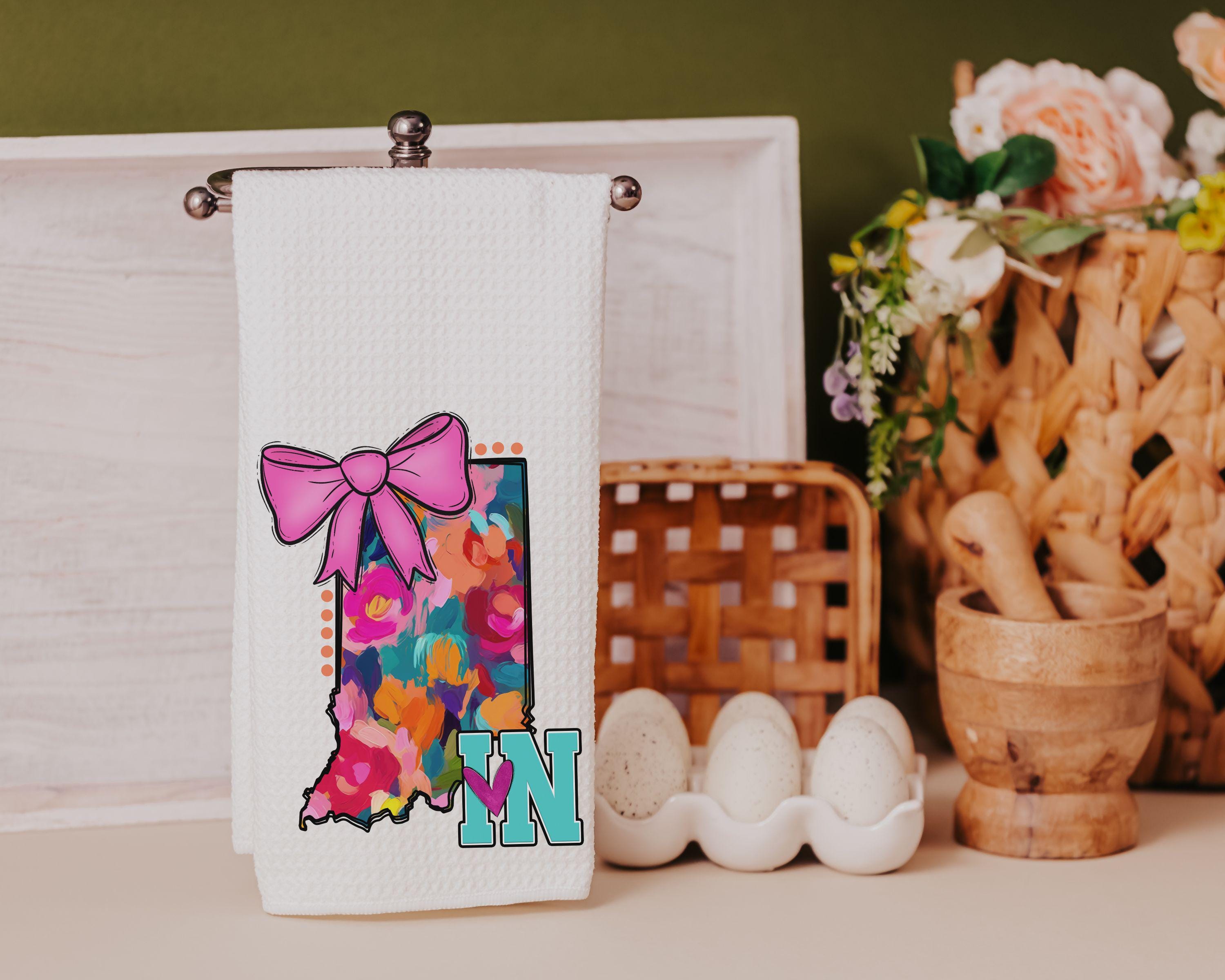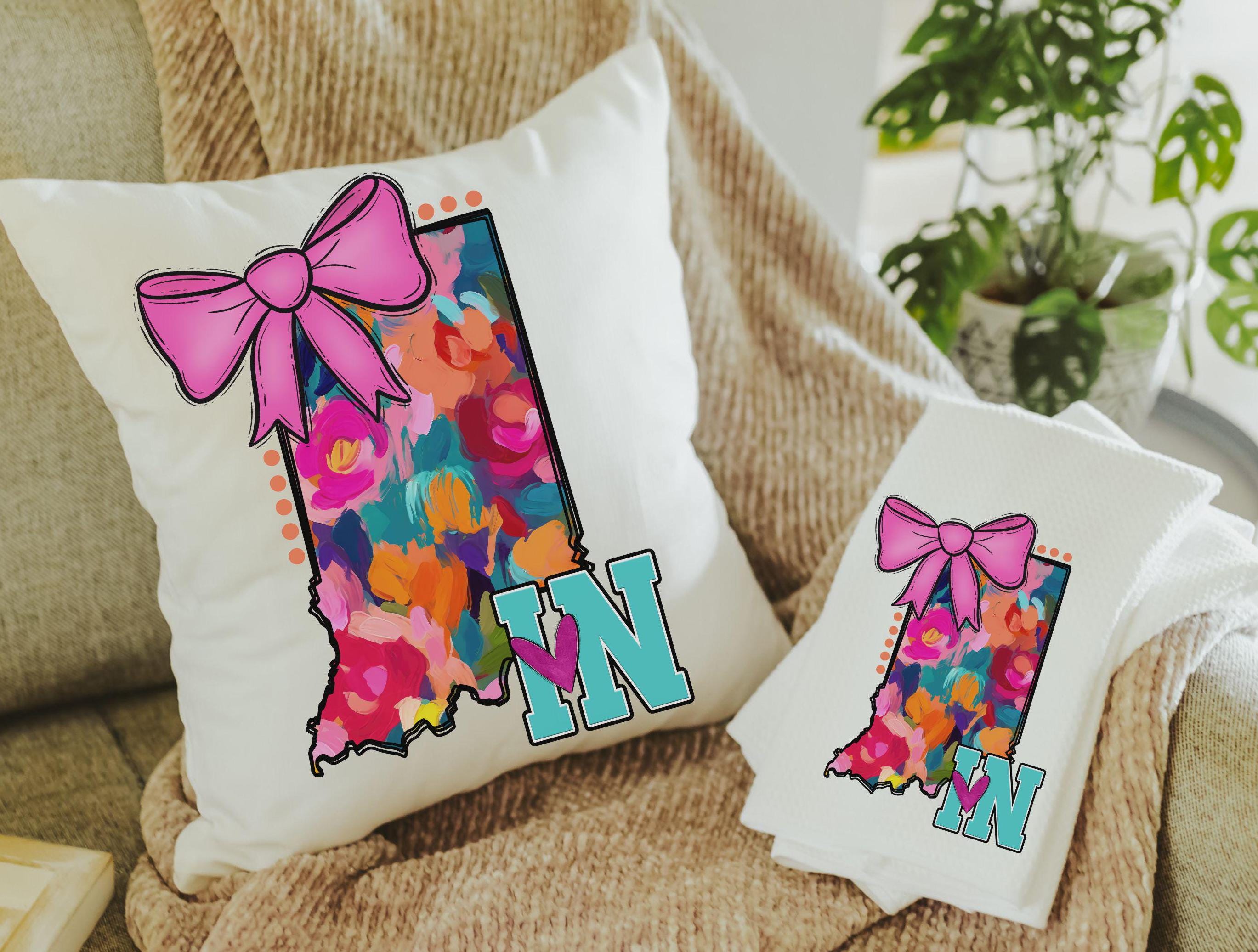 Add a touch of Hoosier pride to any space with our Indiana pillow, perfect for dorm rooms. Featuring a beautiful watercolor floral design and a pink coquette bow, this throw pillow is a beautiful addition to your decor. Pair it with our matching kitchen towels for a thoughtful gift set, ideal for Bloomington, South Bend, or Fort Wayne Indiana gifts. Whether you're preparing a college care package or decorating a cozy dorm room, these items make perfect keepsakes. Purchase the pillow and towel separately or as a set.