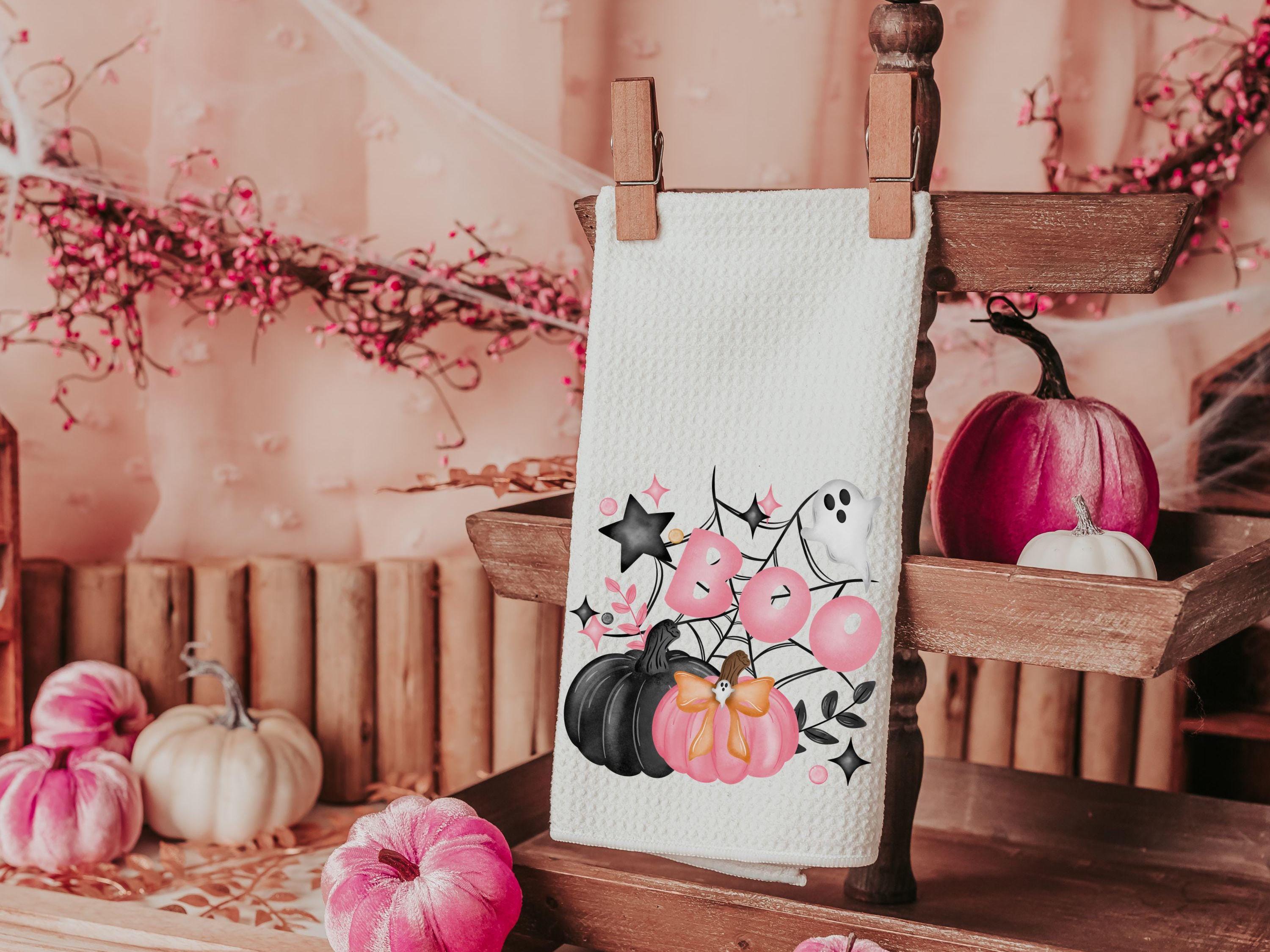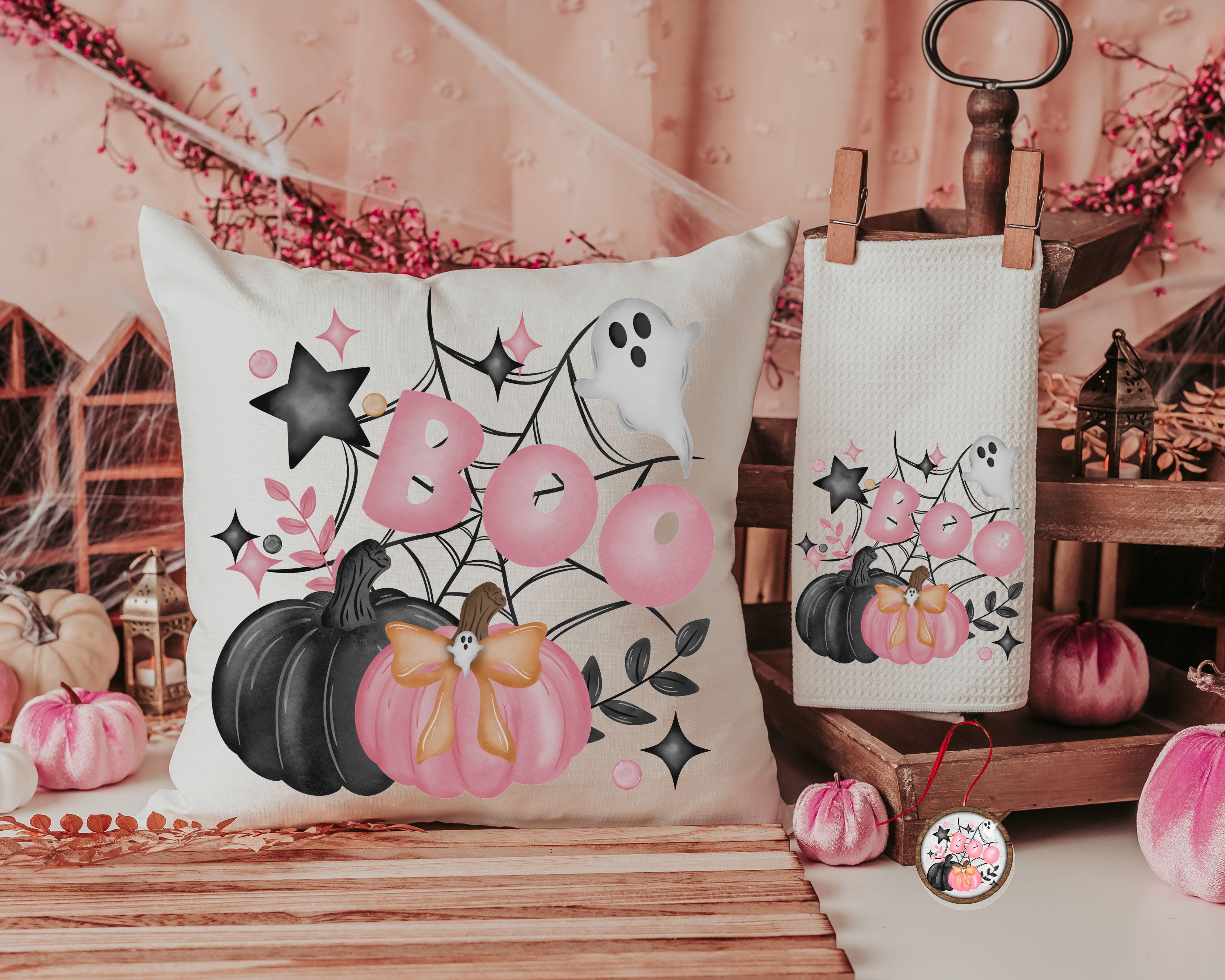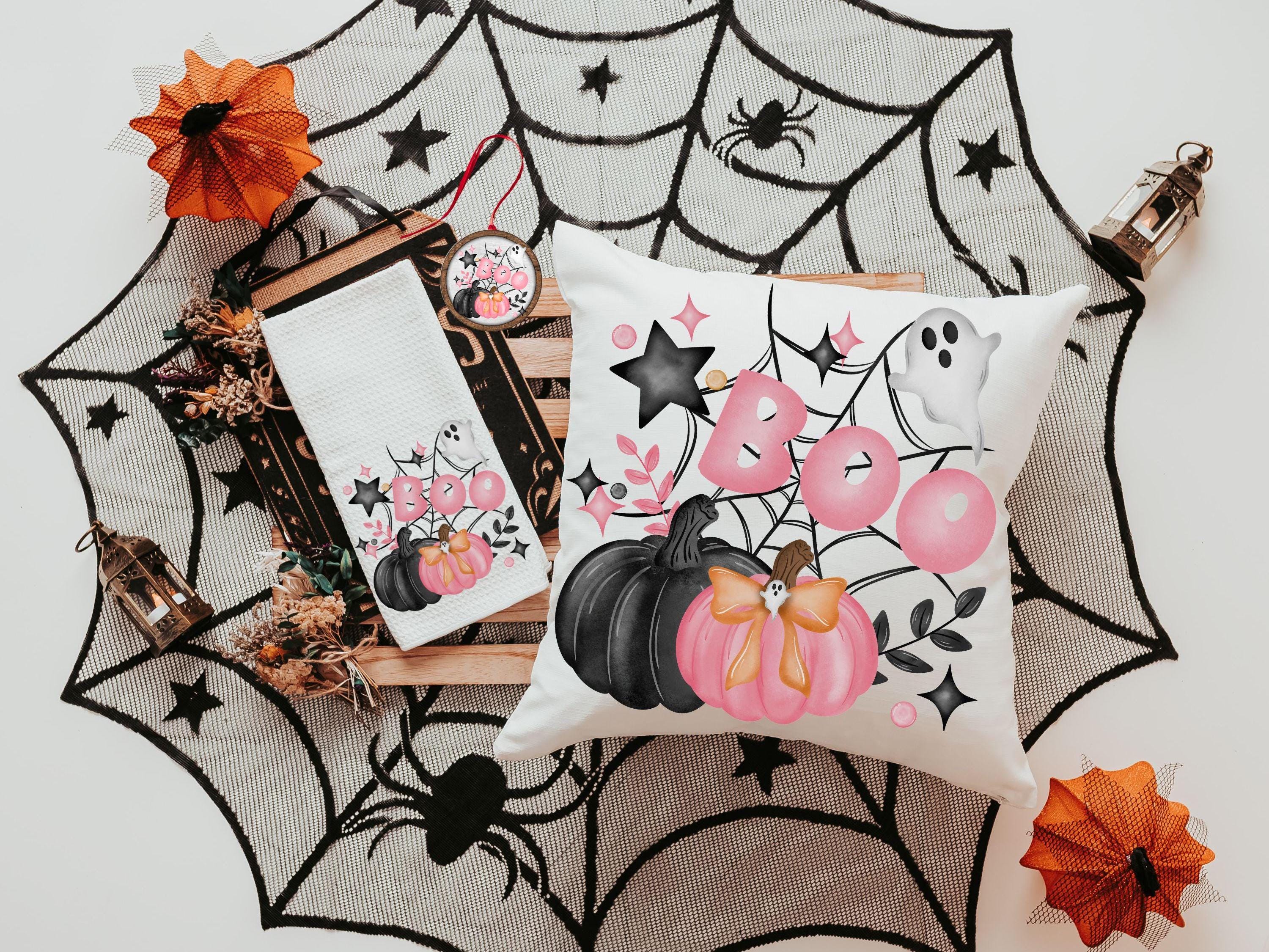 Add a little girly goth flair to spooky season with this Boo coquette Halloween collection. Featuring a cute ghost ornament perfect as a boo basket tag, a matching towel, and a throw pillow, it’s a cute way to dress up your Halloween decor. Great Halloween gifts for adults who love a softer, playful vibe. Purchase each piece separately or save with the full set.