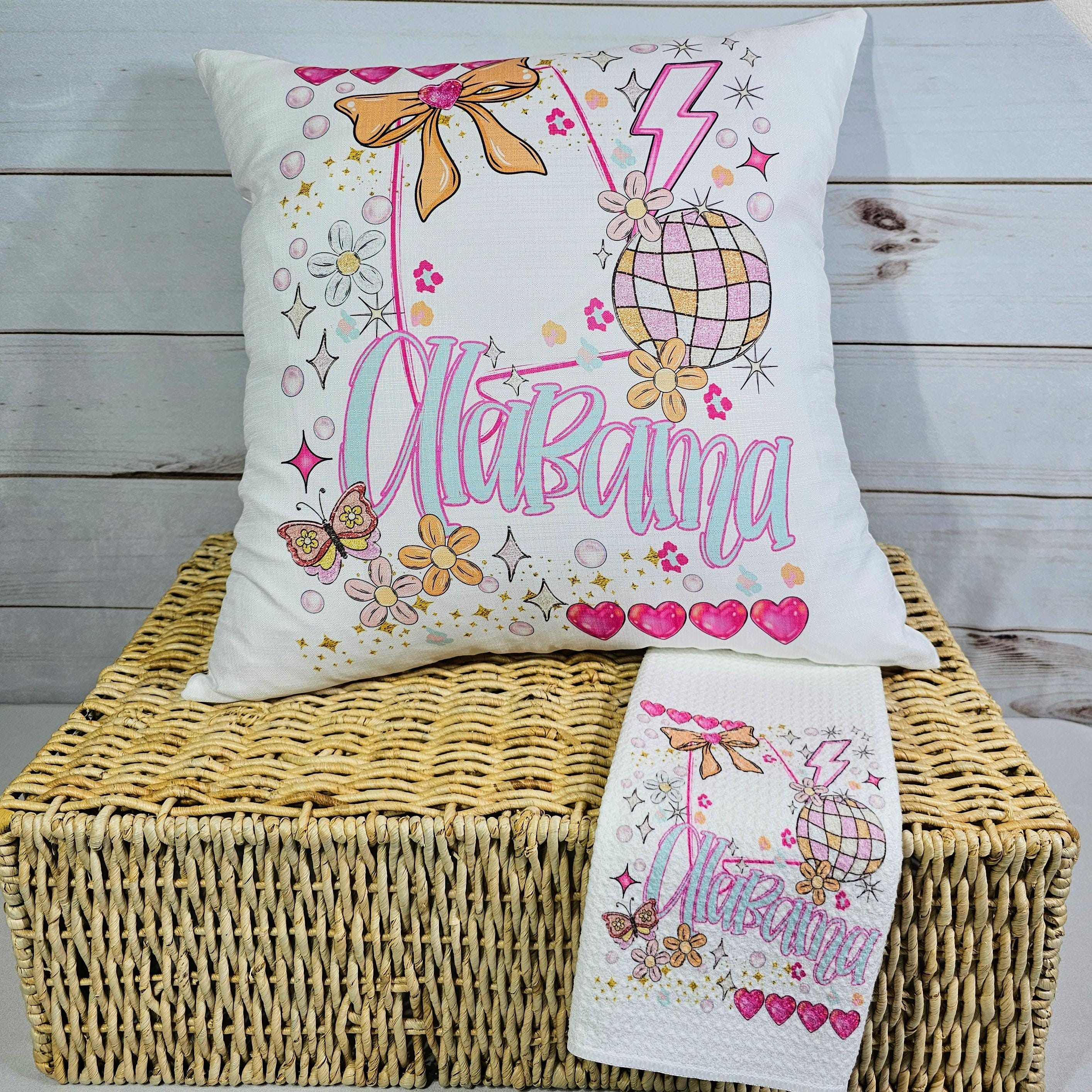 A chic way to celebrate Kansas pride or any state, this custom pillow and matching towel set adds a preppy touch to any bedroom, bathroom, or college apartment. Designed for girls who love stylish home decor, these pieces make great Kansas gifts for students, new homeowners, or anyone wanting a coquette-inspired accent. Available individually or as a complete set.
