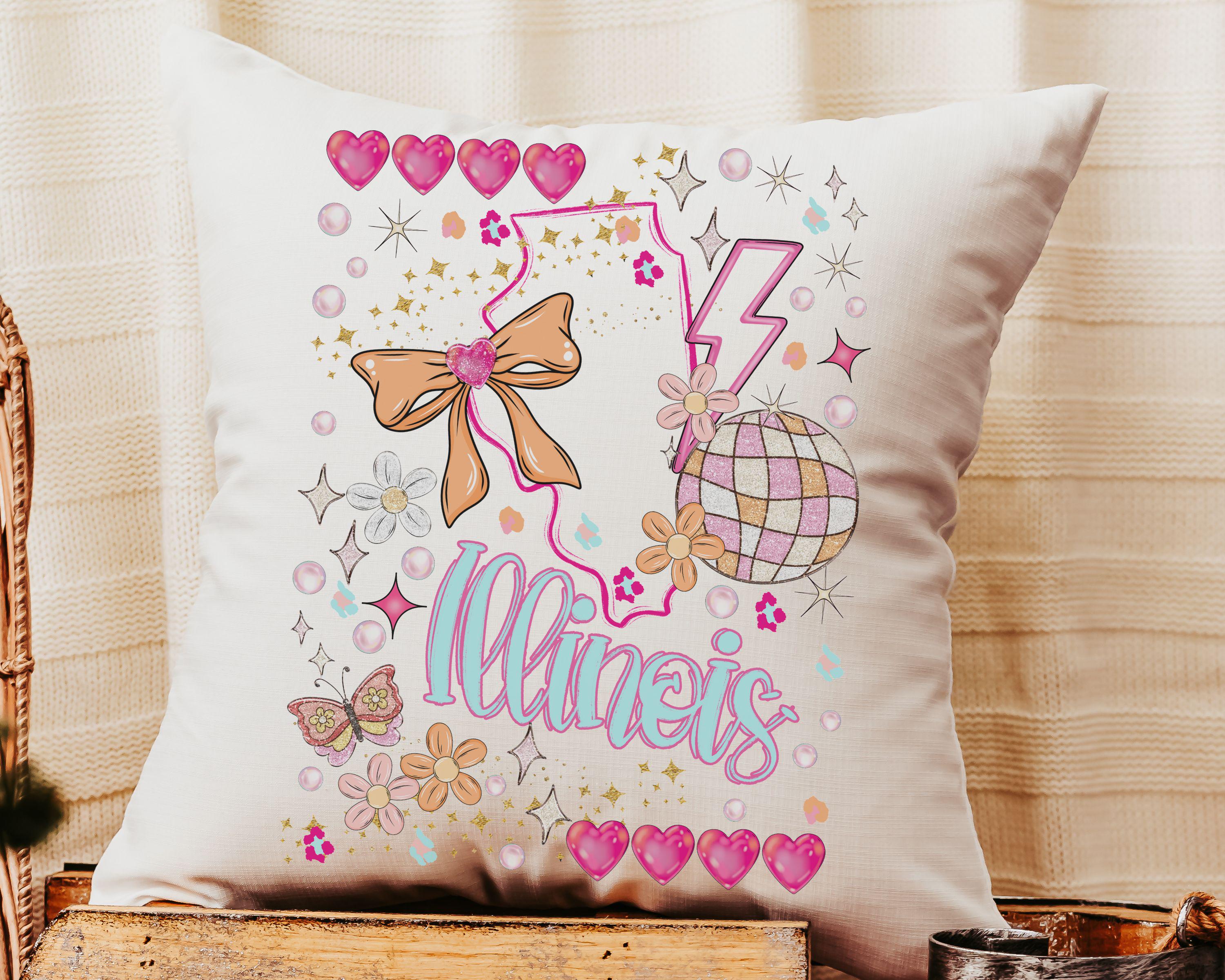 A fun gift for college send-offs or new adventures in the Prairie State. This Illinois pillow and matching towel bring a touch of home to dorm rooms, first apartments, or city kitchens. Featuring a coquette style with a preppy look—perfect for anyone headed to Chicago, Aurora, Joliet, or beyond. Purchase each piece separately or save when you grab the matching set.