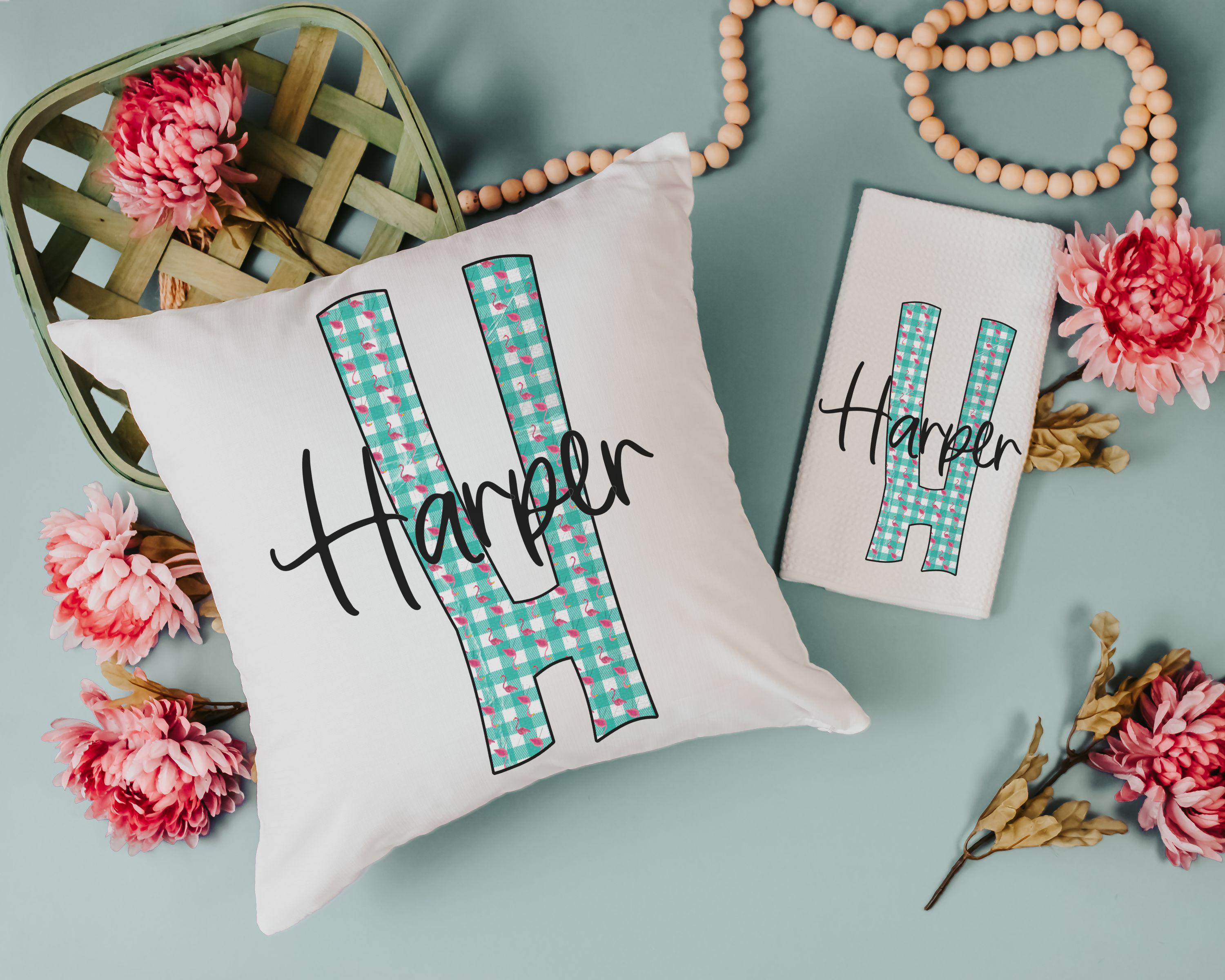Add a splash of fun to your home with our Personalized Turquoise Gingham Kitchen Towels with Pink Flamingos. Perfect for gifts, these cute initial dish towels are great for the kitchen or as hand towels for the bathroom. A matching throw pillow is also available to complete the look. Ideal for beach house decor, first apartment gifts, or simply to brighten up your space, each item can be purchased individually or as part of a set, making it a unique and thoughtful gift. Perfect for both kitchen and bathroom decor.