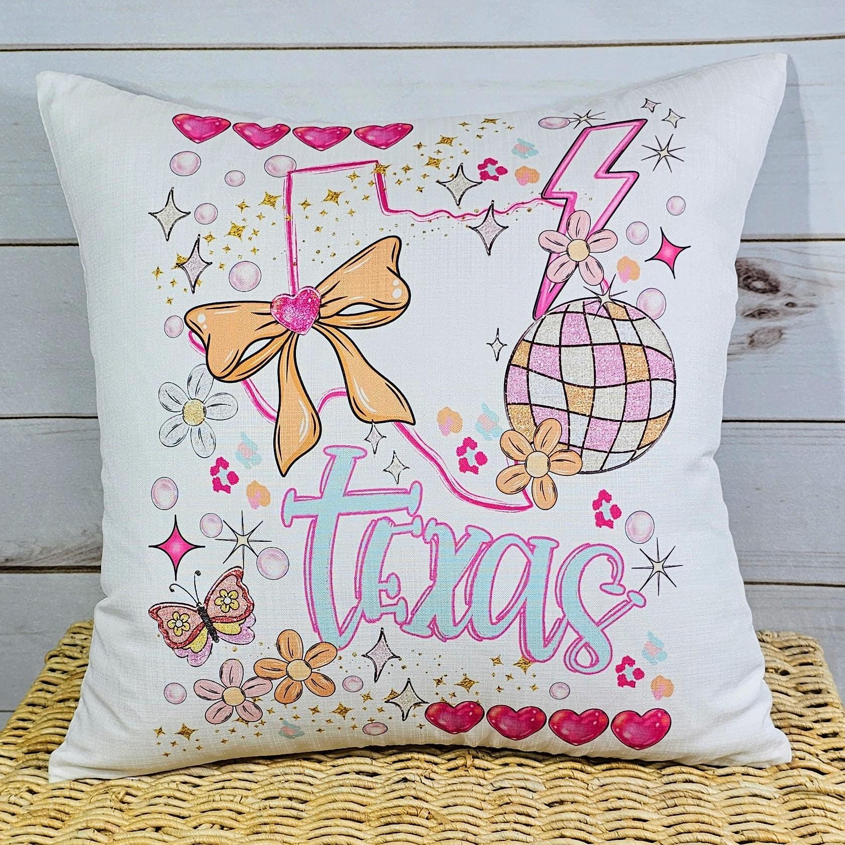 custom Texas throw pillow for bed, Texas gifts, coquette kitchen towels, cute Texas college care package for her, pink preppy pillows for