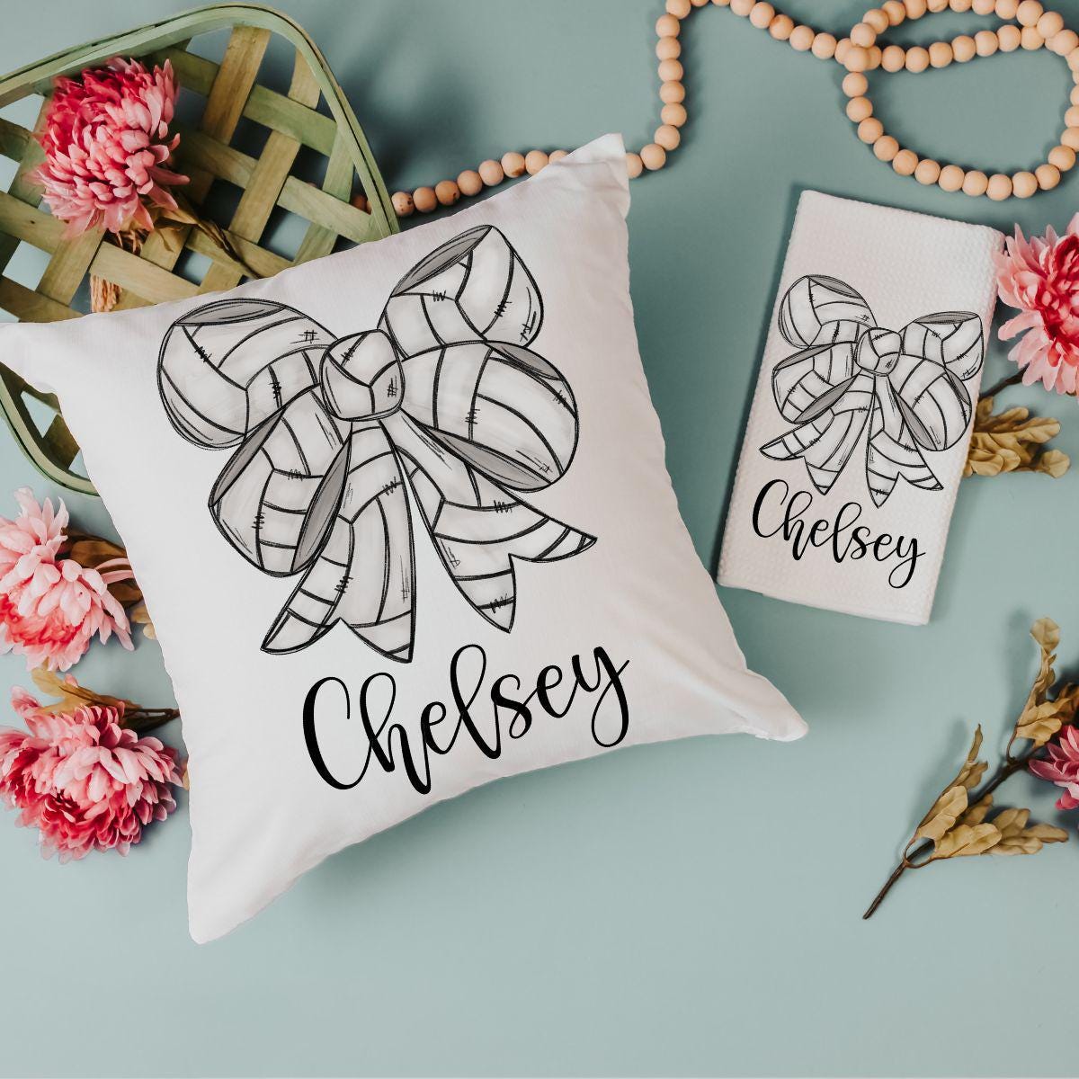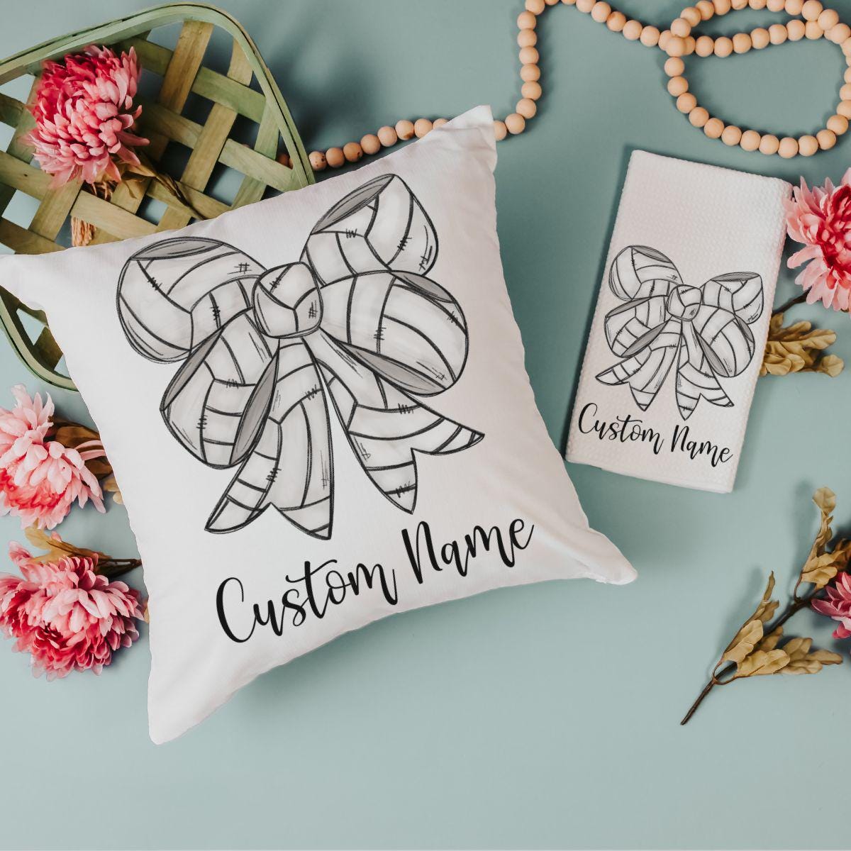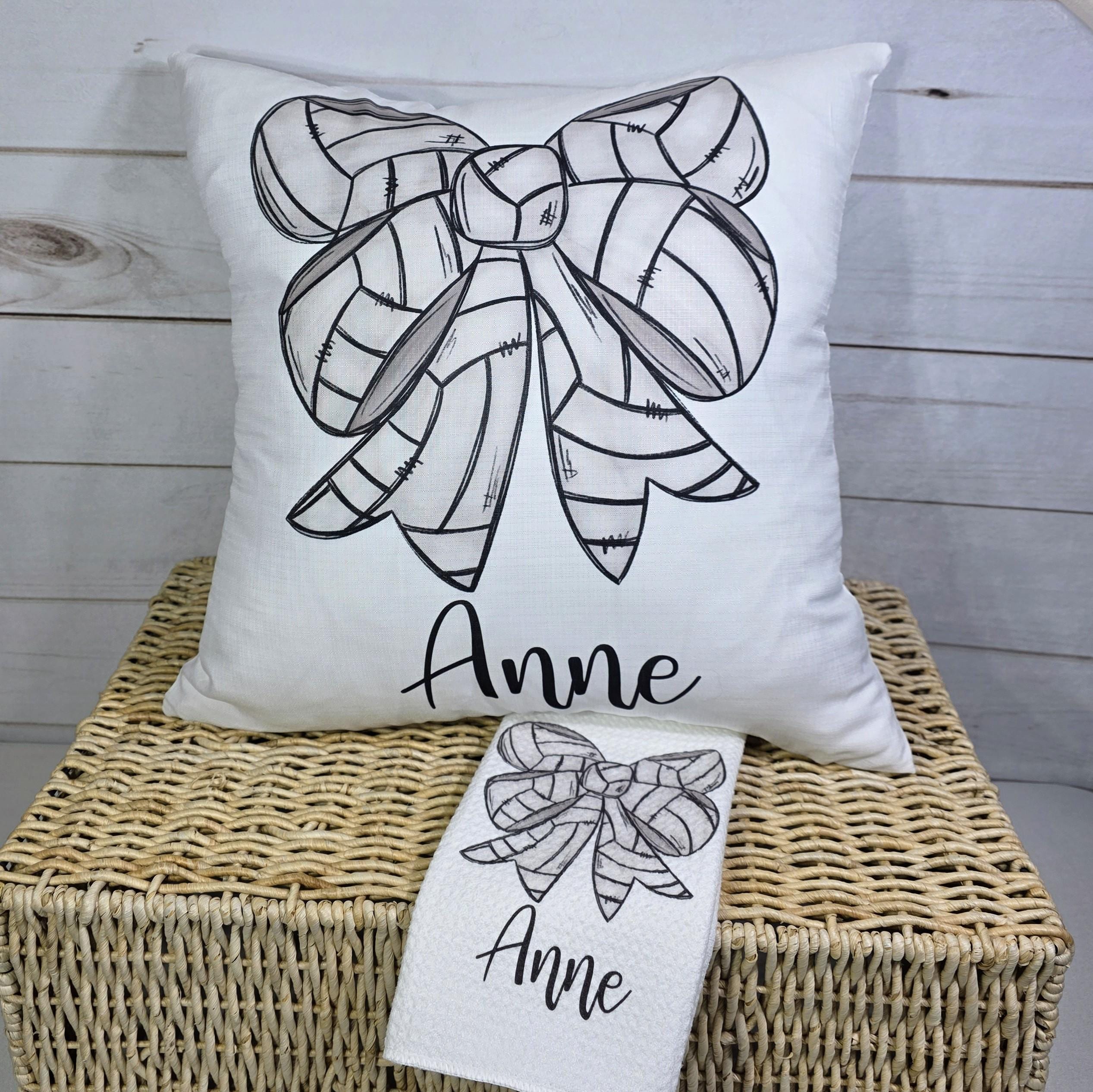 Celebrate your volleyball star with a personalized volleyball coquette bow pillow, towel, and ornament set. It's perfect for teen girls and volleyball senior. Each item can be purchased separately or as a gift set—ideal for senior gifts or a college care package.