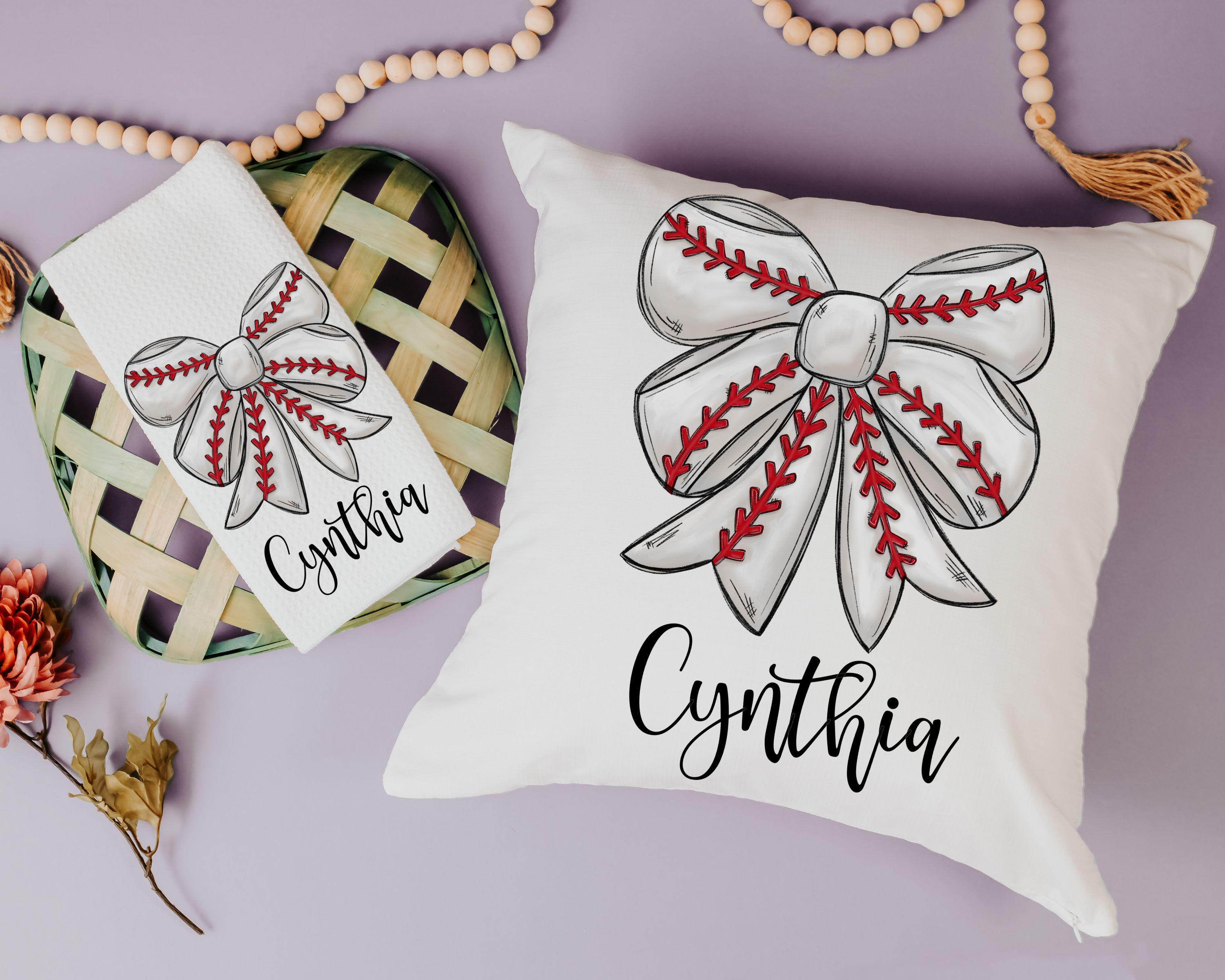 Add a personalized touch to your home with our baseball coquette towels, customized with a name. These baseball towels are perfect for bathroom decor or as kitchen decor. Ideal as thoughtful baseball mom gifts or a fun baseball sister rally towel, these hand towels make a great addition to any baseball-loving home. Purchase the items separately or as a complete gift set with a matching towel, ornament, and pillow. Perfect for any baseball girl or baseball girlfriend!