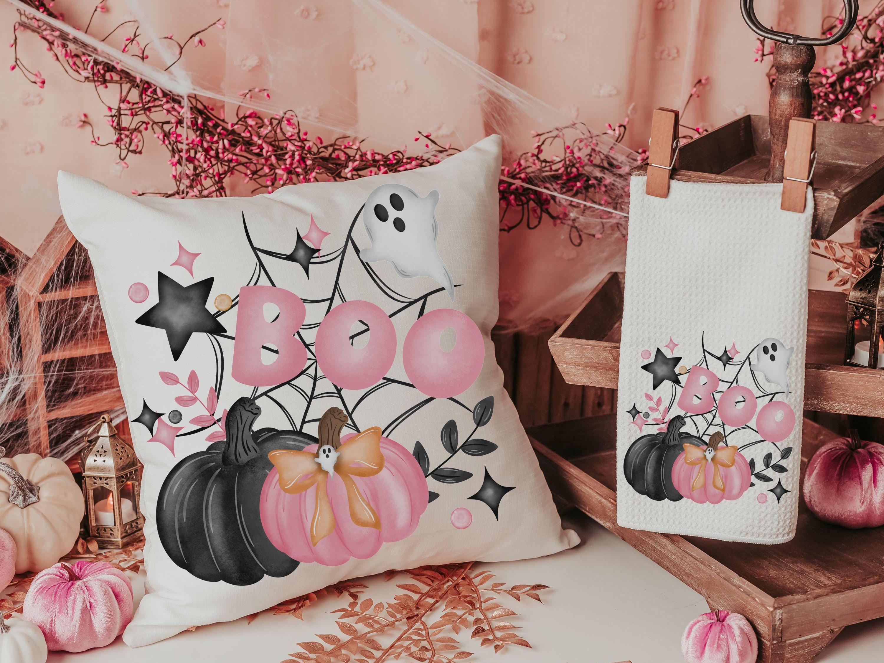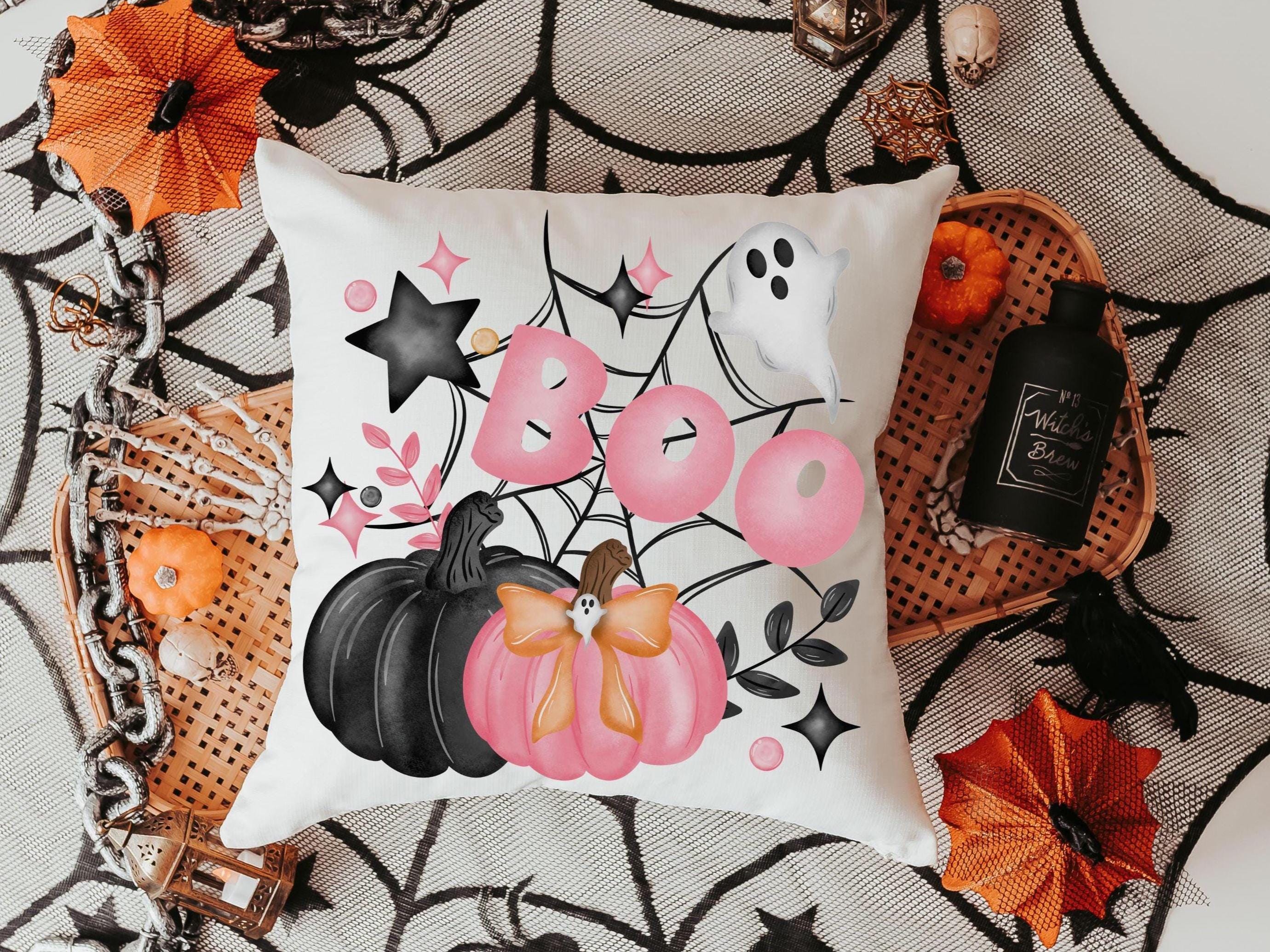 coquette Halloween throw pillow covers 18 x 18, boo basket stuffers for adults, cute Halloween gifts for women pink pumpkin pillow for couch