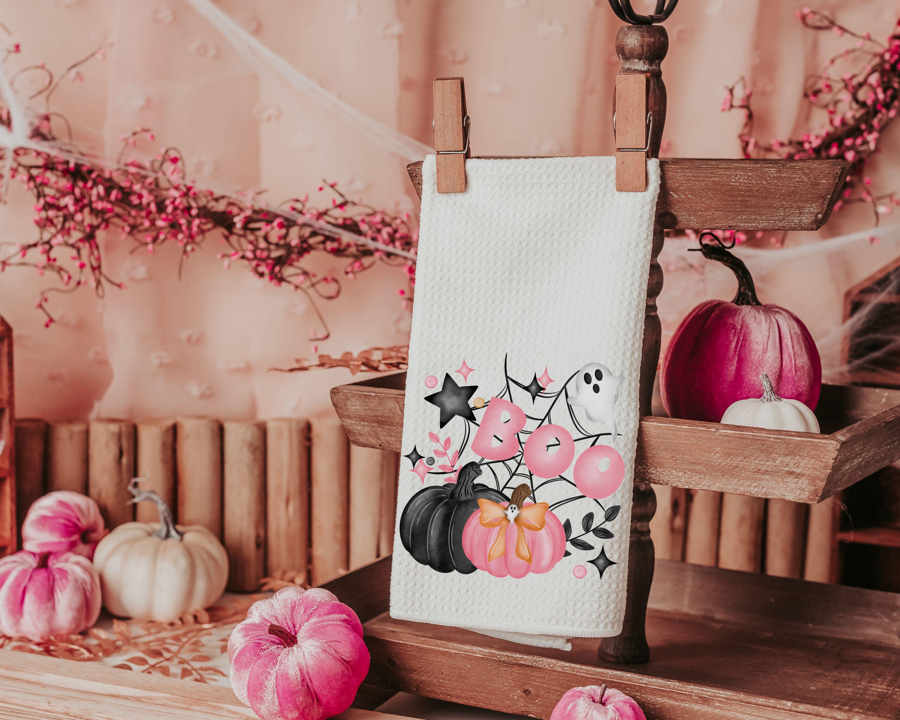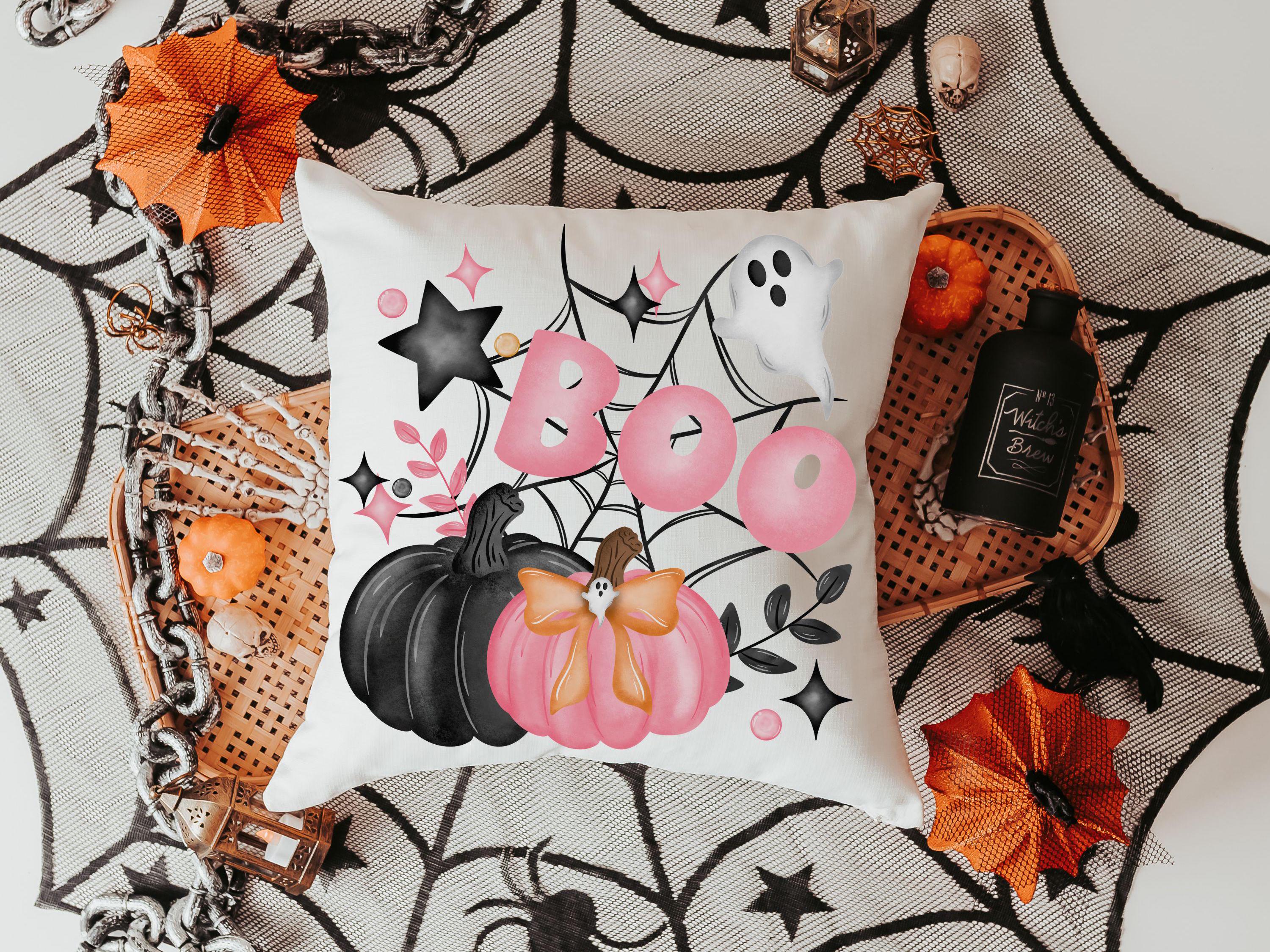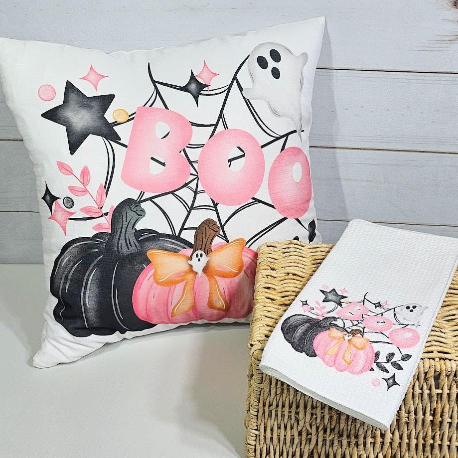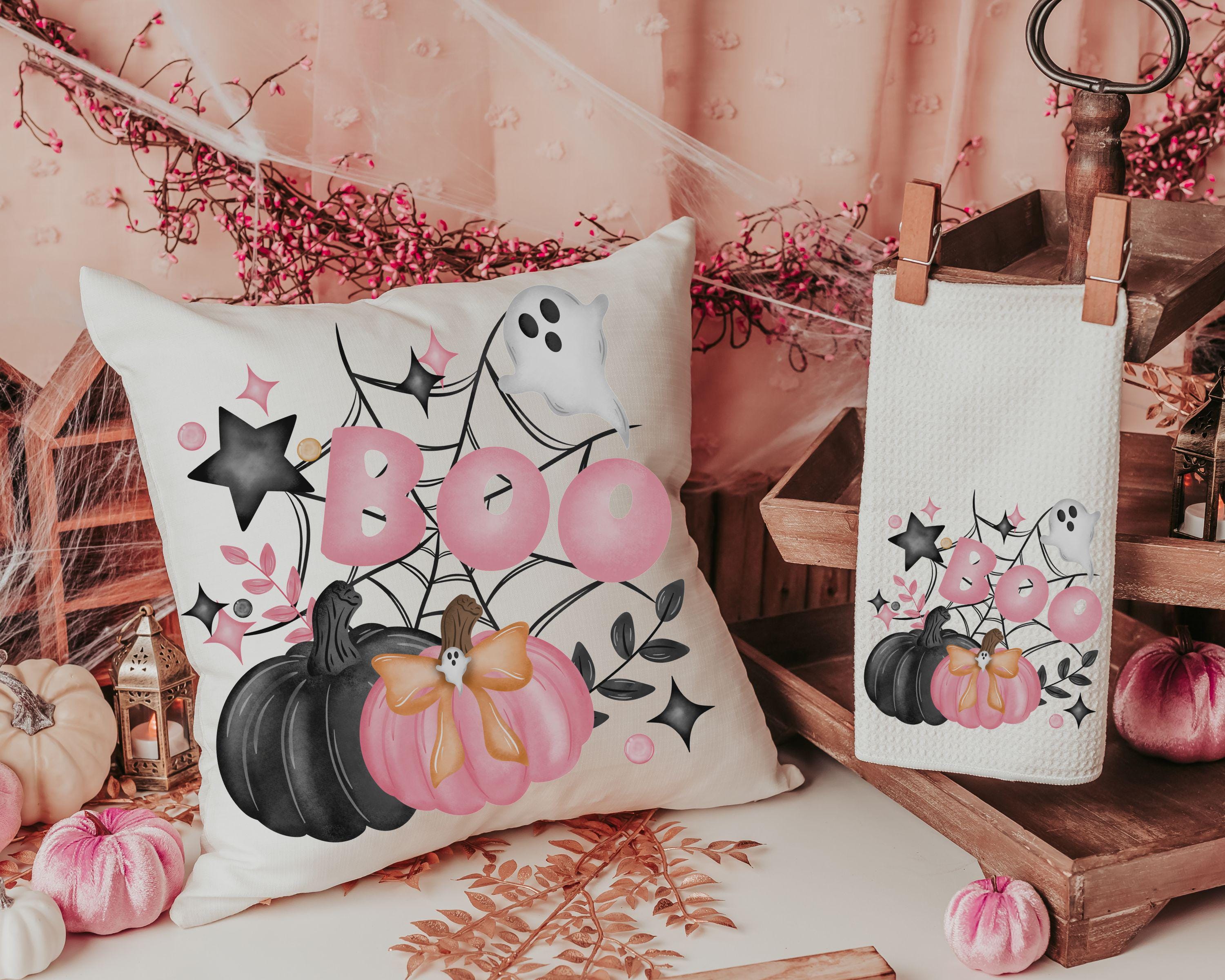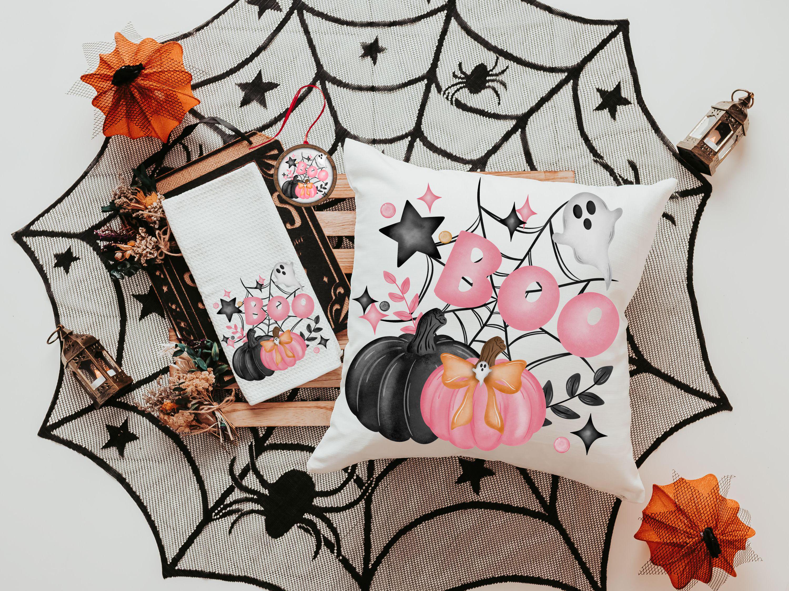 girly goth coquette Halloween throw pillow covers 18 x 18, pink pumpkin kitchen towels, boo basket stuffers for adults, cute Halloween decor