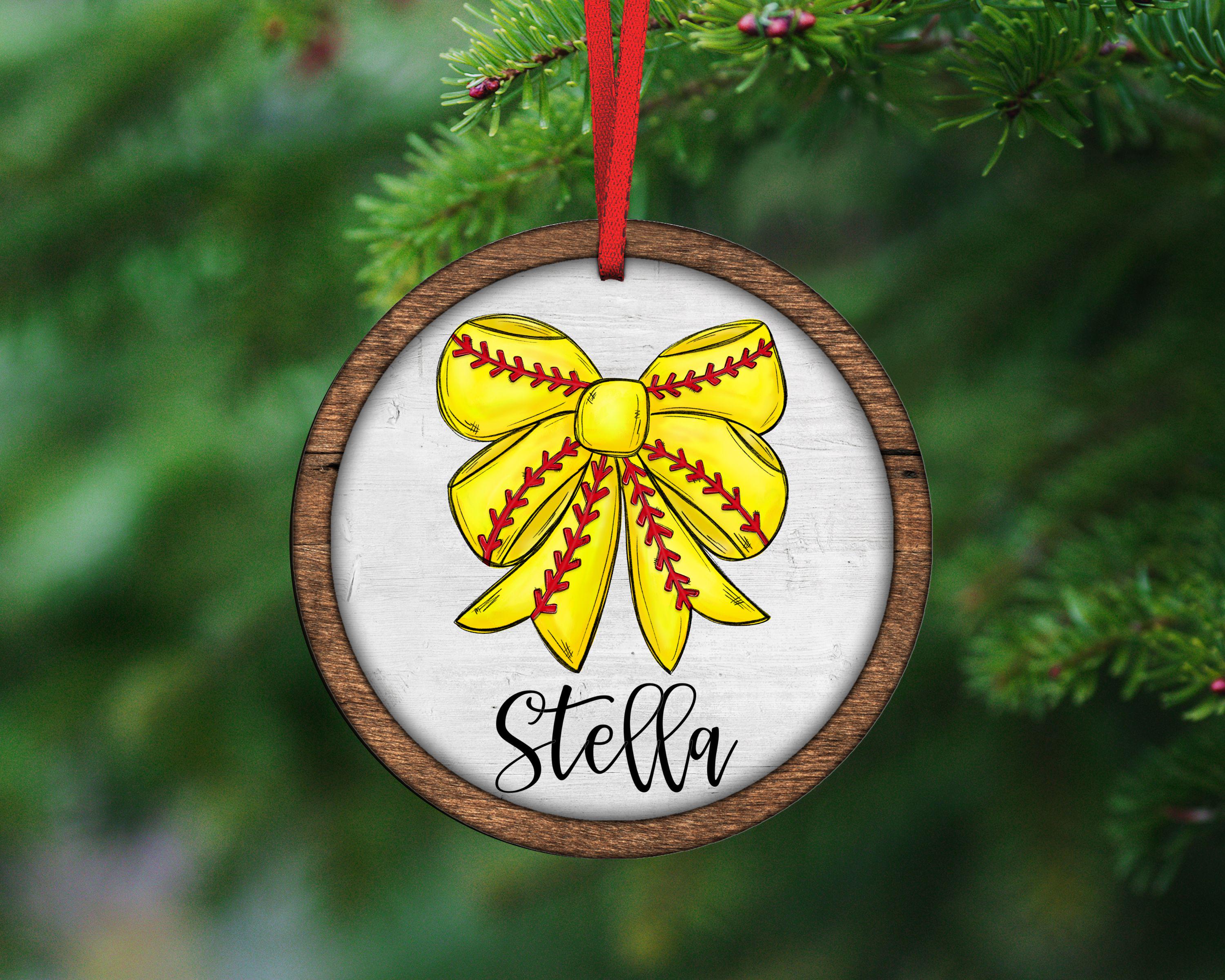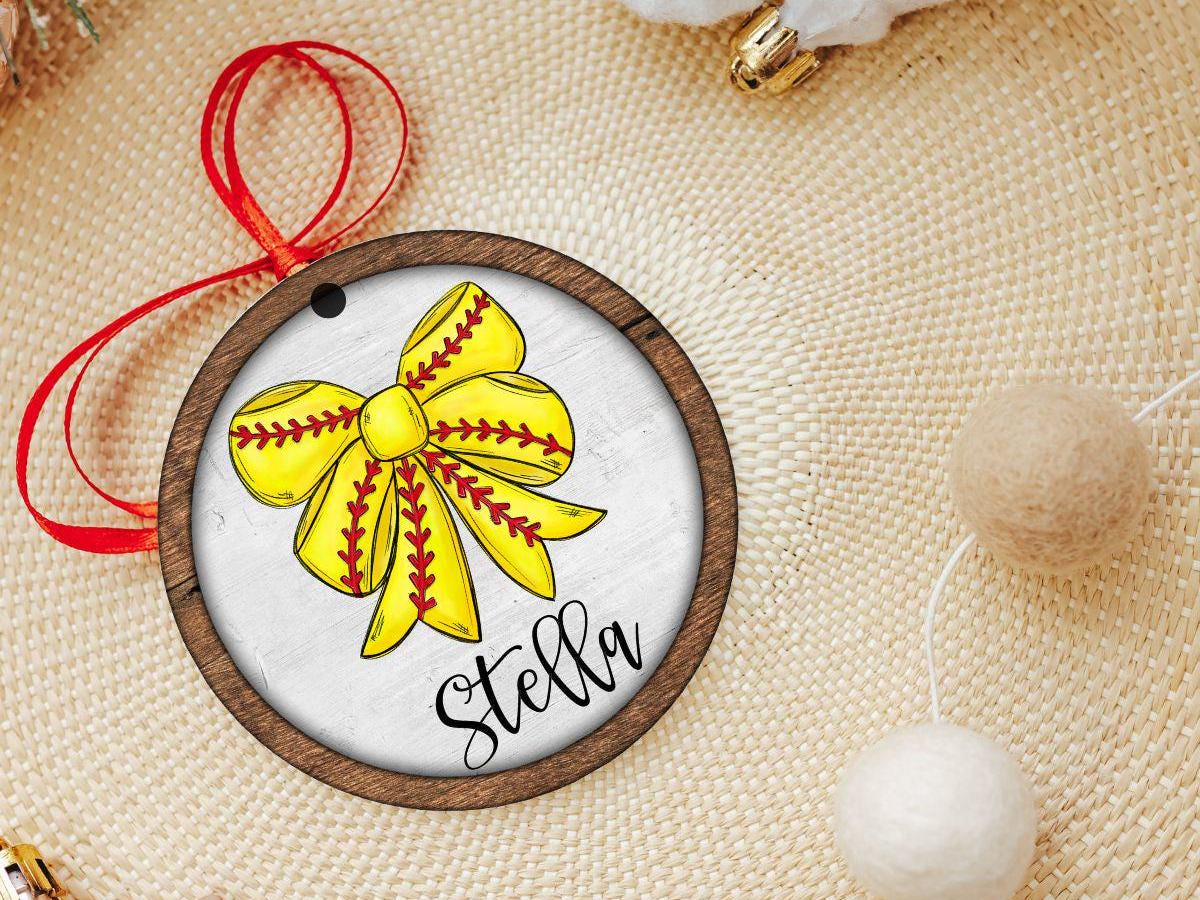 Personalized with a name, these softball coquette bow throw pillows, ornaments and matching kitchen towels are a cute and thoughtful gift. They are also perfect for both bed and kitchen decor. You can purchase the ornament, towel, and throw pillow separately or as a complete gift set.