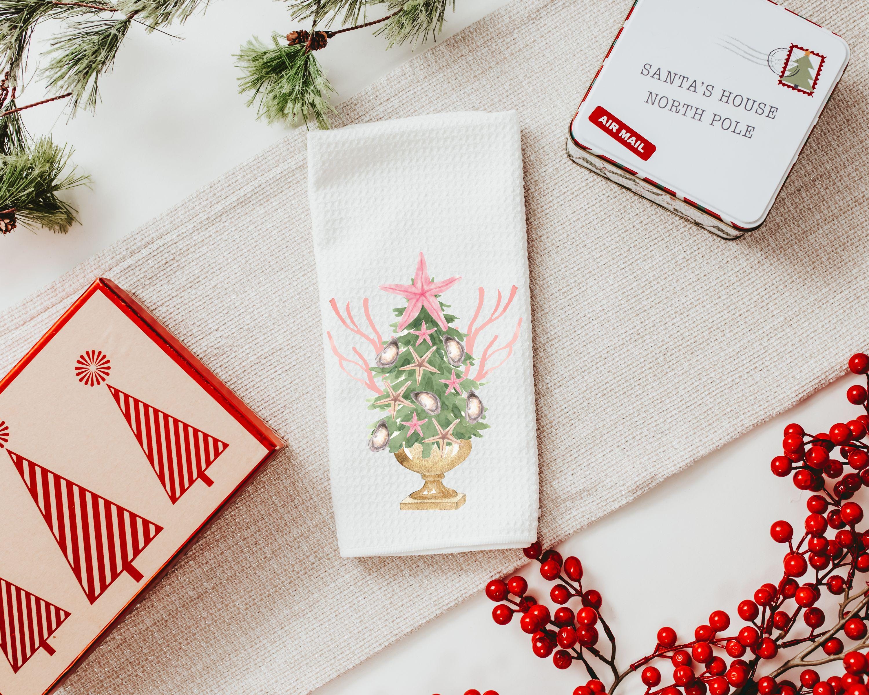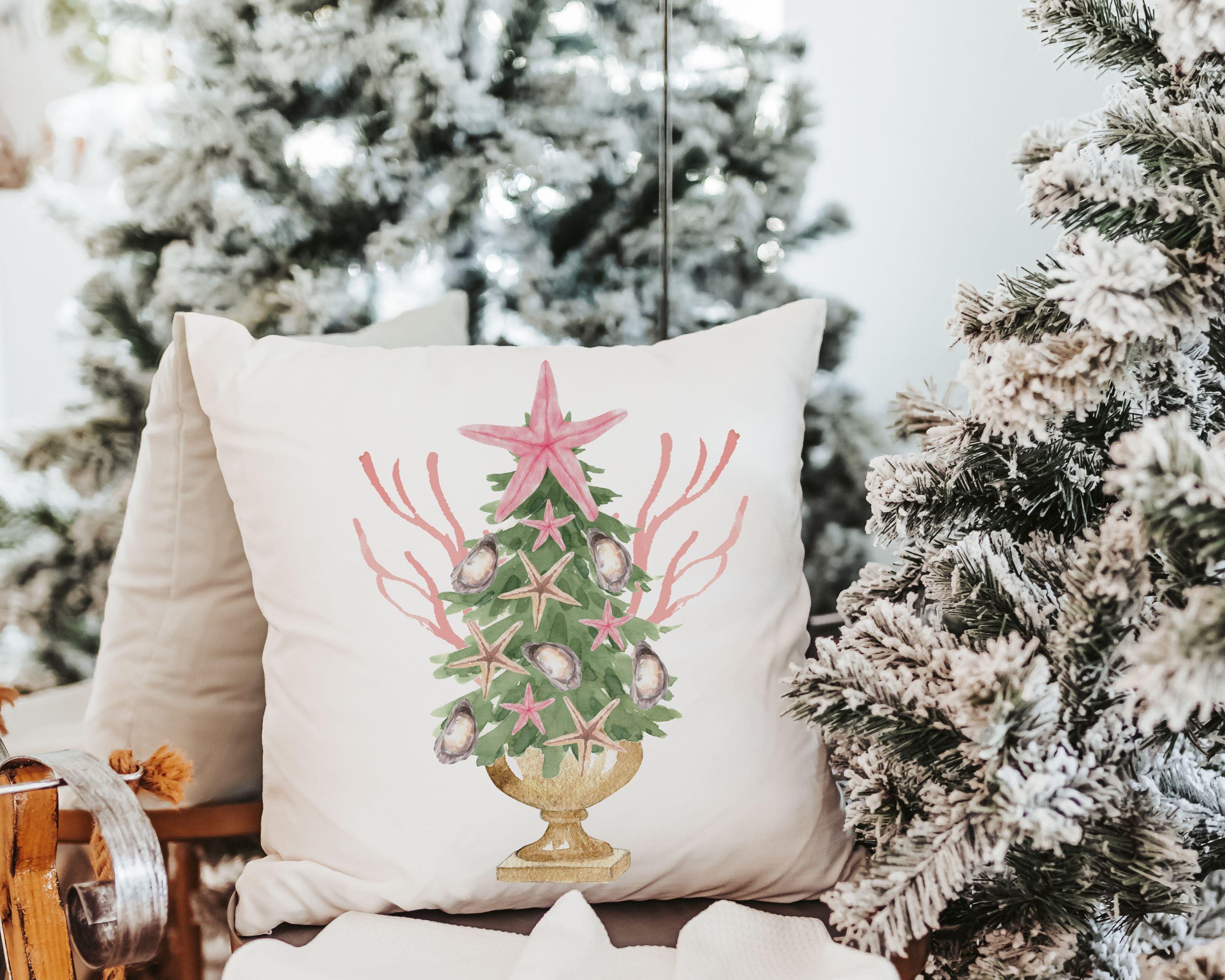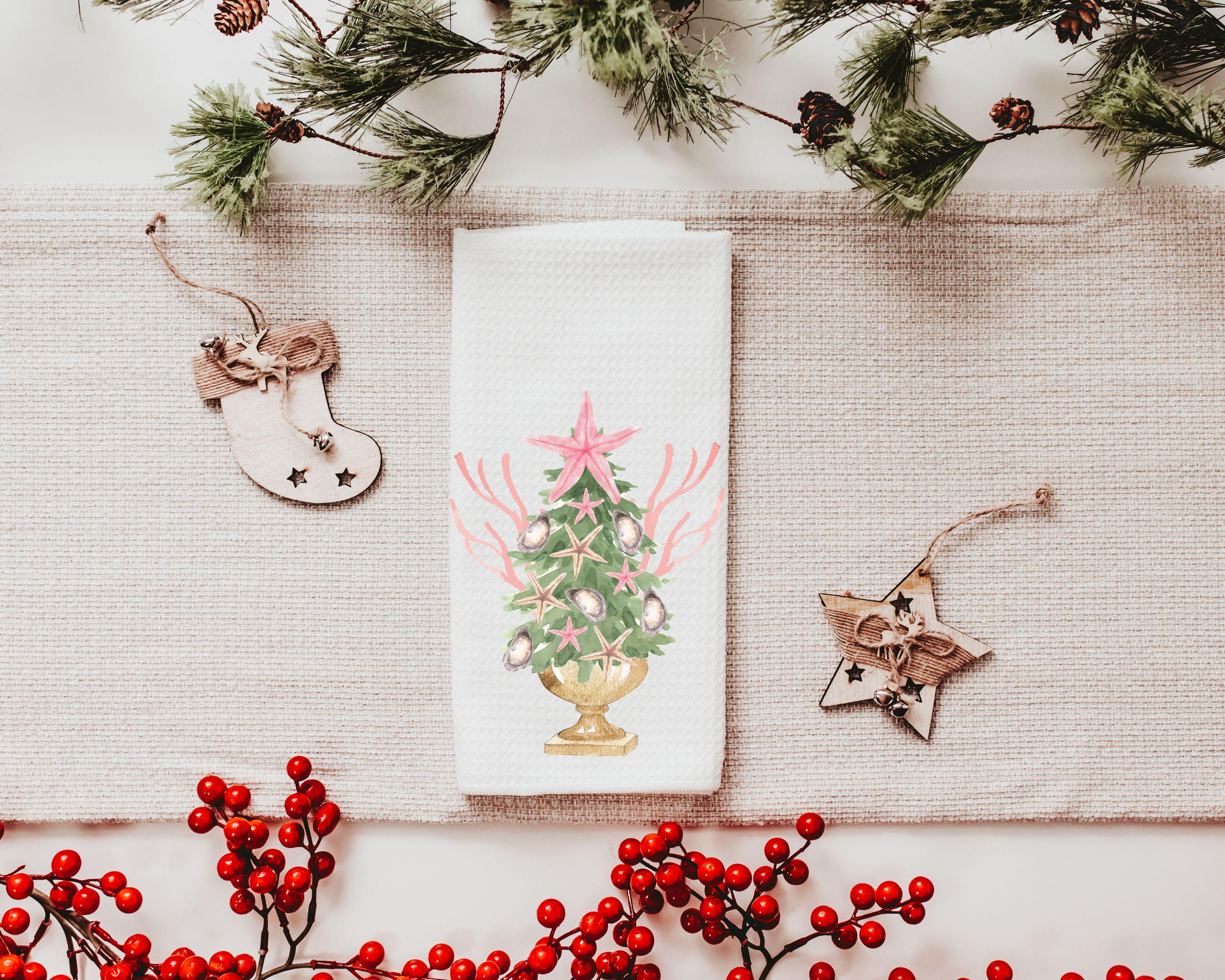 coastal Christmas tree throw pillows for couch pink nautical Christmas kitchen towels for winter, holiday hosting decor home decor gift