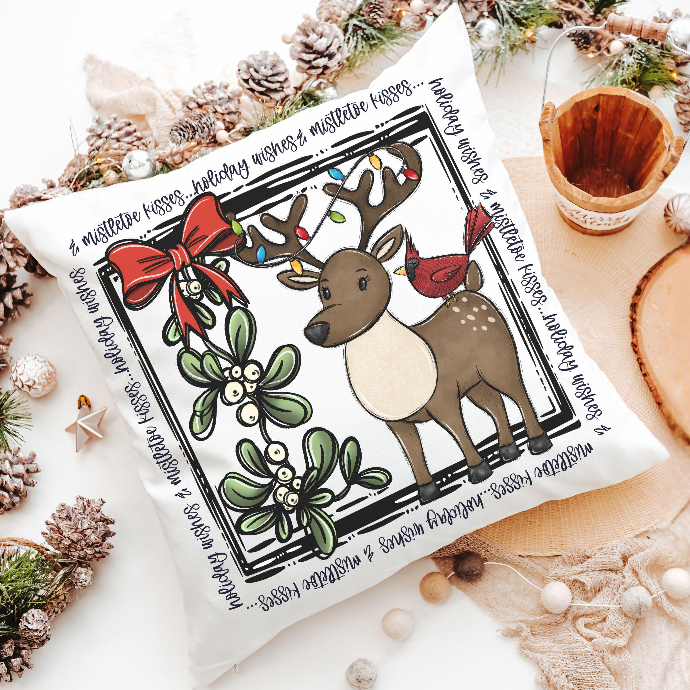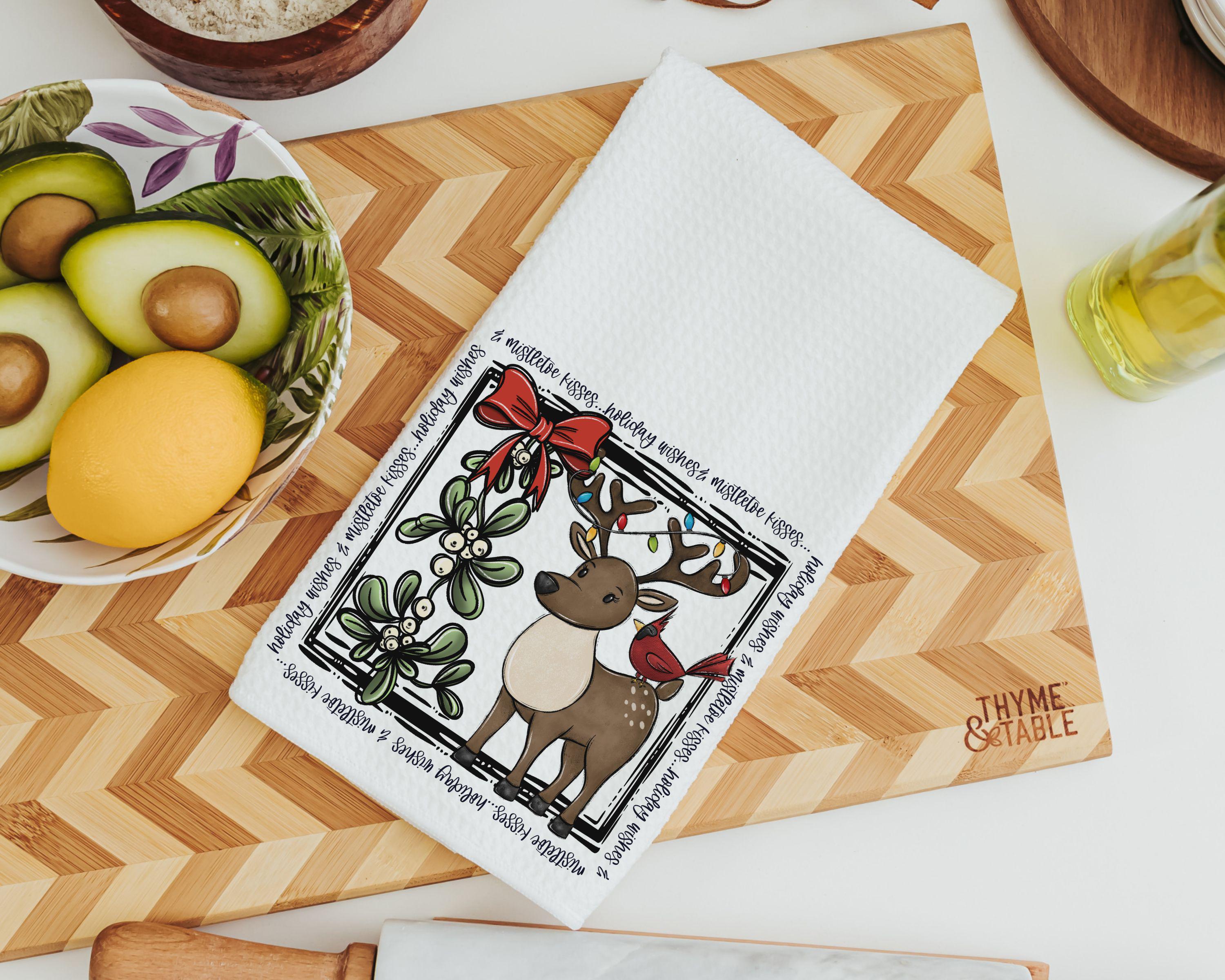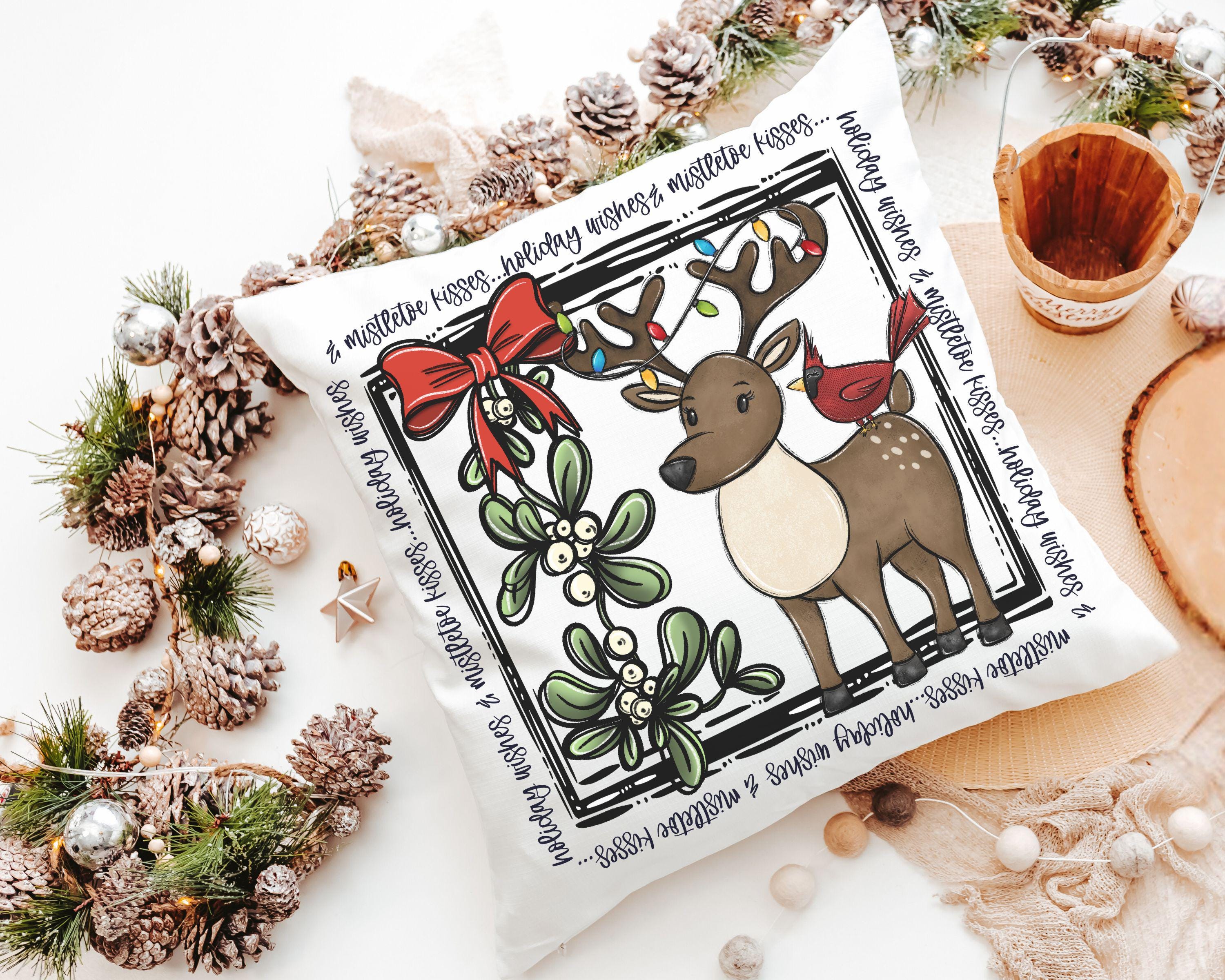 holiday wishes cute reindeer throw pillow for couch, mistletoe kisses Christmas kitchen towels, woodland Christmas hostess gifts for women