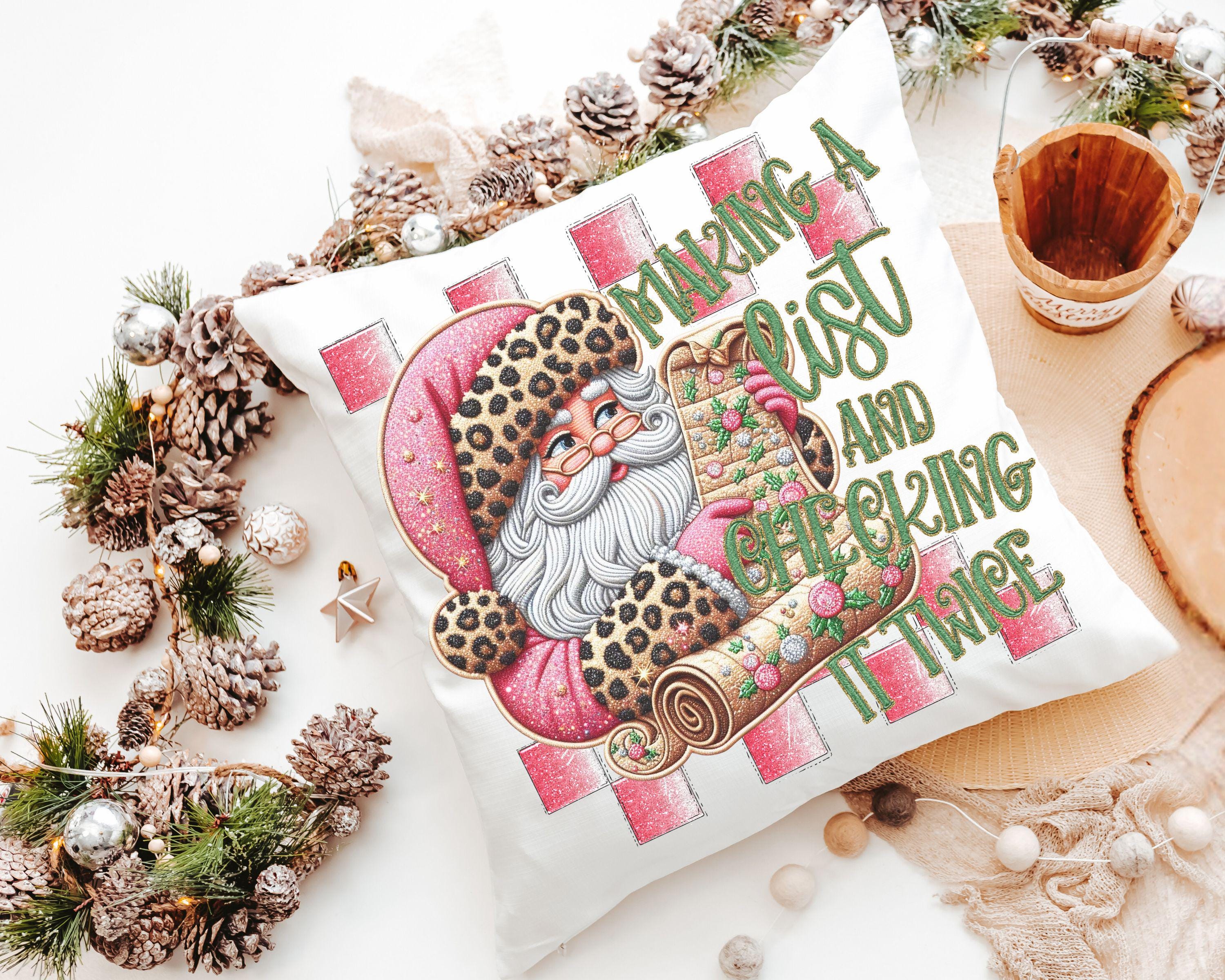 making a list and checking it twice pink Christmas throw pillows for couch, leopard print Santa Claus kitchen towels, sage green Christmas