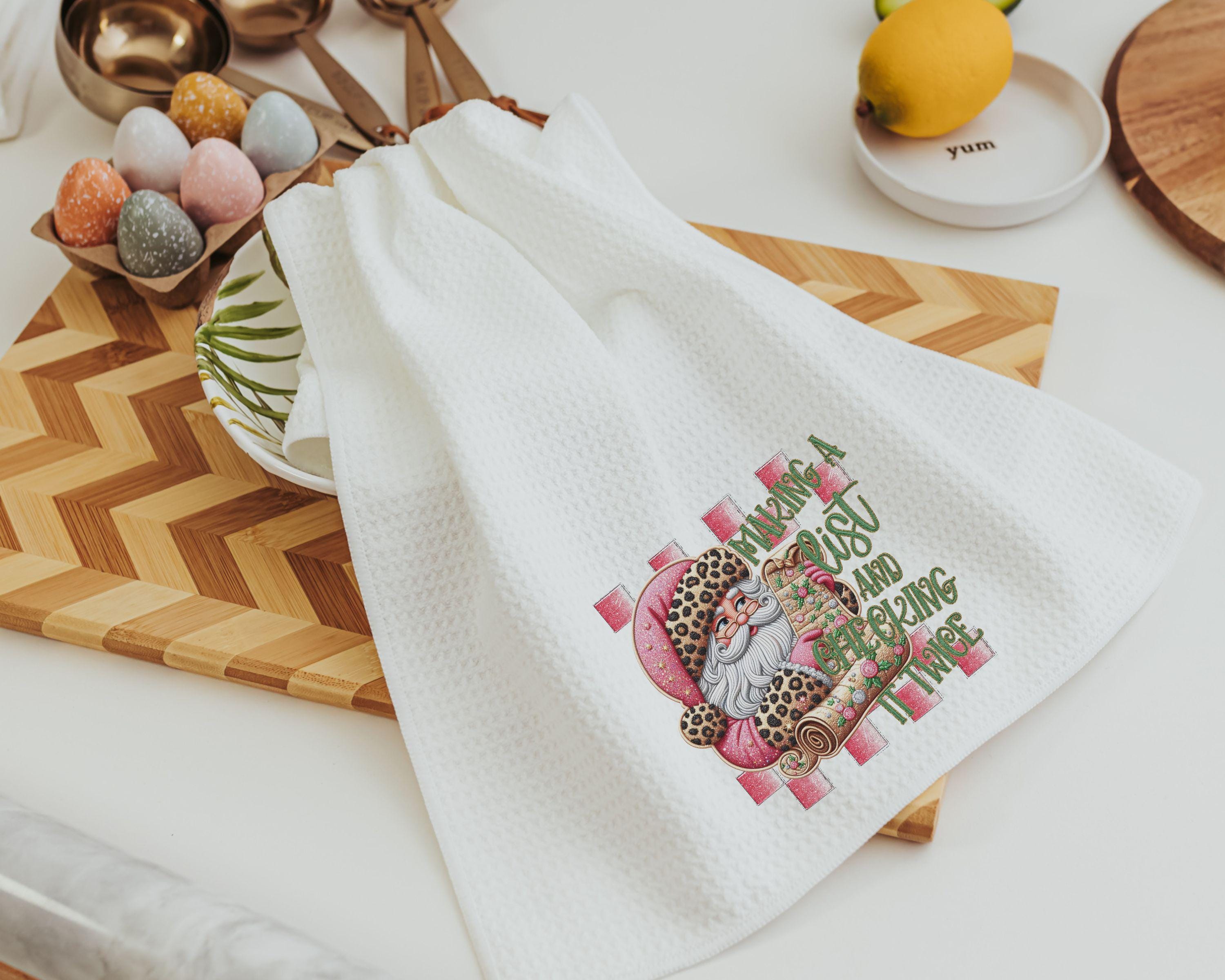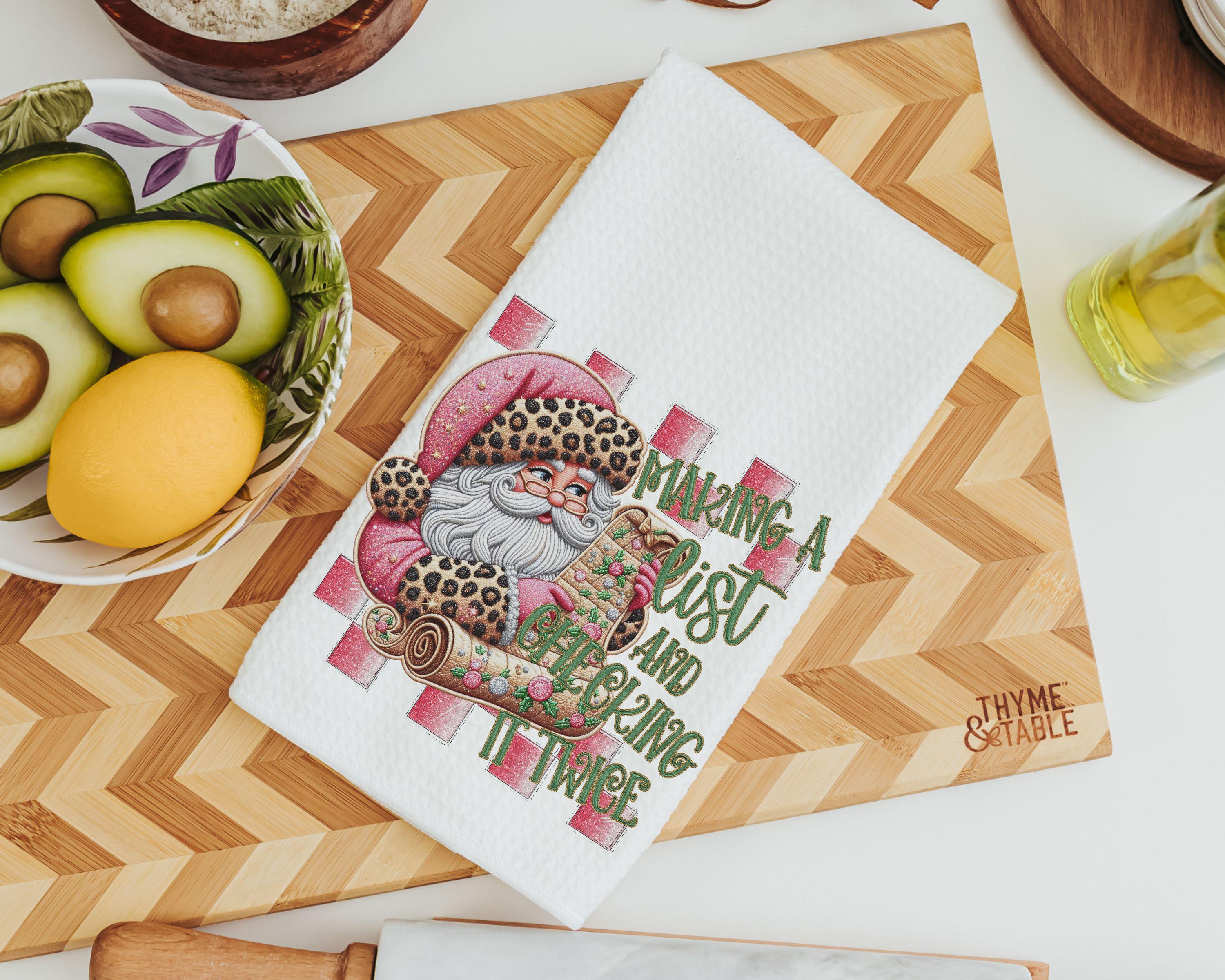 Bring festive fun to your home with our "Making a List and Checking It Twice" leopard print Santa Clause Pink Christmas Throw Pillows for the couch, and paired with matching kitchen towels. These stylish pieces are perfect for adding a touch of sage green to your Christmas decor. Ideal as secret Santa gifts for coworkers or thoughtful Christmas gifts for new homeowners, you can purchase the pillow and matching towel separately or as a set for a coordinated holiday look!
