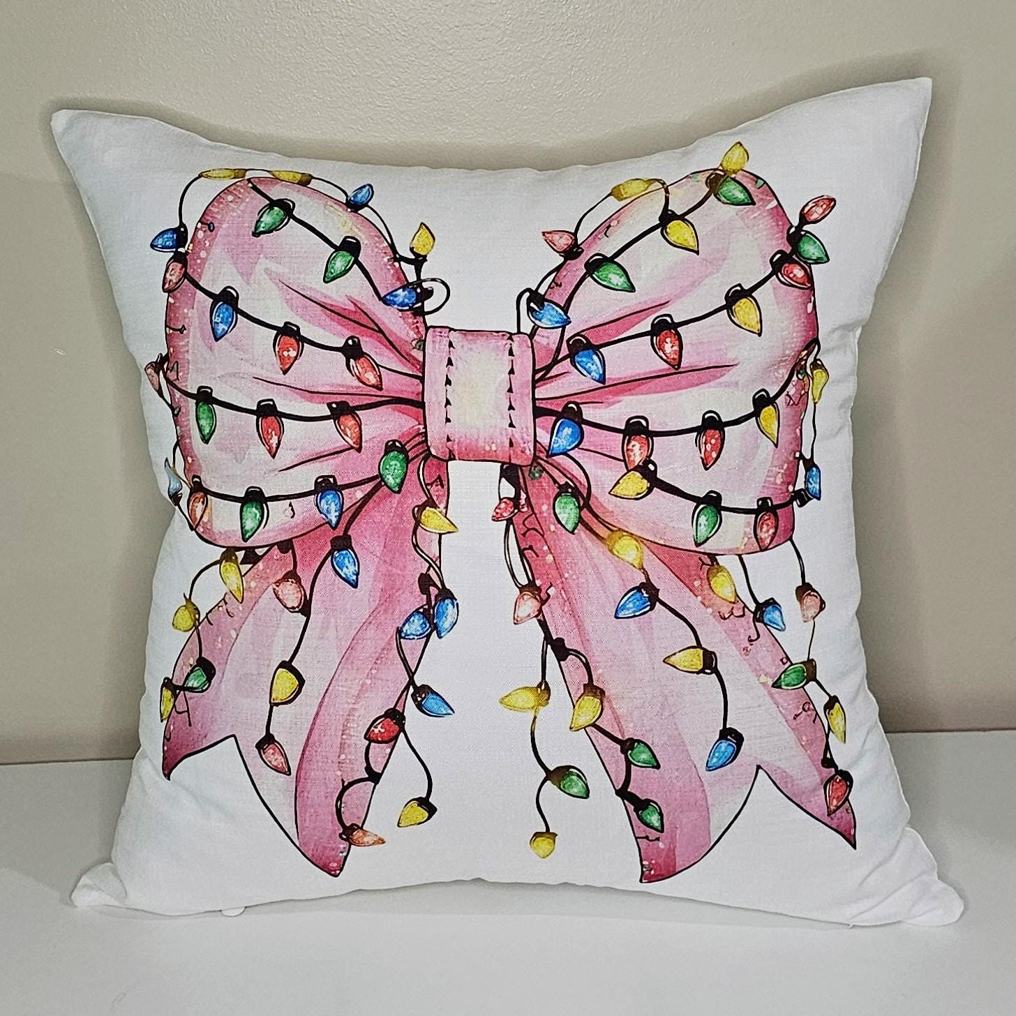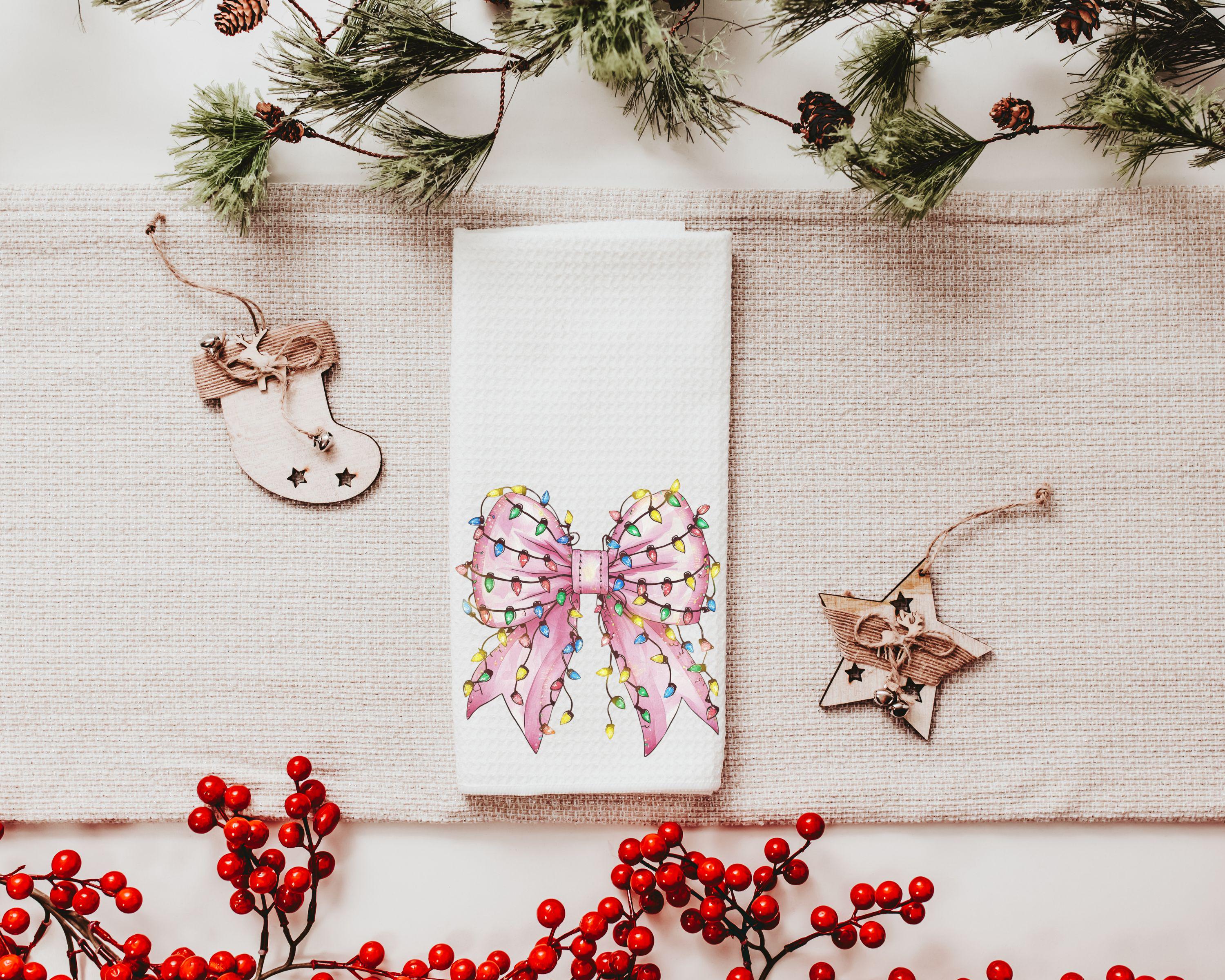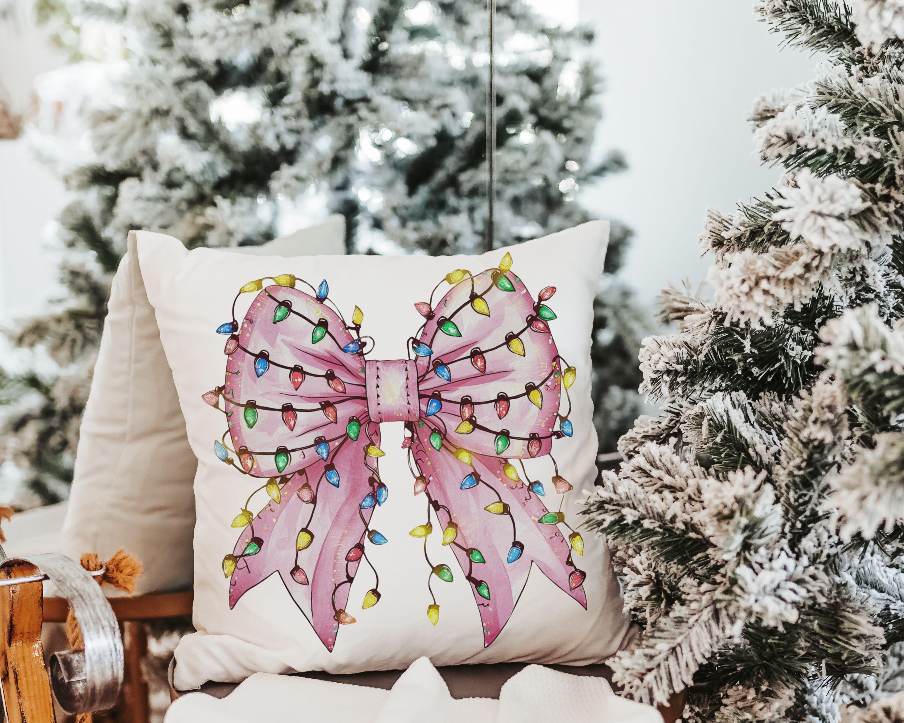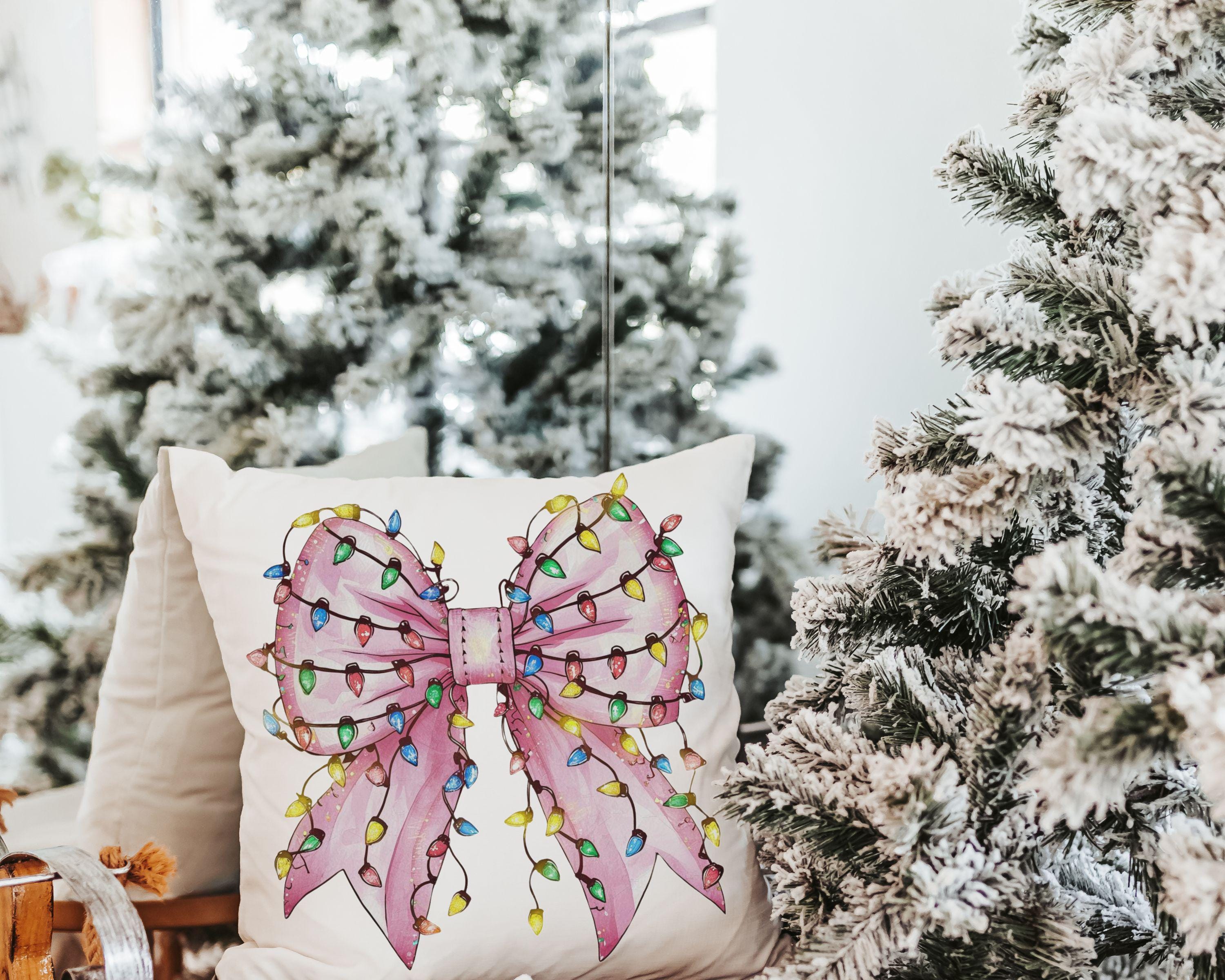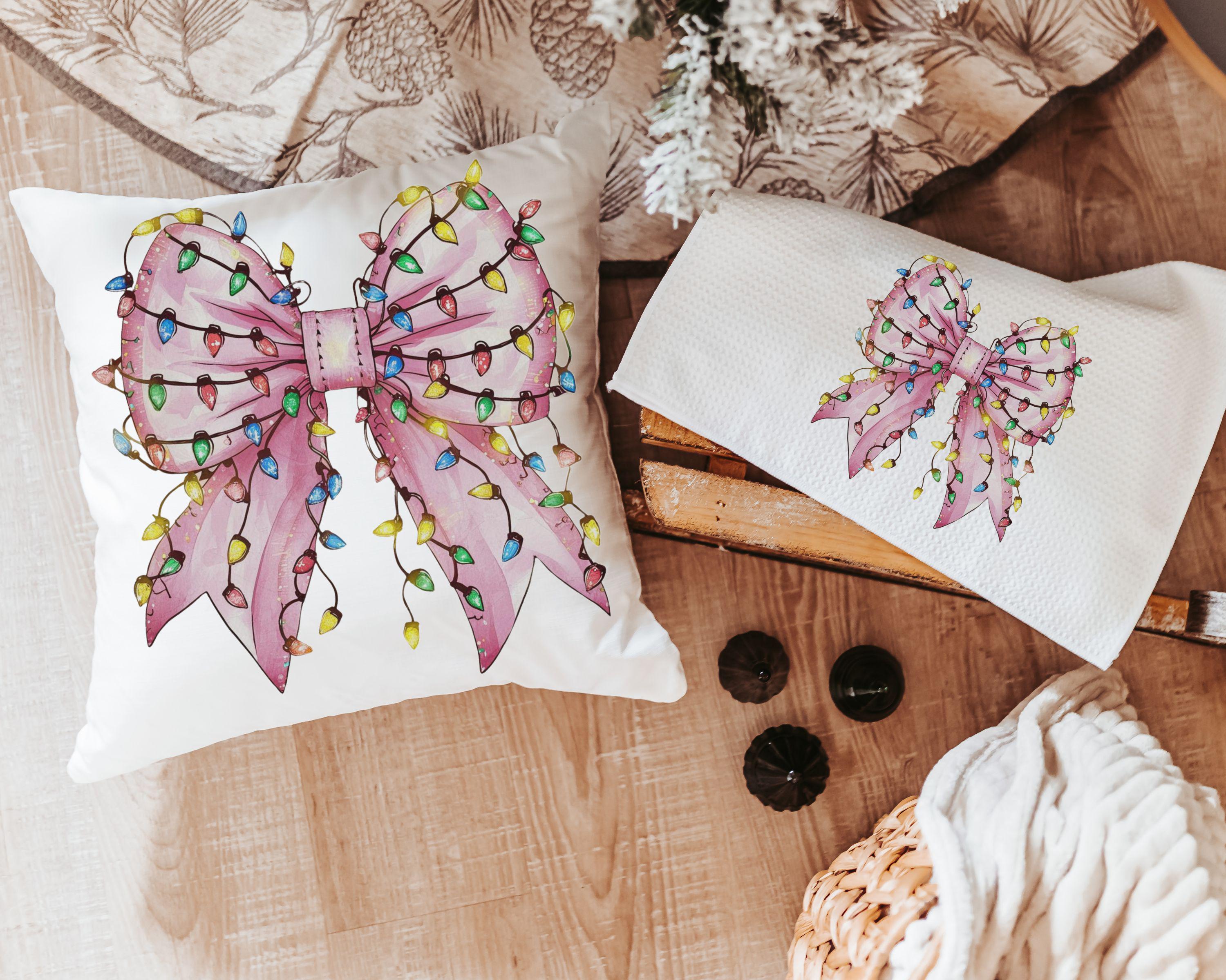 bow Christmas lights cute Christmas throw pillows for couch, coquette Christmas kitchen towels for friends, pink Christmas decor for home