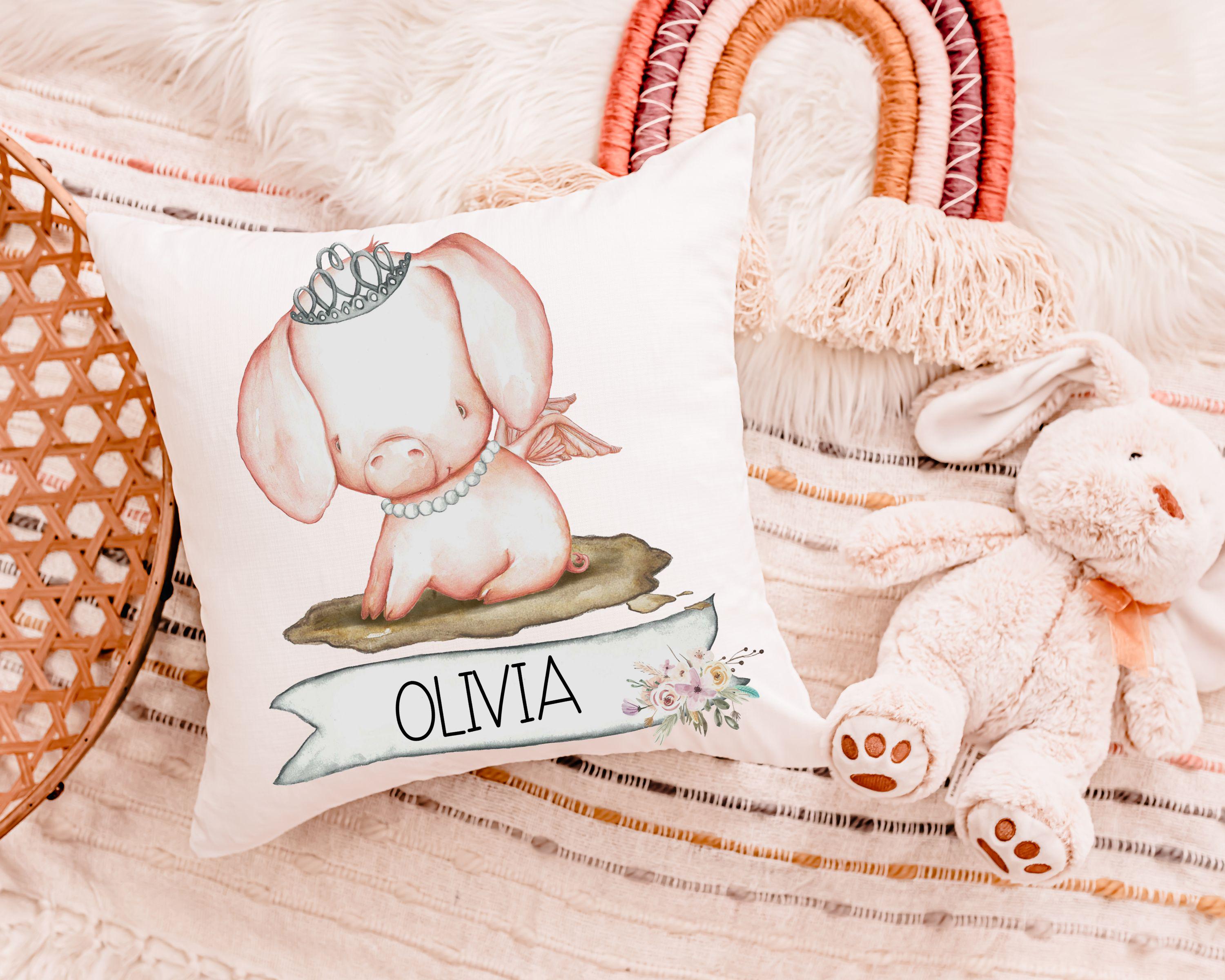 Add charm to your little girl's space with a personalized pig princess throw pillow. It is ideal for a little girl's reading nook or farm nursery decor. This adorable name pillow is a thoughtful baby gift and a cute addition to her room celebrating her love for all things farm and princess. It’s a keepsake she’ll adore for years to come.