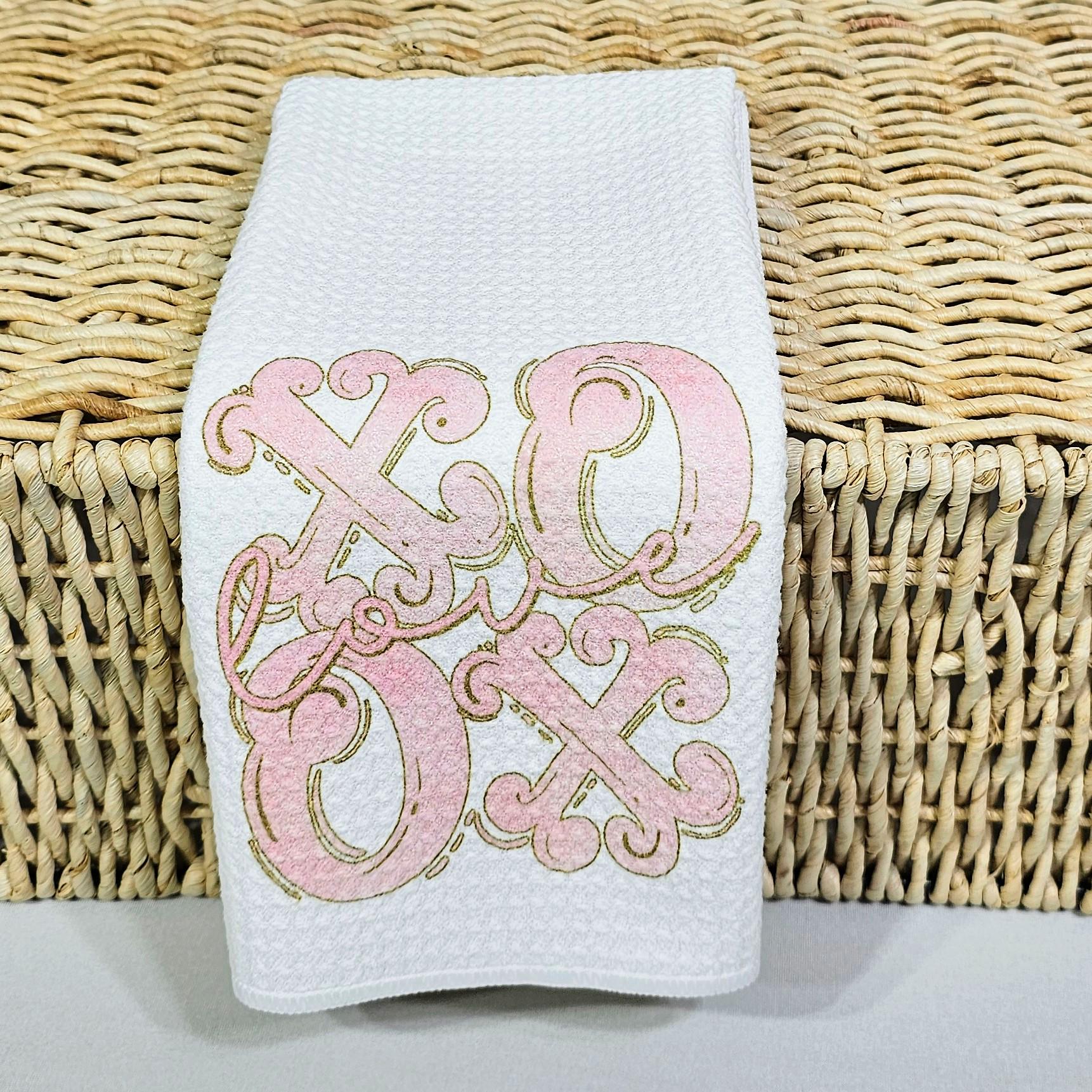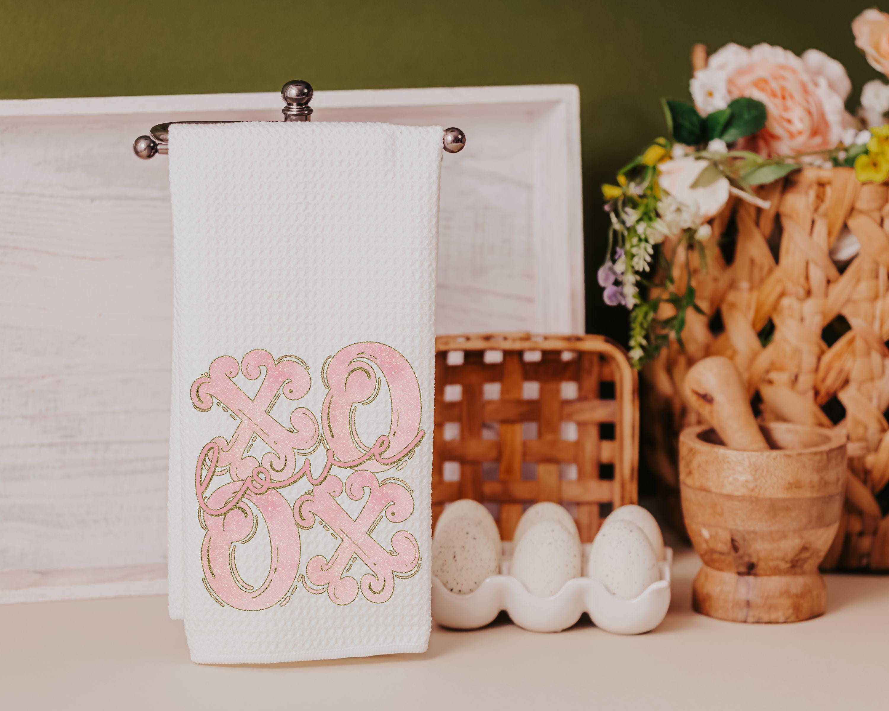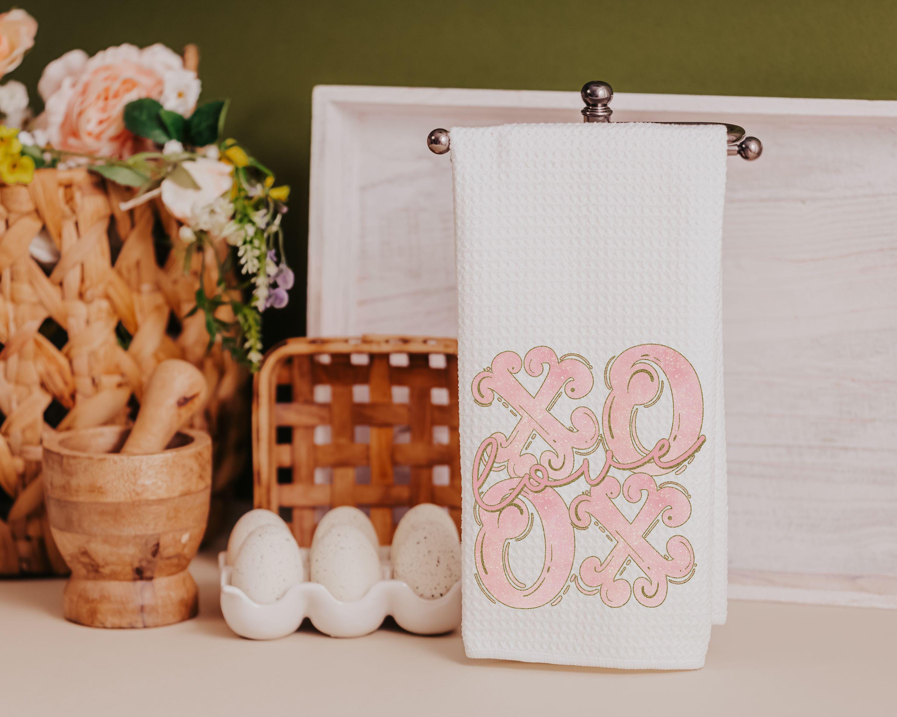 xo Valentines kitchen towels for Mom, blush pink coquette Valentines hand towels for bathroom, hugs and kisses Valentines gifts for couples